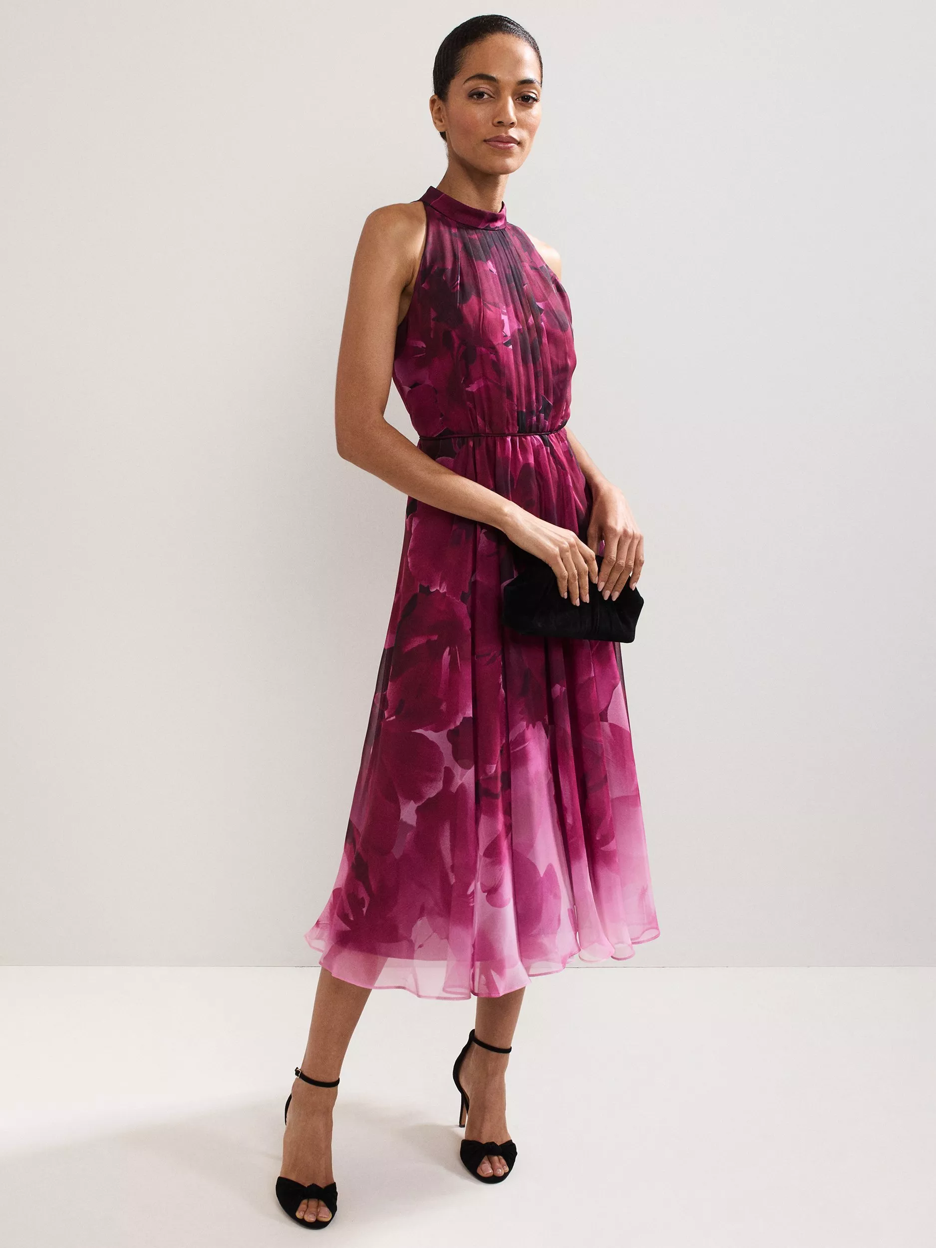 When a timeless silhouette meets a modern floral print, you get this striking halterneck dress. Featuring ombre shades of vibrant berry that highlight the natural movement of the skirt. Add elegance by styling with classic heels and a simple clutch.