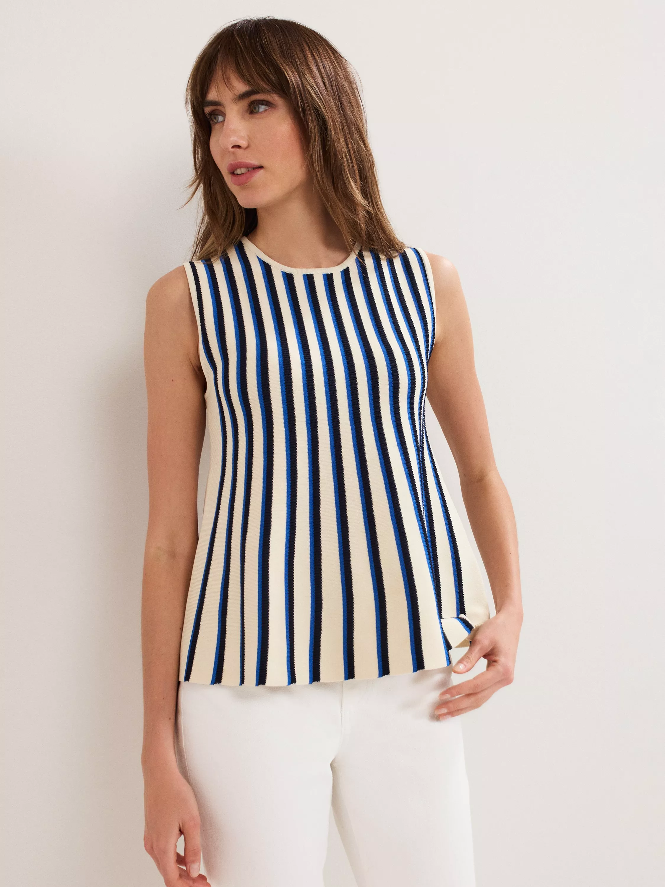 Your new wardrobe go-to. Crafted in a compact knit and featuring a soft peplum, this sleeveless top draws you in with its contemporary stripe pattern. Perfect for pairing with your everyday jeans and skirts.