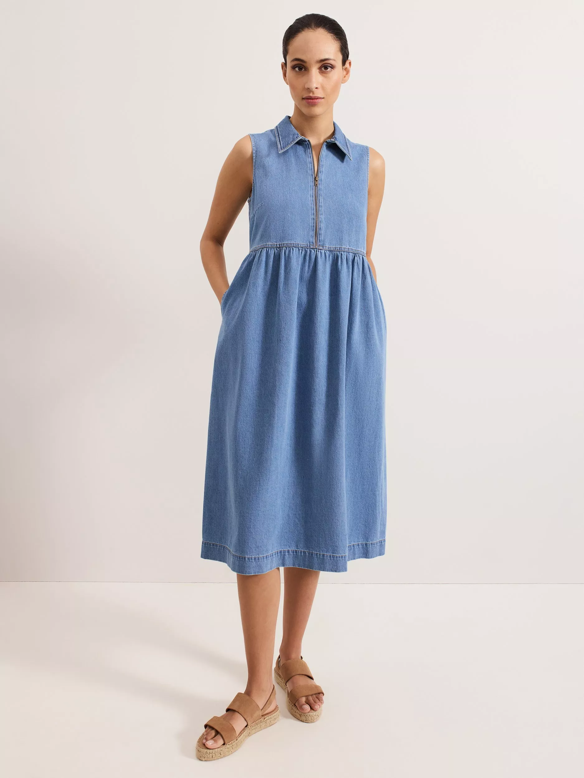 Every wardrobe needs a denim dress. Structured with a collar and zip detail on the bodice it flows through to a soft midi skirt, updated with concealed pockets. Truly versatile style for summer with a pair of sandals or layered over a knit for colder days.