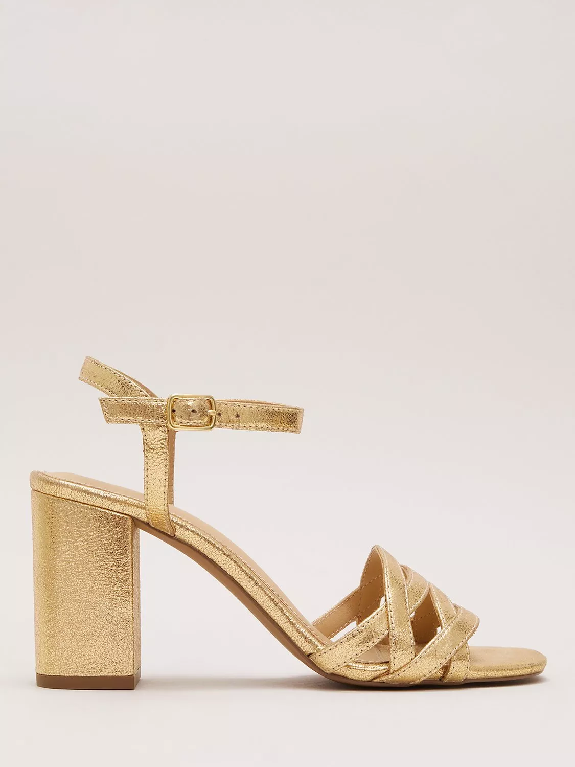 The perfect statement shoes for your next big event. With comfortable block heels and overlapping strap detail across the toes these heels guarantee a stand-out look.