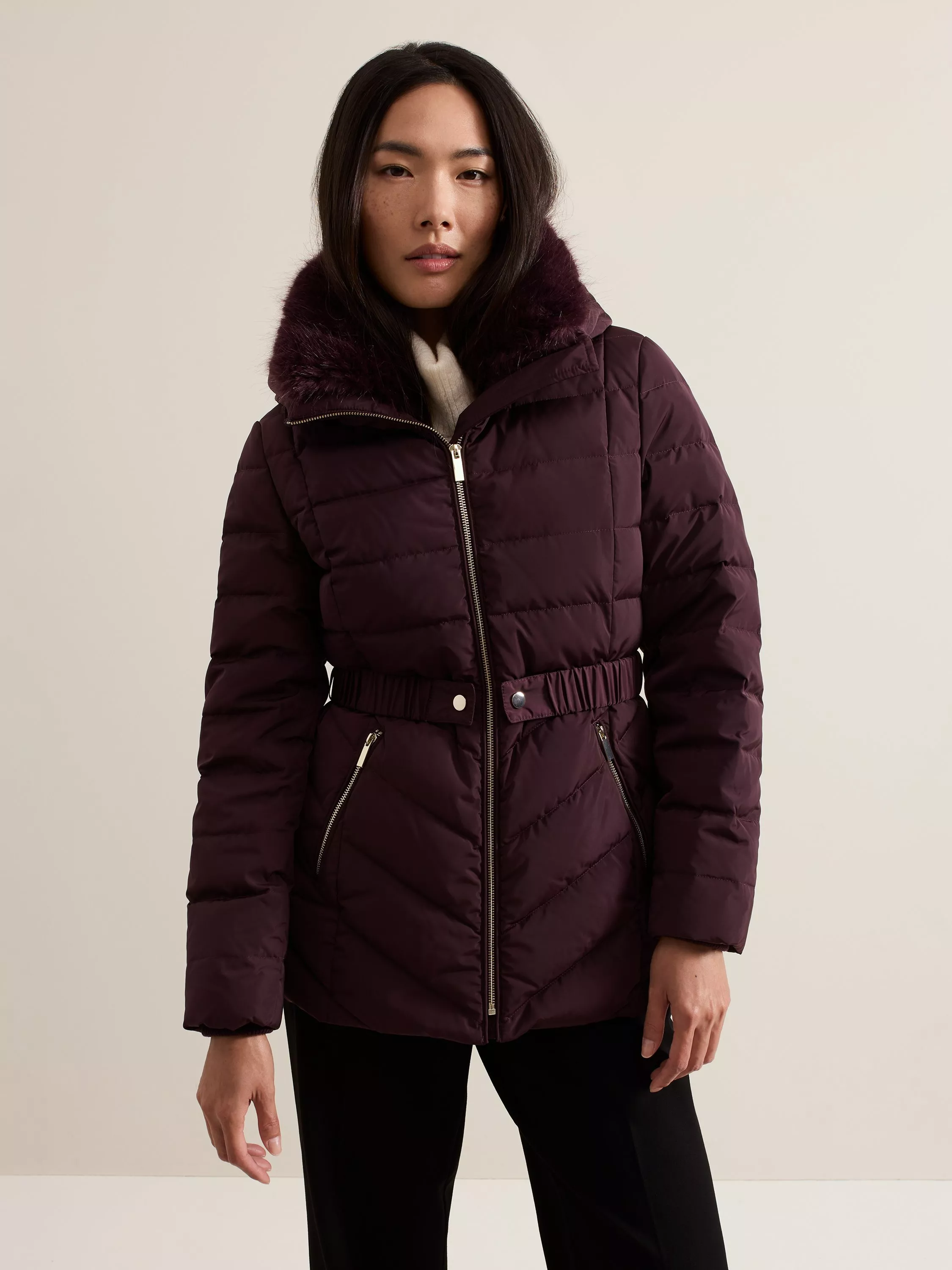 The Bobbie Short Puffer Coat from Phase Eight is designed in a warm quilted fabric with exposed zips and tab details on the waist. A ruched belt with metallic buckle has been added for extra waist definition. This shower proof style is finished with two zip pockets and a detachable faux fur collar on the hood for even more warmth.