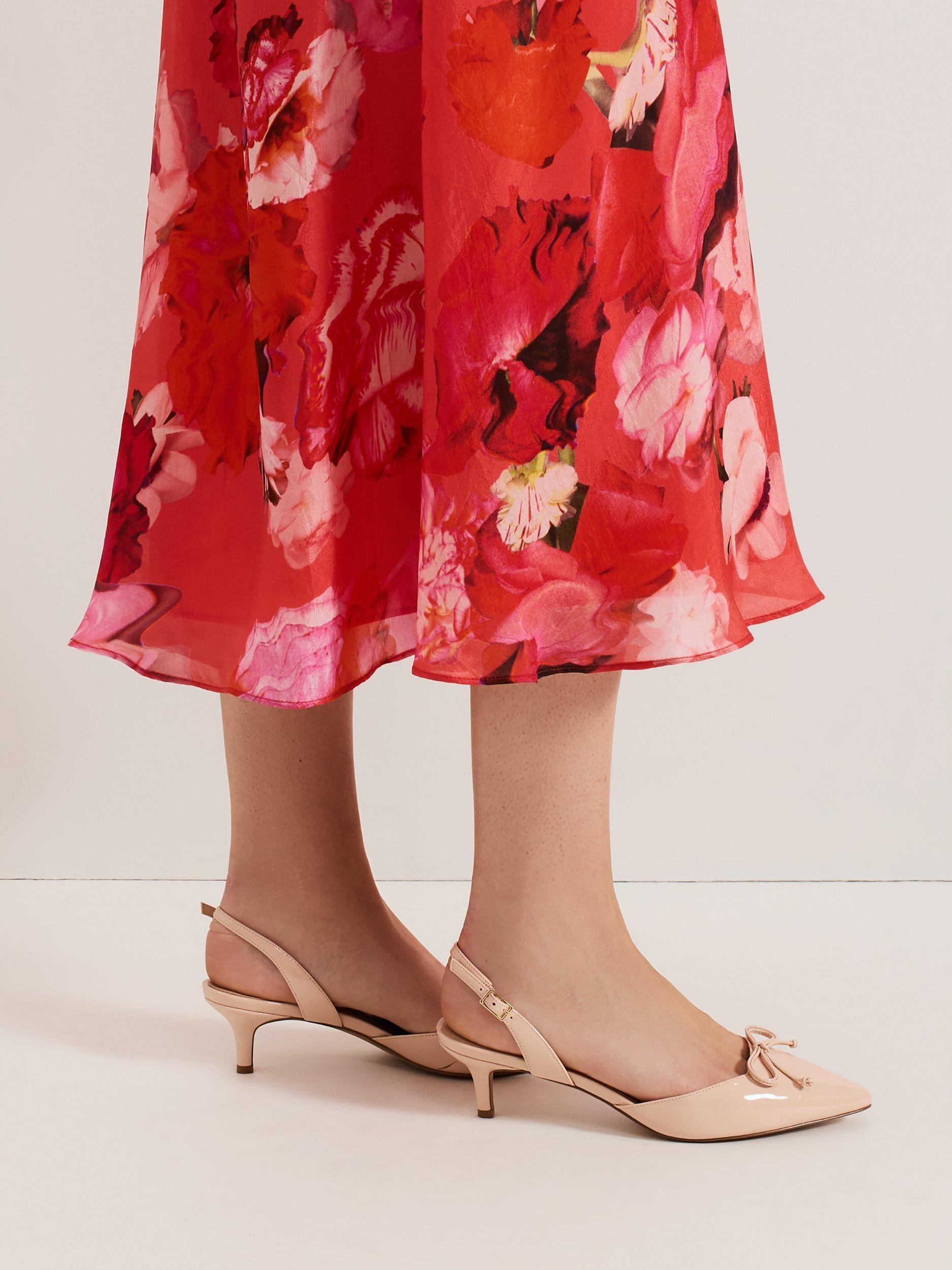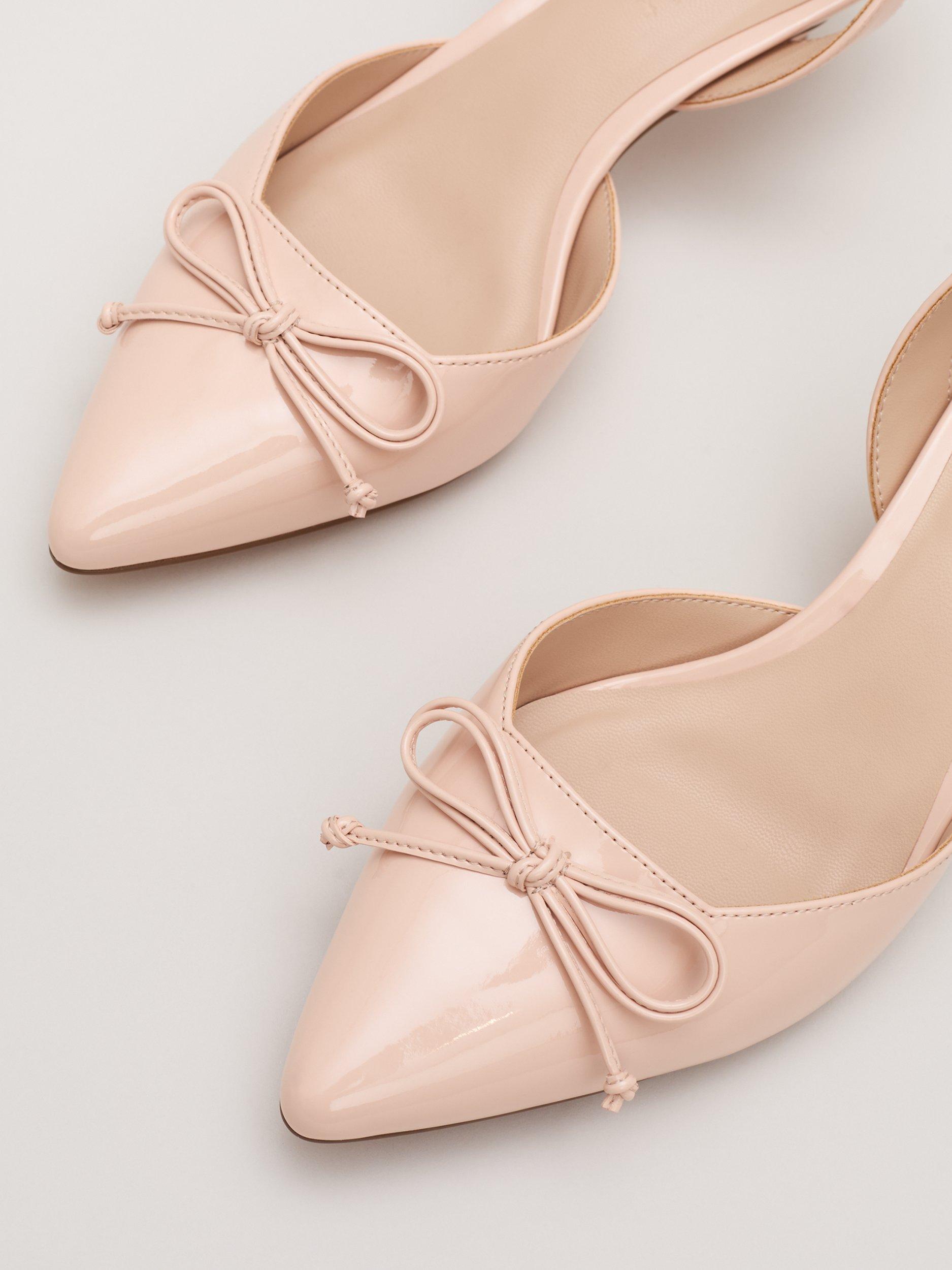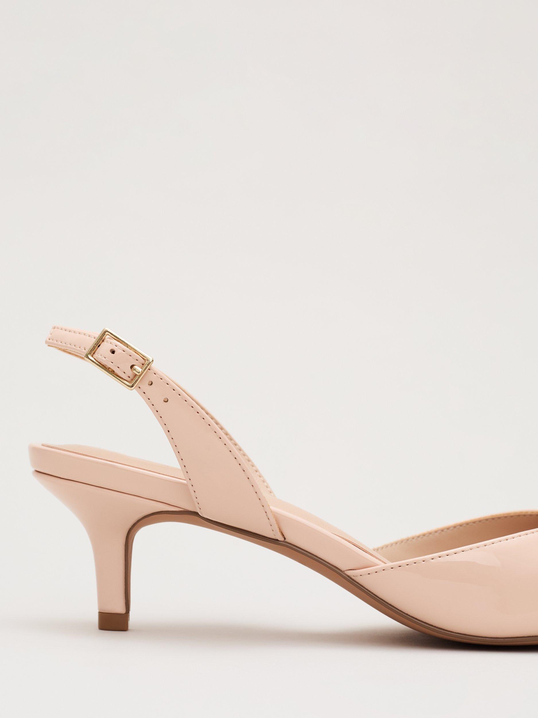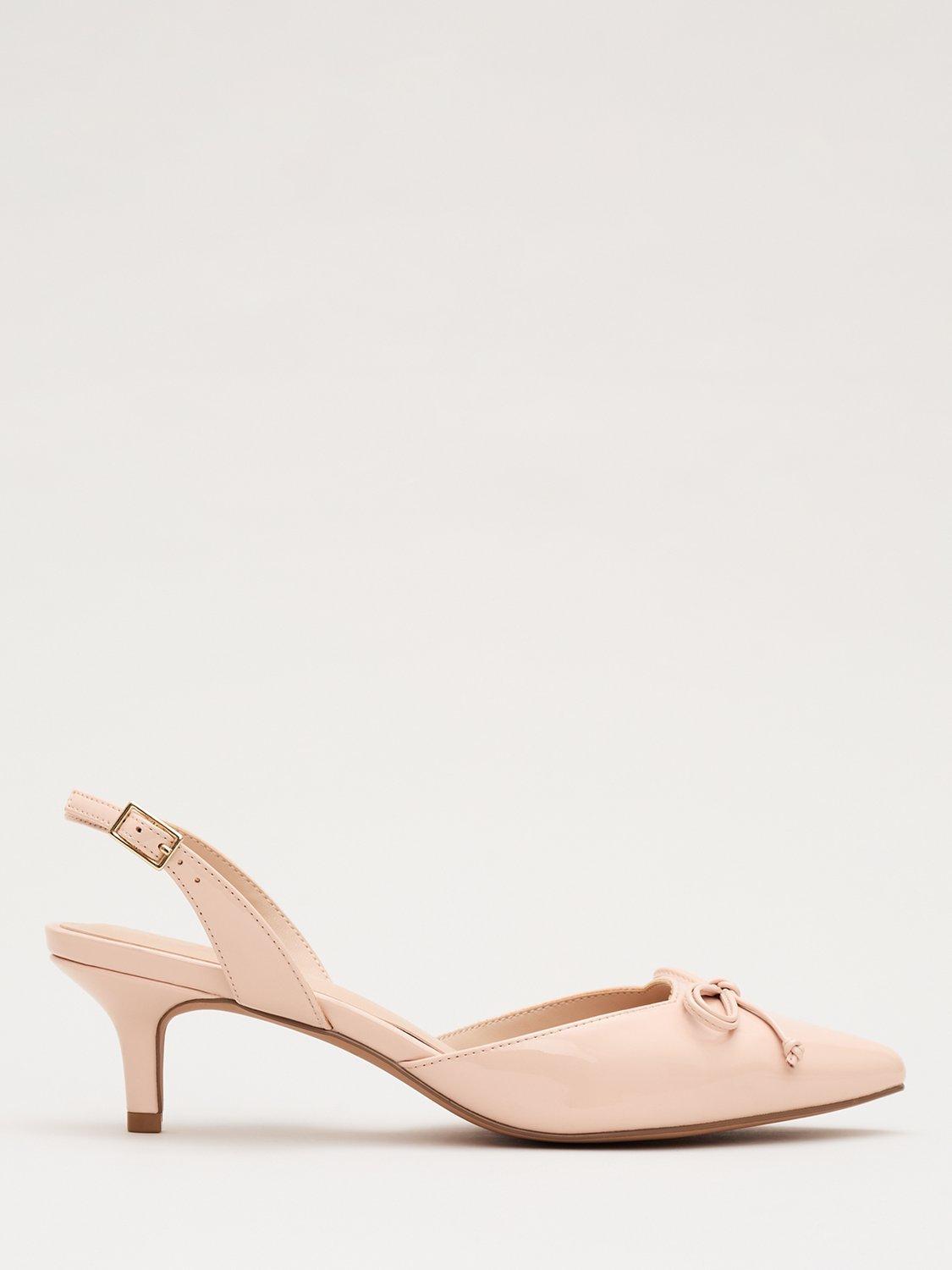 These nude patent kitten heels from Phase Eight will become a staple in your shoe collection. Finished with a mini bow detail at the pointed toe, the slingback style heels boast simplified elegance and are comfortable enough to wear all day and night.
