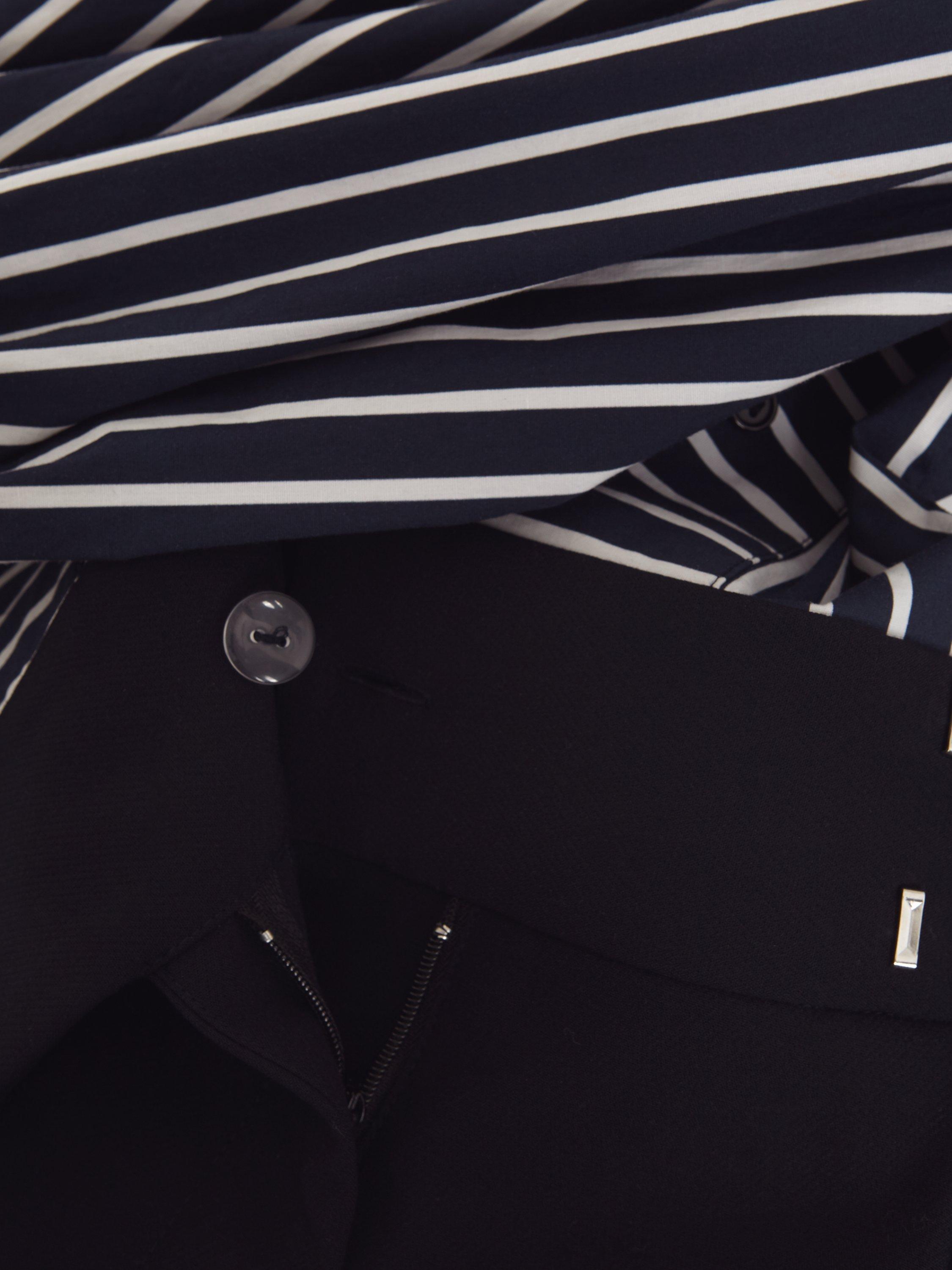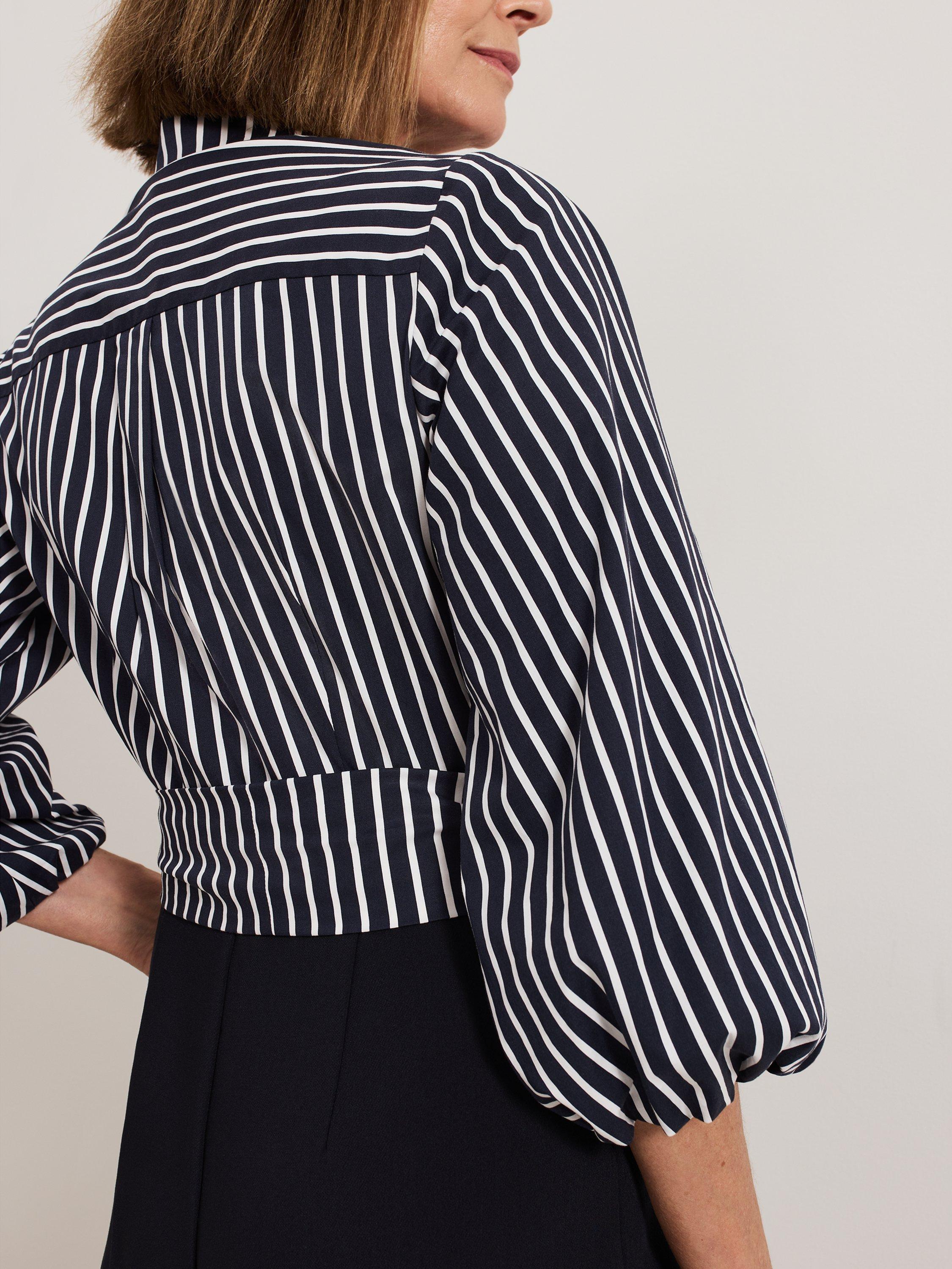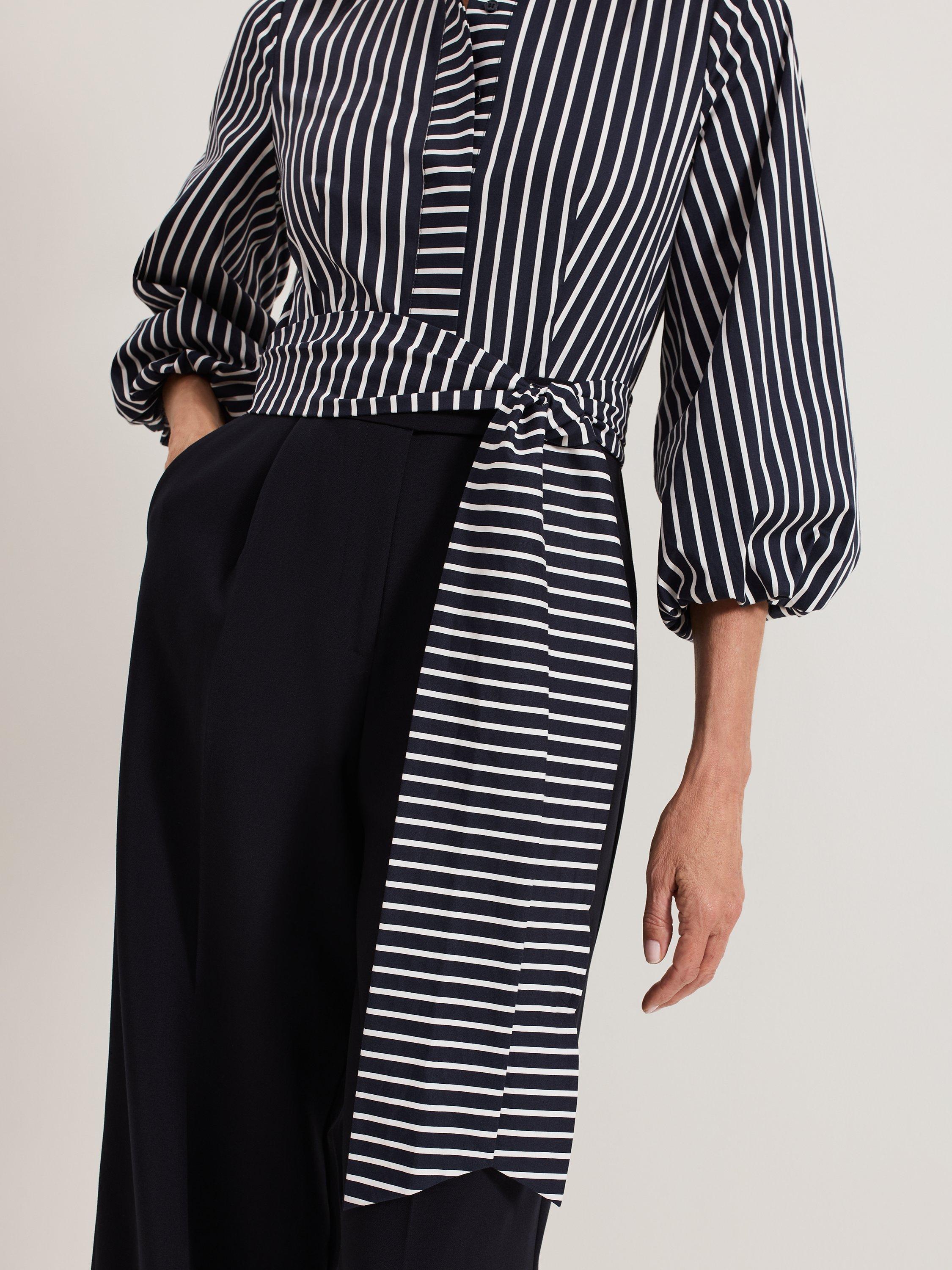 Slicked with stripes through the bodice, it's complete with a wide self-tie belt at the waist.