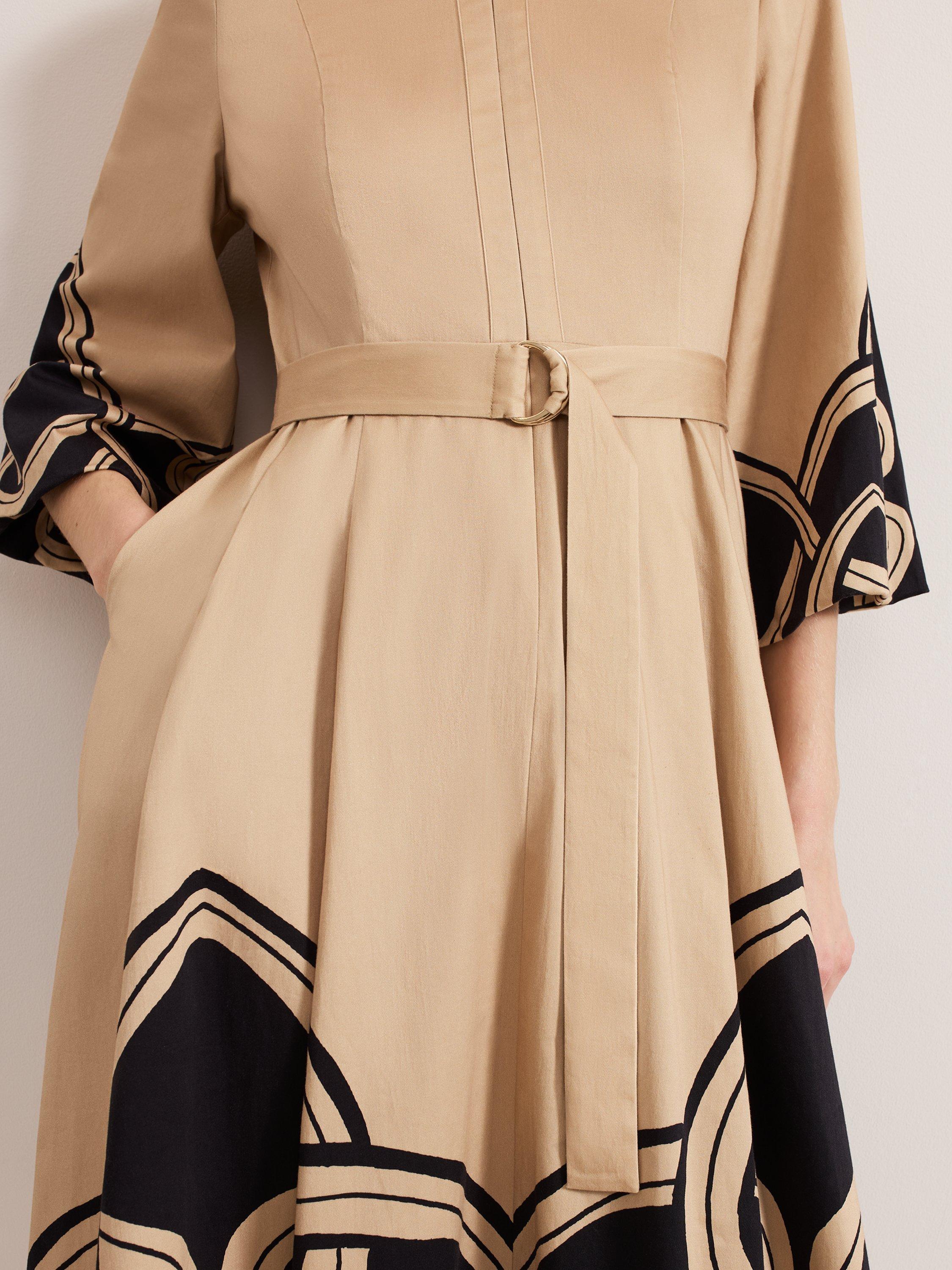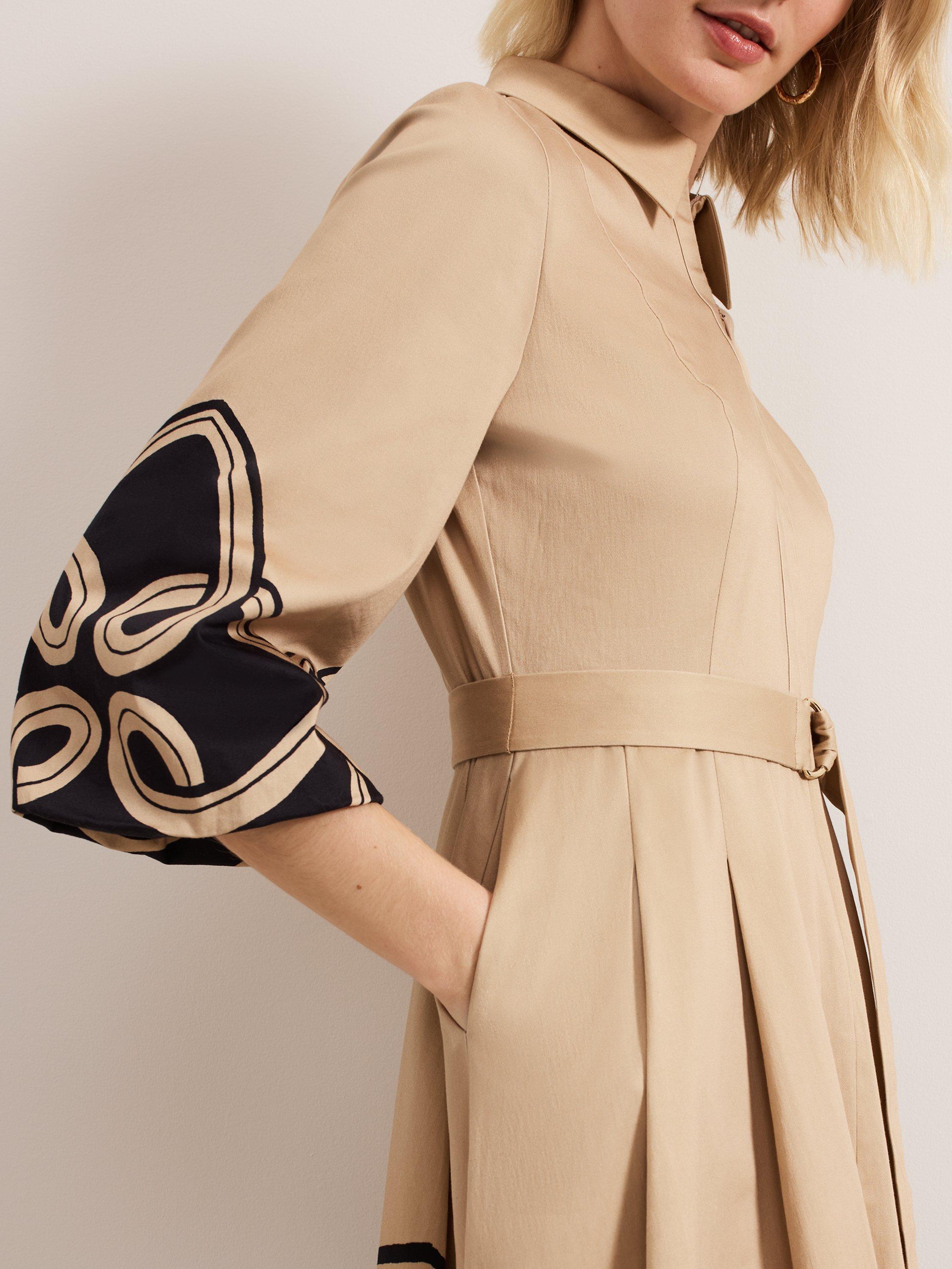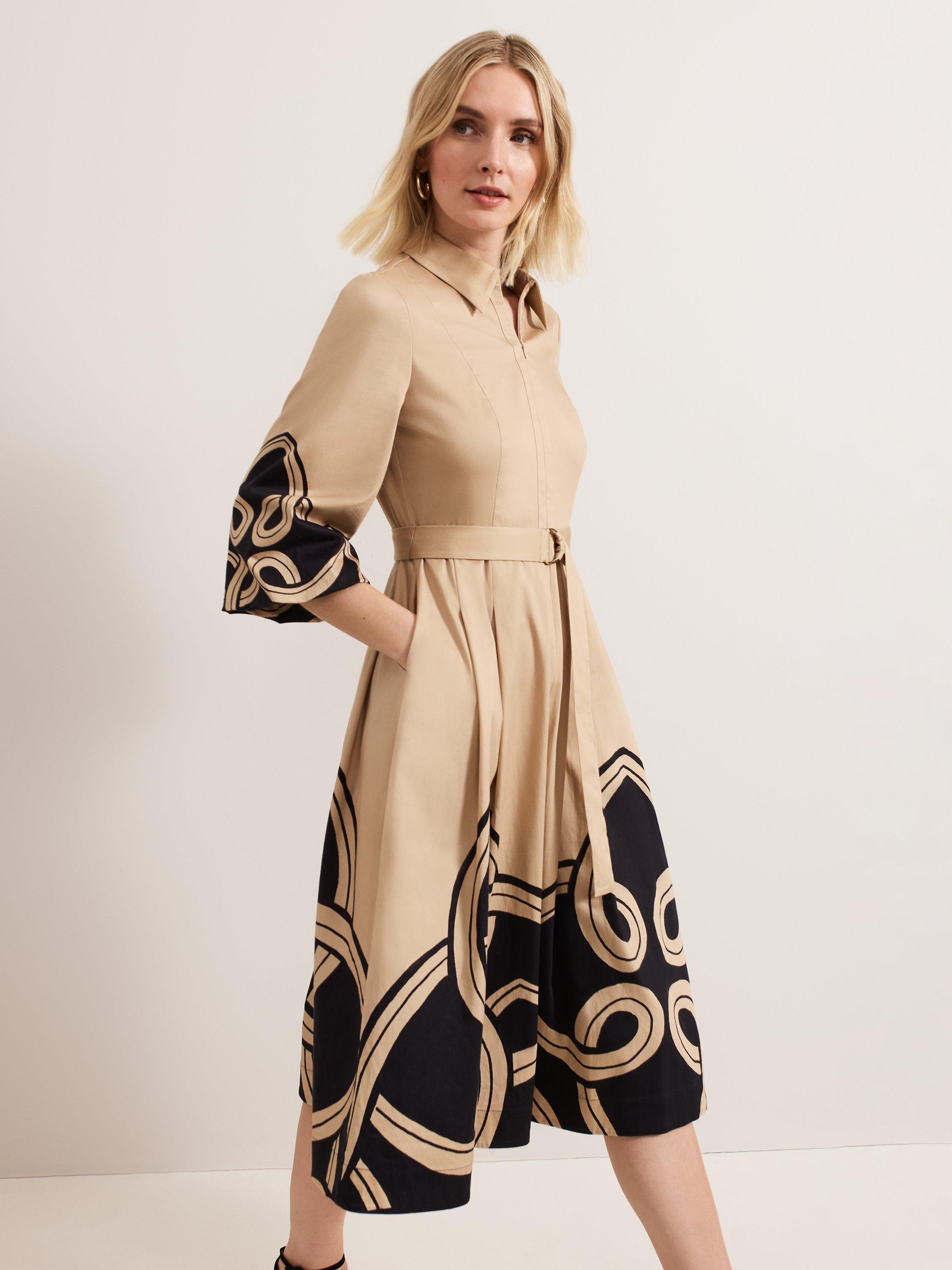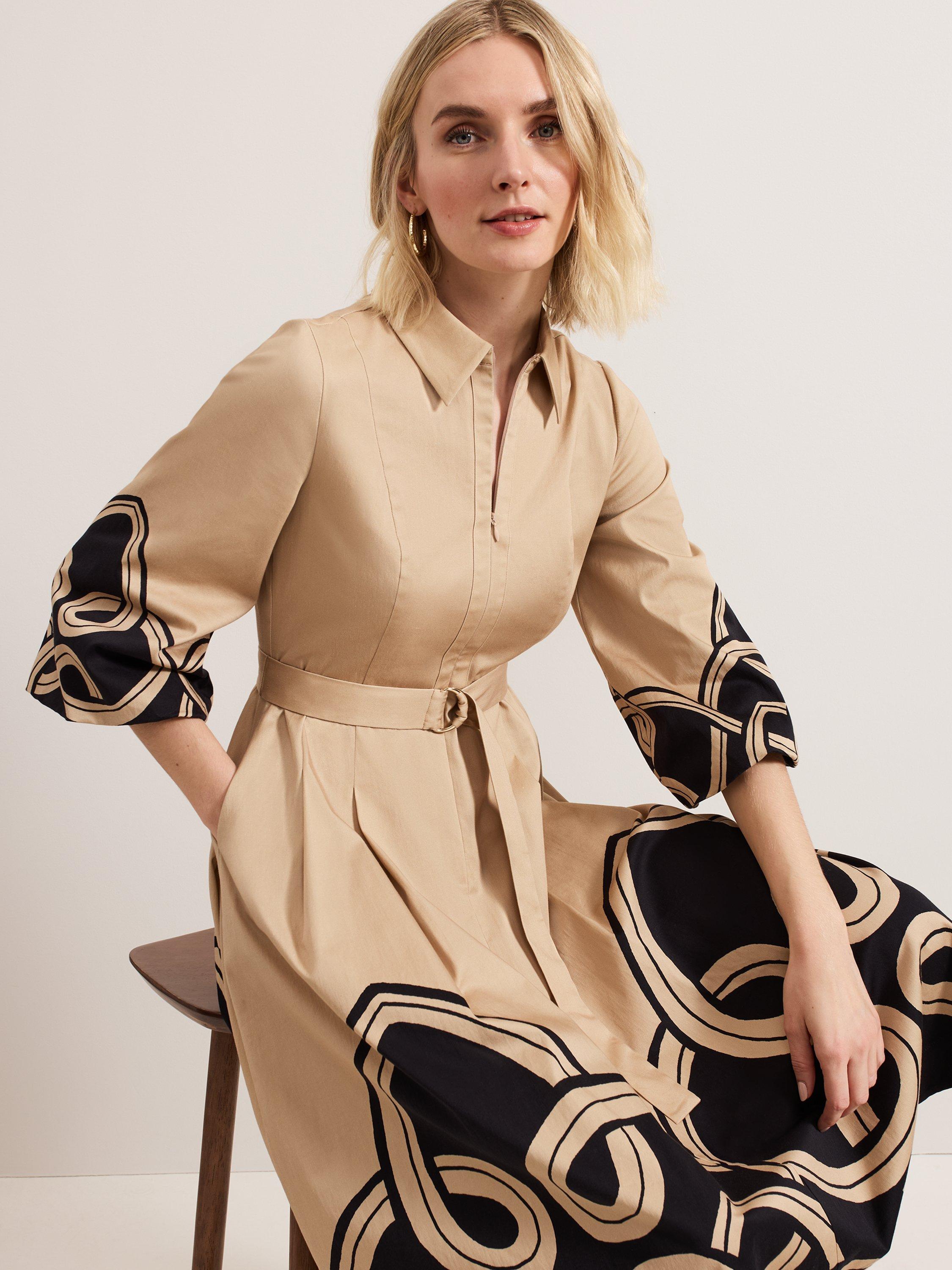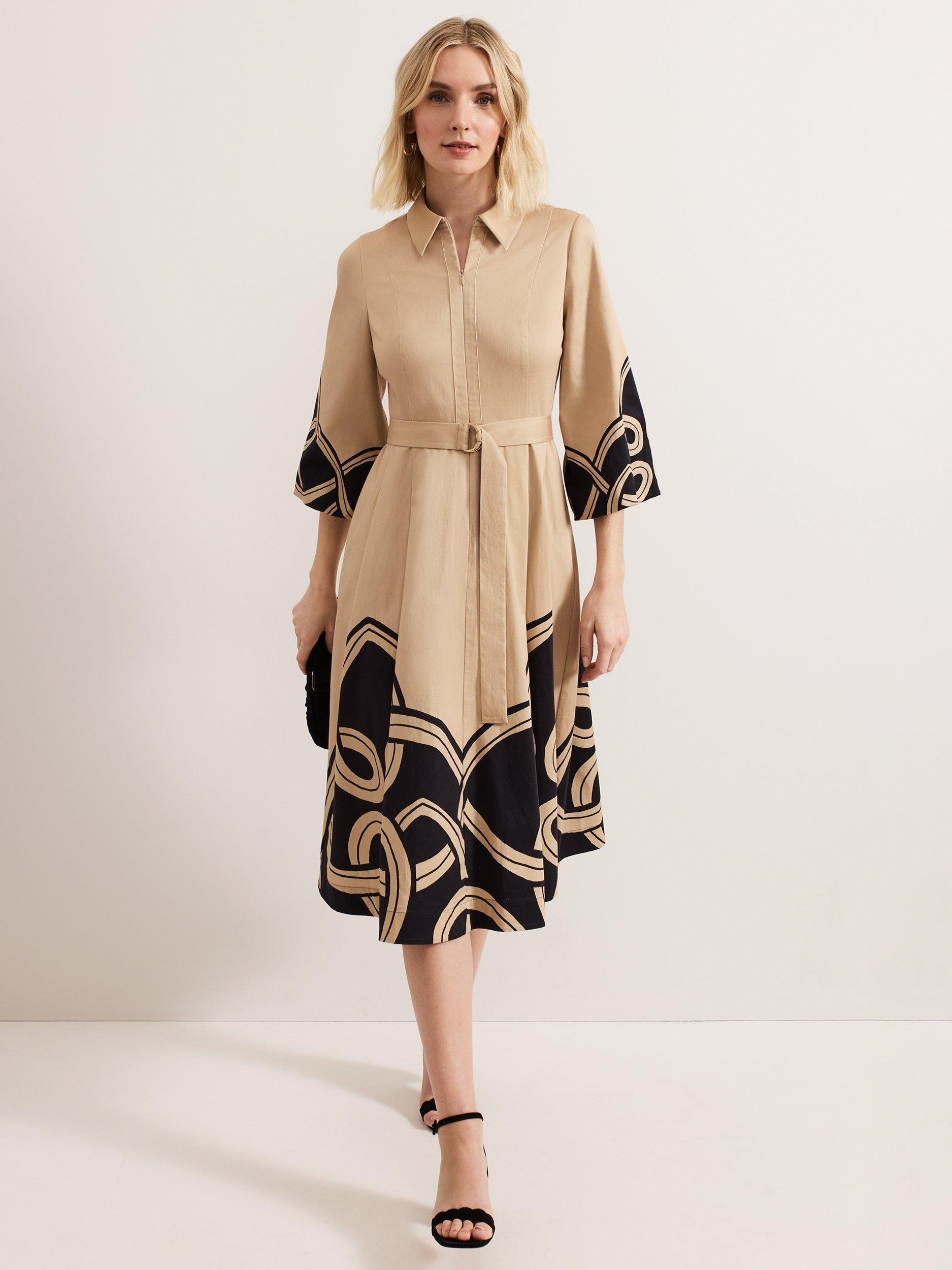Designed with a new exclusive Phase Eight print, the Breena dress will take you from relaxed to refined in an instant. The effortless shirt silhouette makes it perfect for wearing all day and night whilst the concealed zip and D-ring belt give it a utility style edge. Flowing through to a midi skirt with structured pleats that add volume and movement this neutral style will become a staple in your capsule wardrobe.