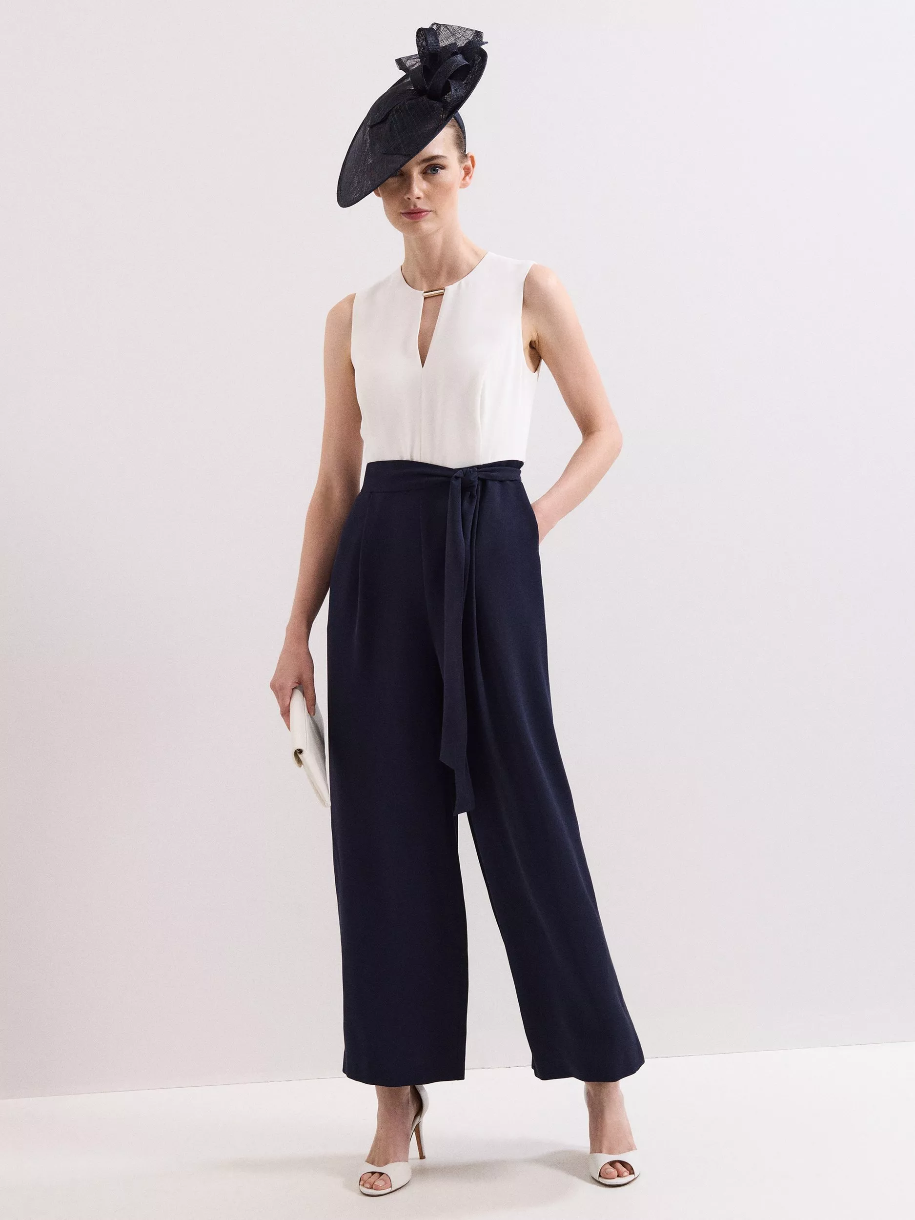 A sleeveless V-neck jumpsuit from Phase Eight. The wide-leg cut ensures comfort and confidence, while the colour block design offers a sharp, modern twist. Finished with a self-tie belt at the waist and side pockets.