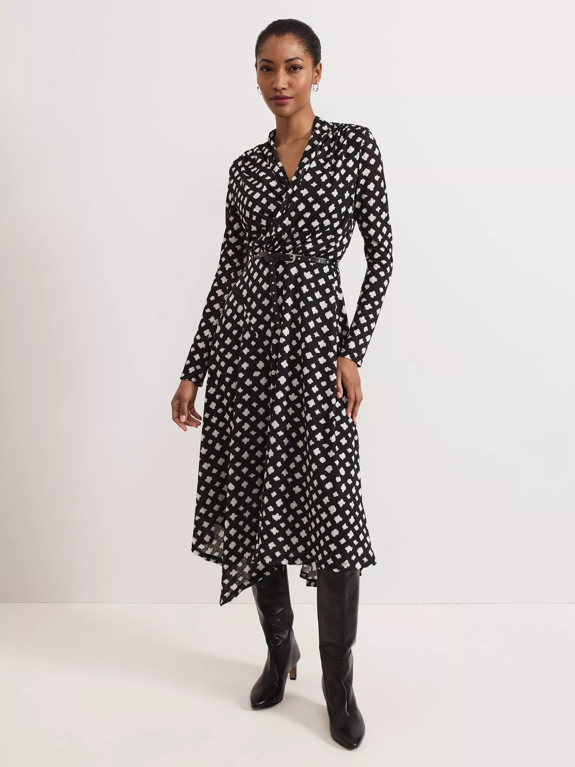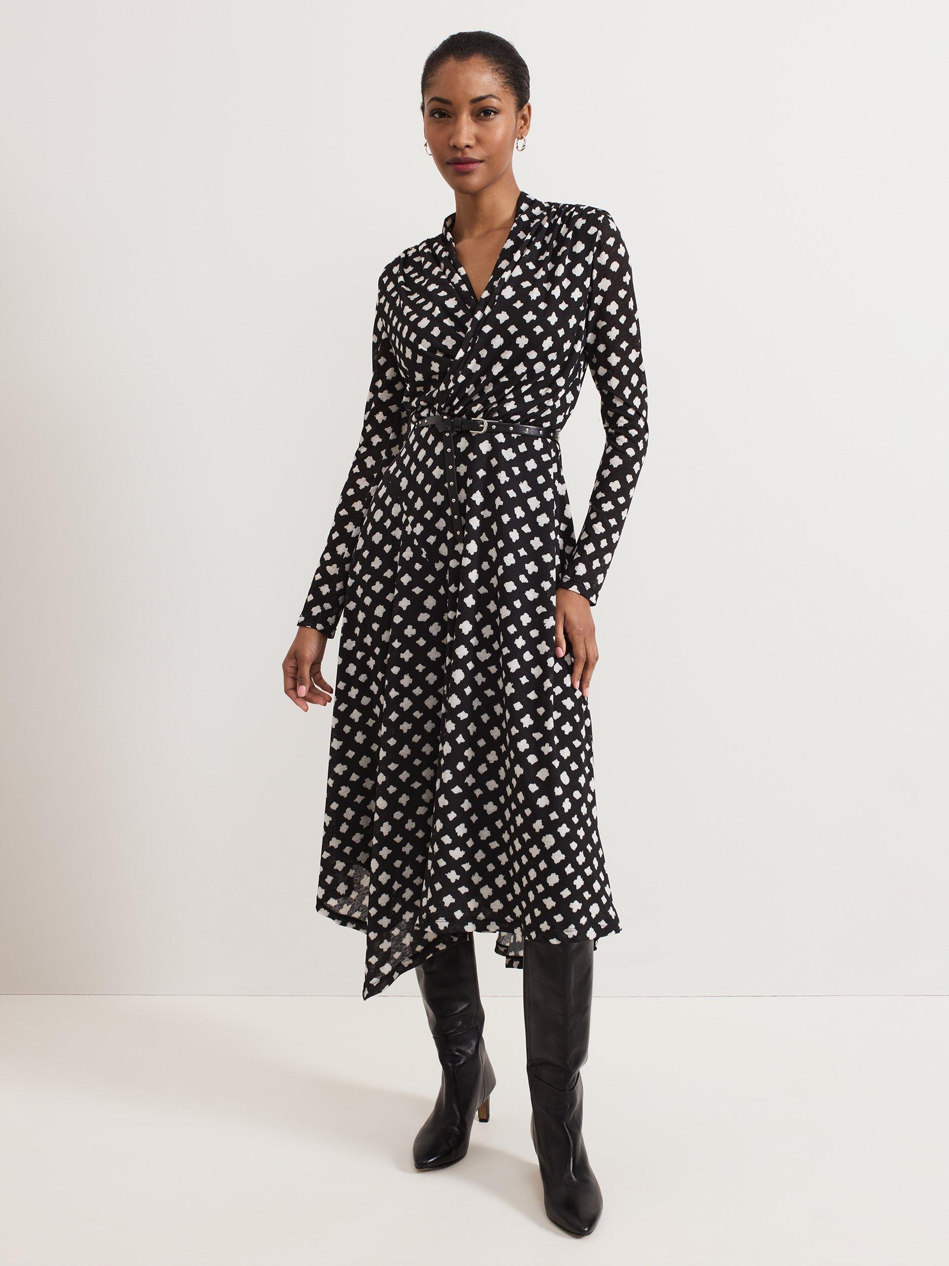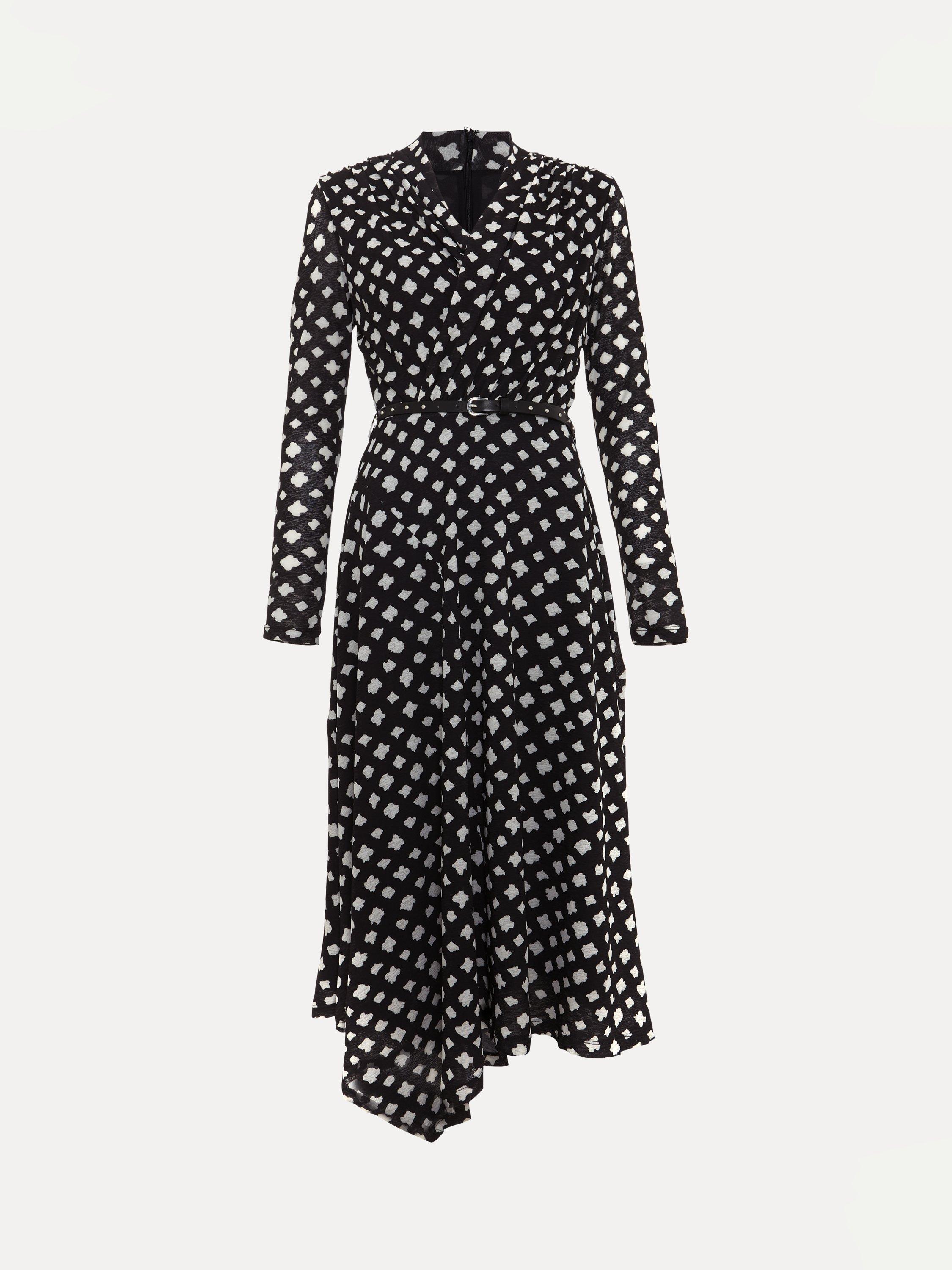 The perfect dress for that special occasion. Designed in an abstract check print, the Caitlin dress features an elegant twist neck, long sleeves and an asymmetric hem. The leather belt highlights the waist before falling to a chic midi length. Pair with your favourite boots or heels for a sophisticated event style.