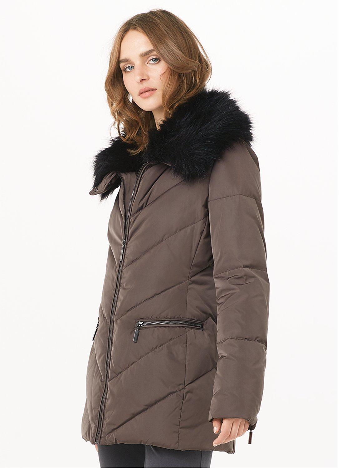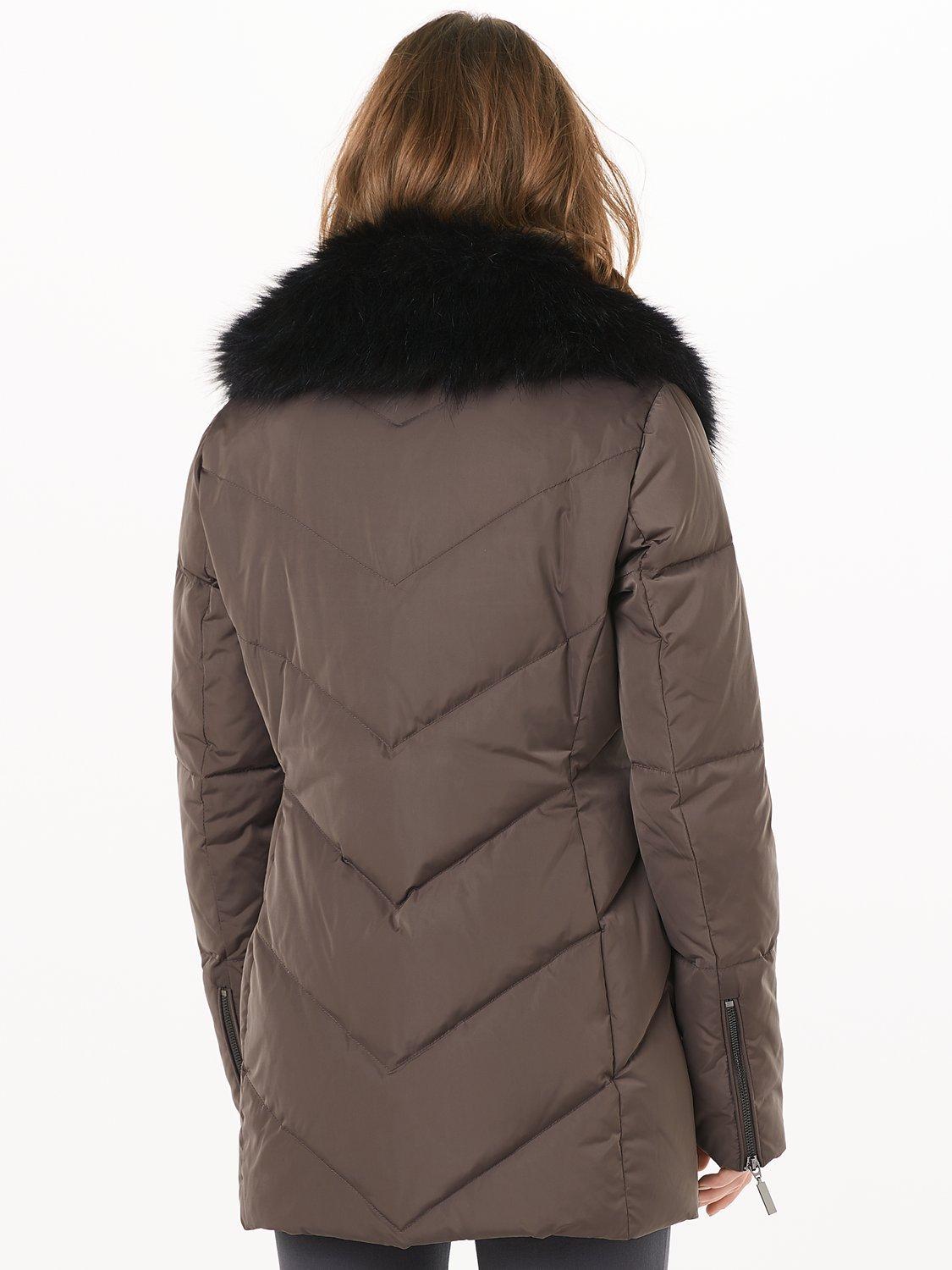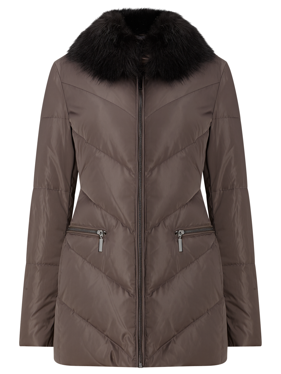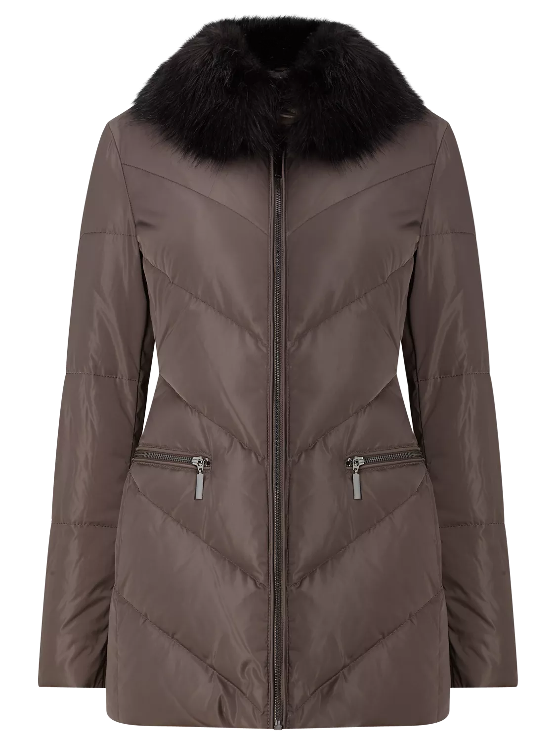 Featuring a flattering chevron design, this padded jacket has zip pockets on the hips for practicality and a trendy faux fur trim collar.