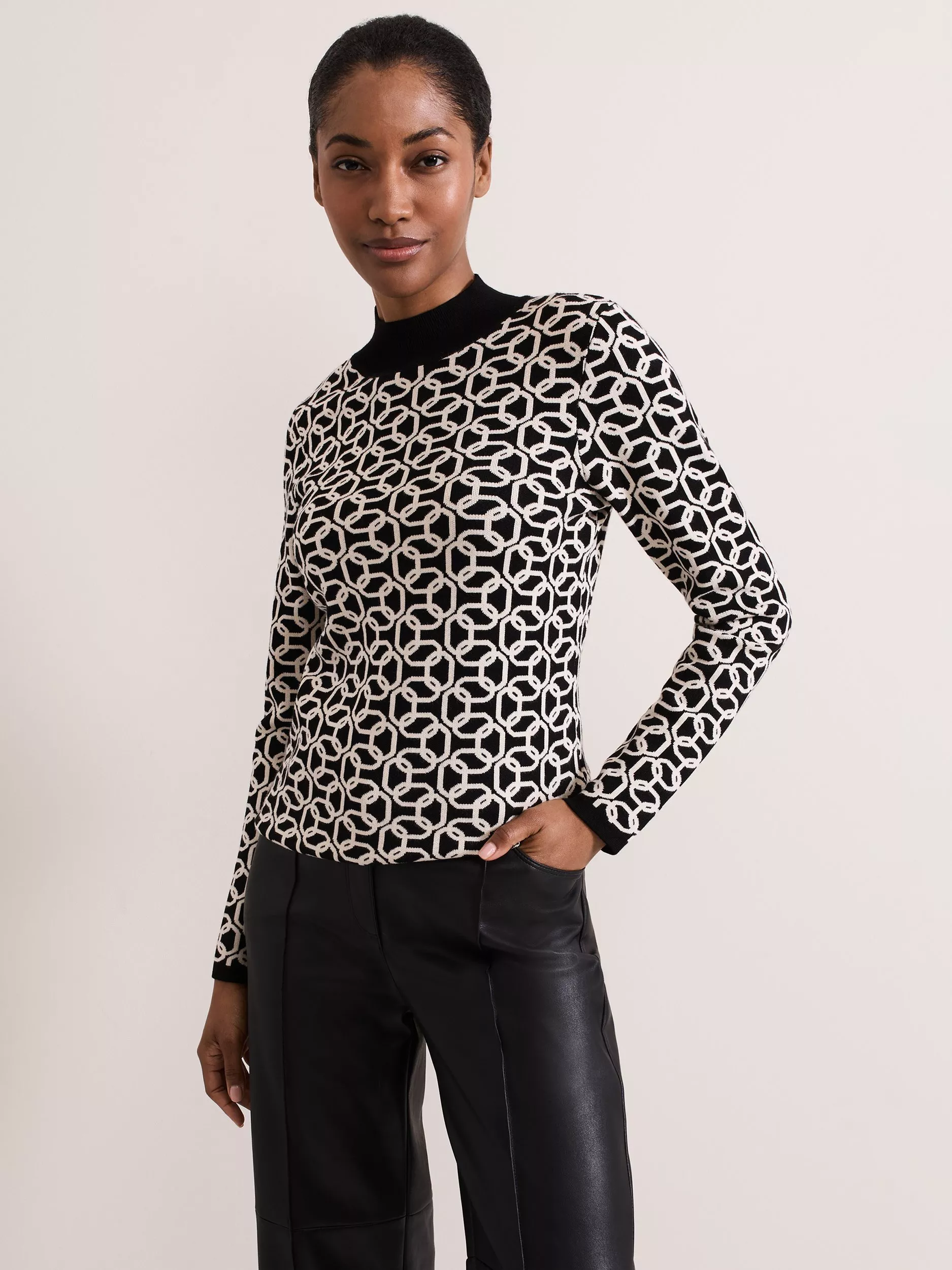 Designed in a chain print our Callie jumper is cut to a fitted silhouette to create a cosy statement top for your cold weather wardrobe. Featuring a high round neck and block hem detailing our top pairs perfectly with all your favourite separates.