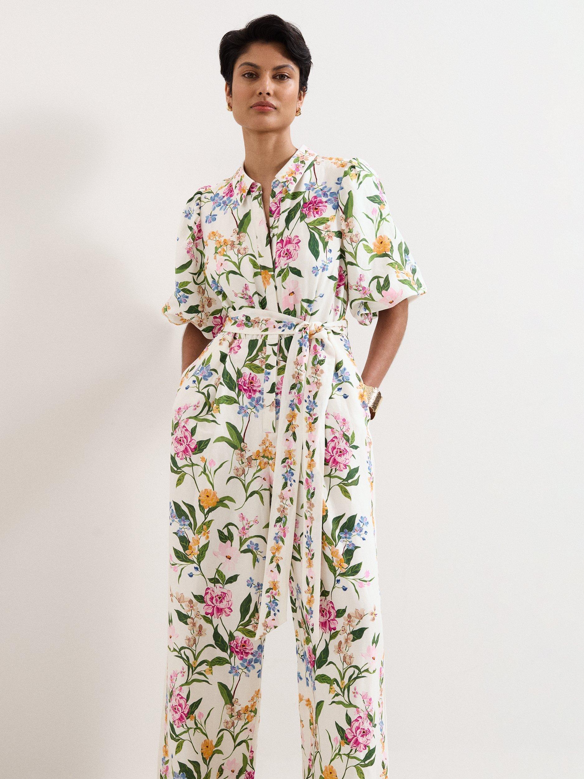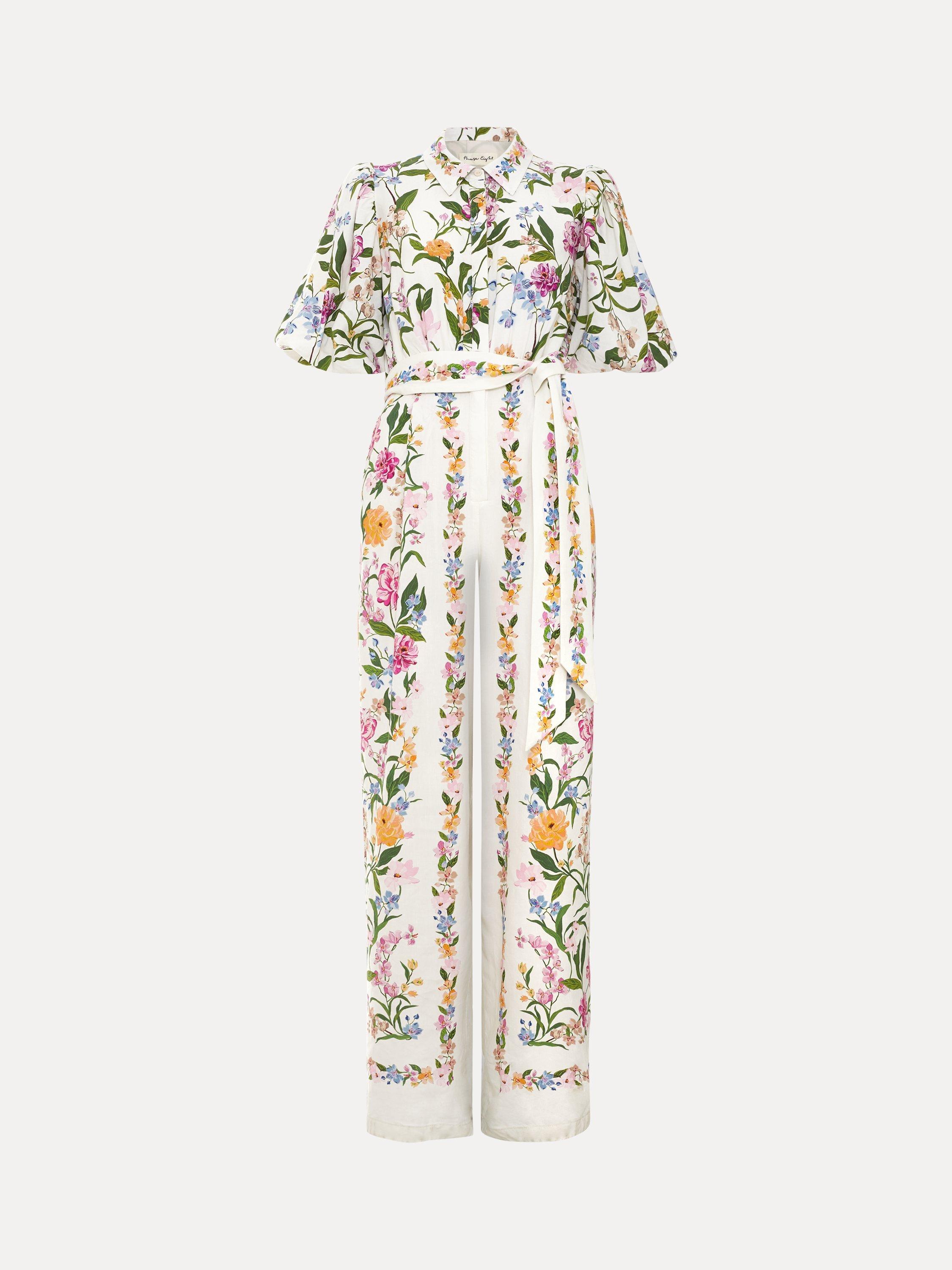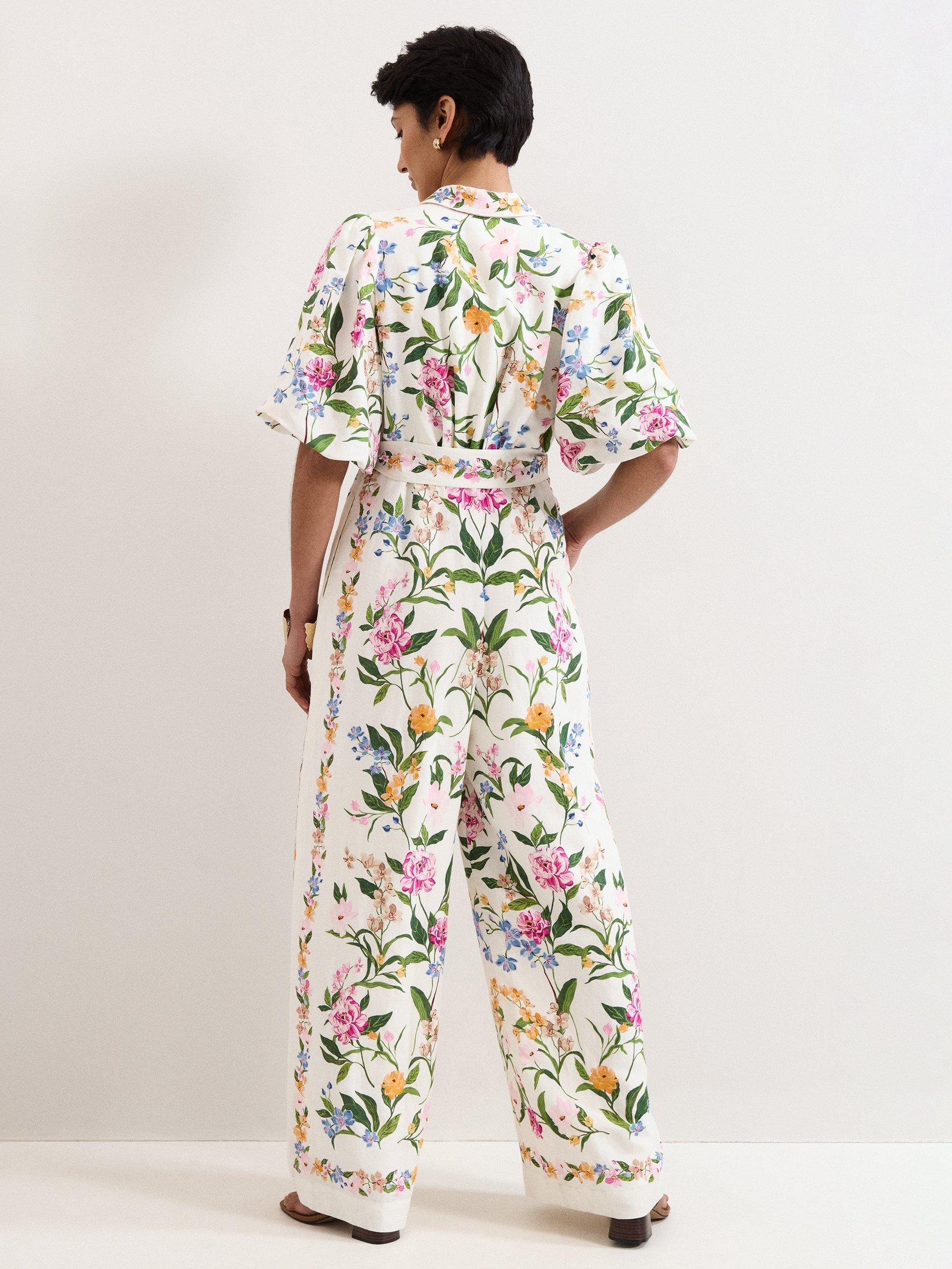 Both radiant and impactful, this feminine floral jumpsuit is perfect for all your spring/summer occasions. Designed in a stylishly comfortable wide-leg silhouette, this jumpsuit features a delicate floral print, inspired by vintage wallpaper. Finished with a relaxed collar, playful puff sleeves, pockets and a matching tie belt, pair with neutral accessories to let this style do all the talking.