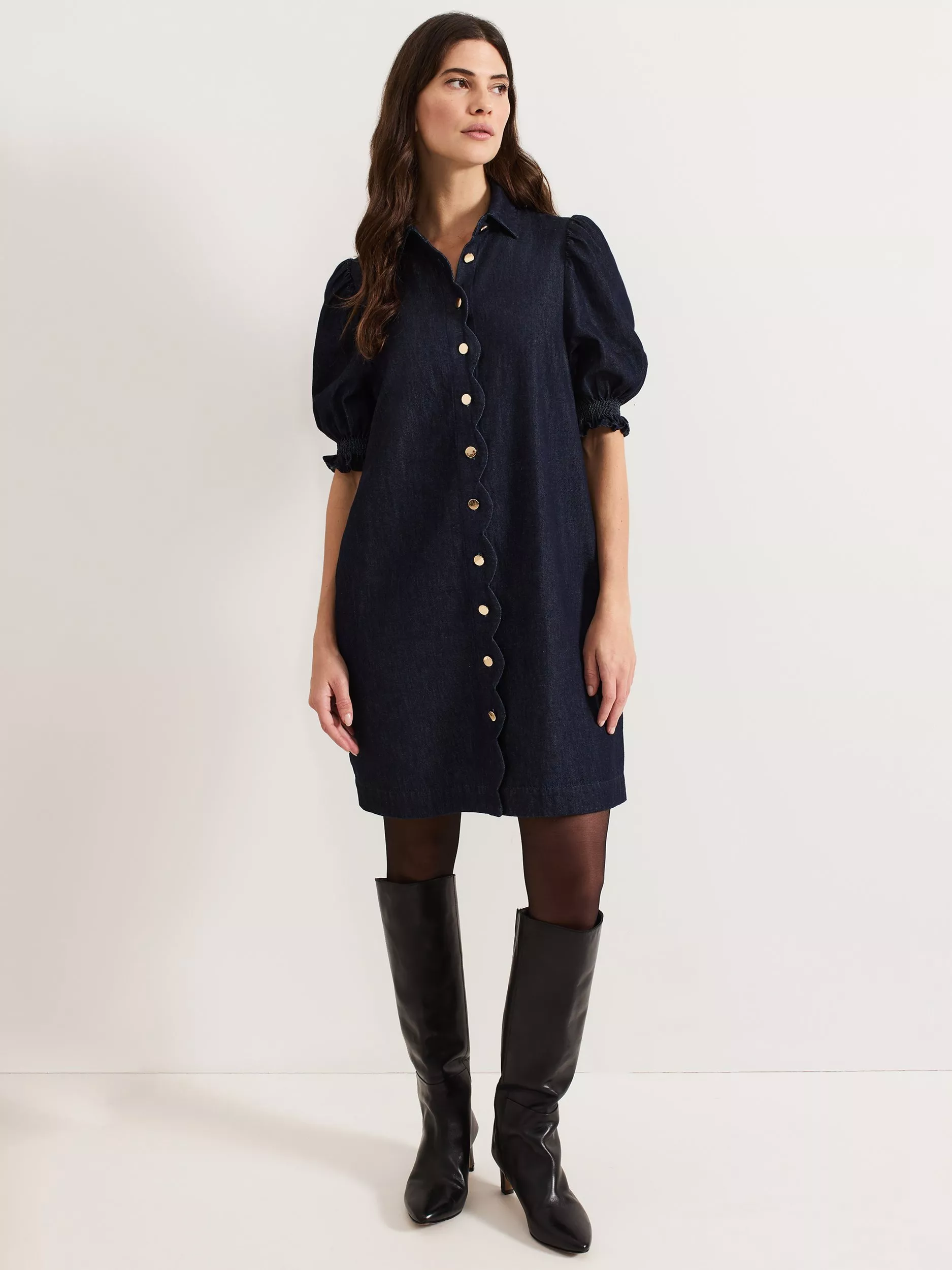 The denim Candice dress is an everyday favourite, for work and weekend. In an easy swing silhouette, this dress features gold button-through detailing and a scalloped edge. Feminine puff sleeves add dimension, whilst the refined collar looks great buttoned up or left open. We wear ours with knee-high boots for a smart-casual look.