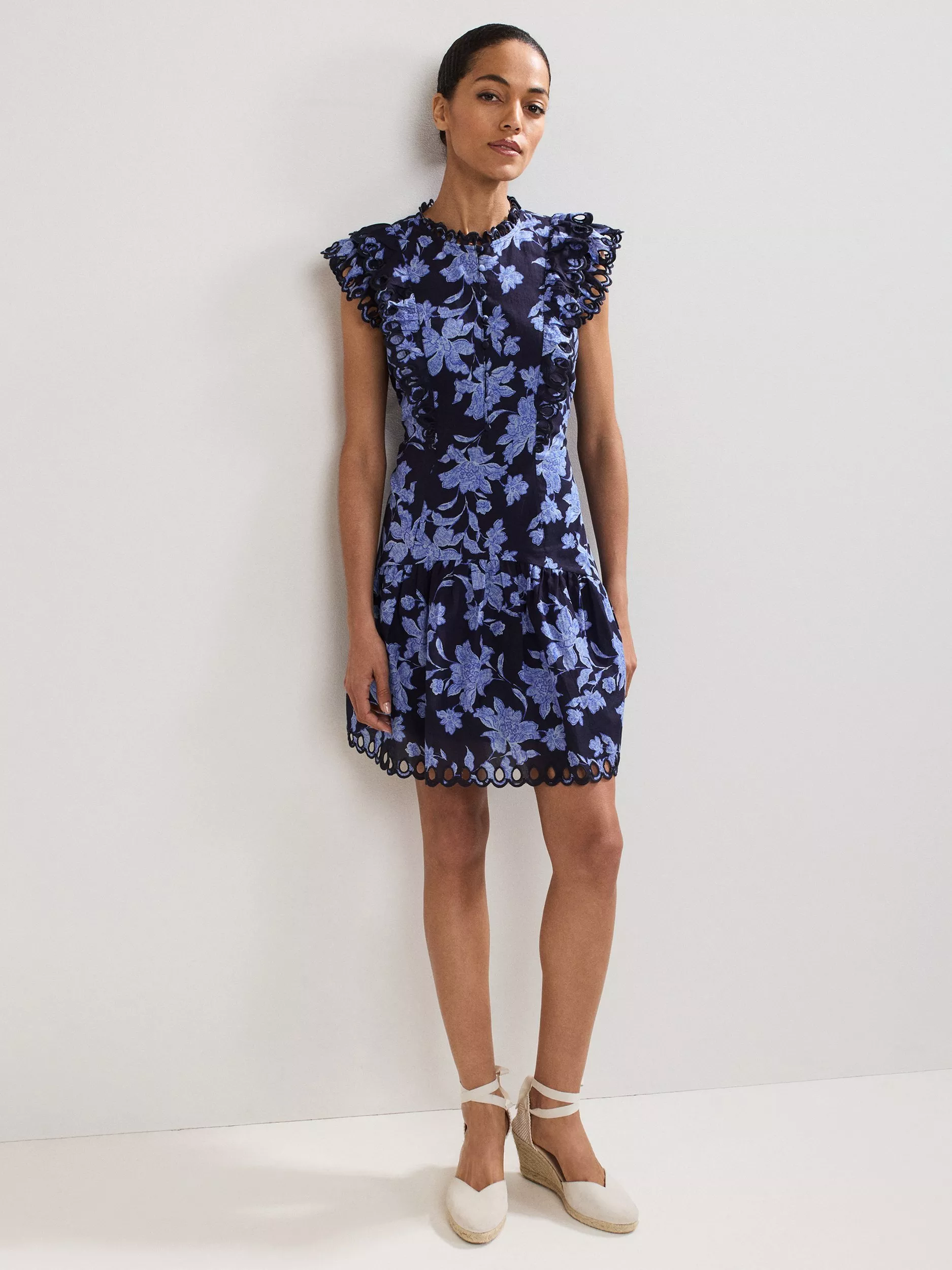Entirely flattering with its A-line shape, this mini dress from Phase Eight comes with a lightweight cotton composition. Defined with a conventional round neckline and cap sleeves, it is planted with flourishing florals.