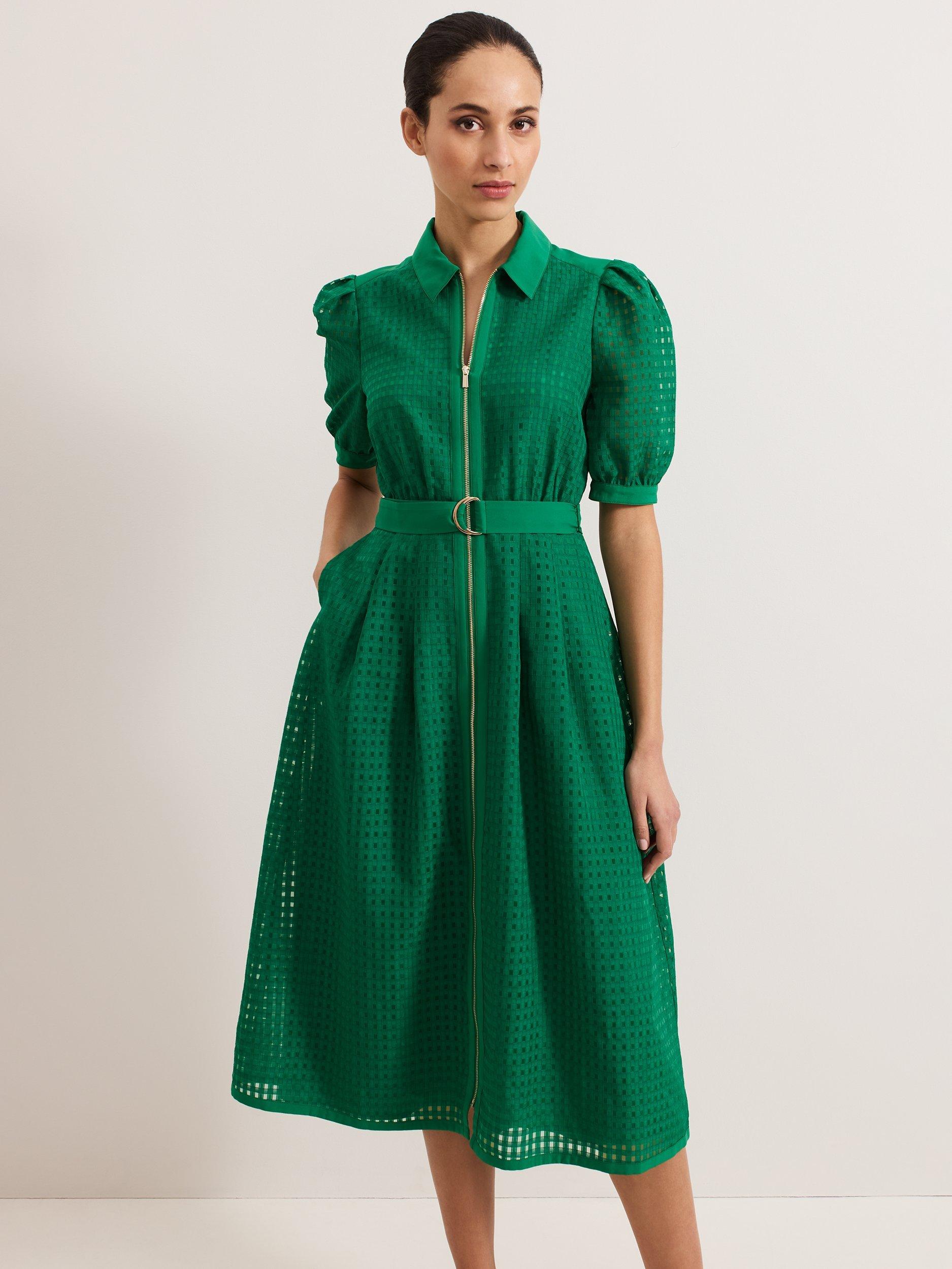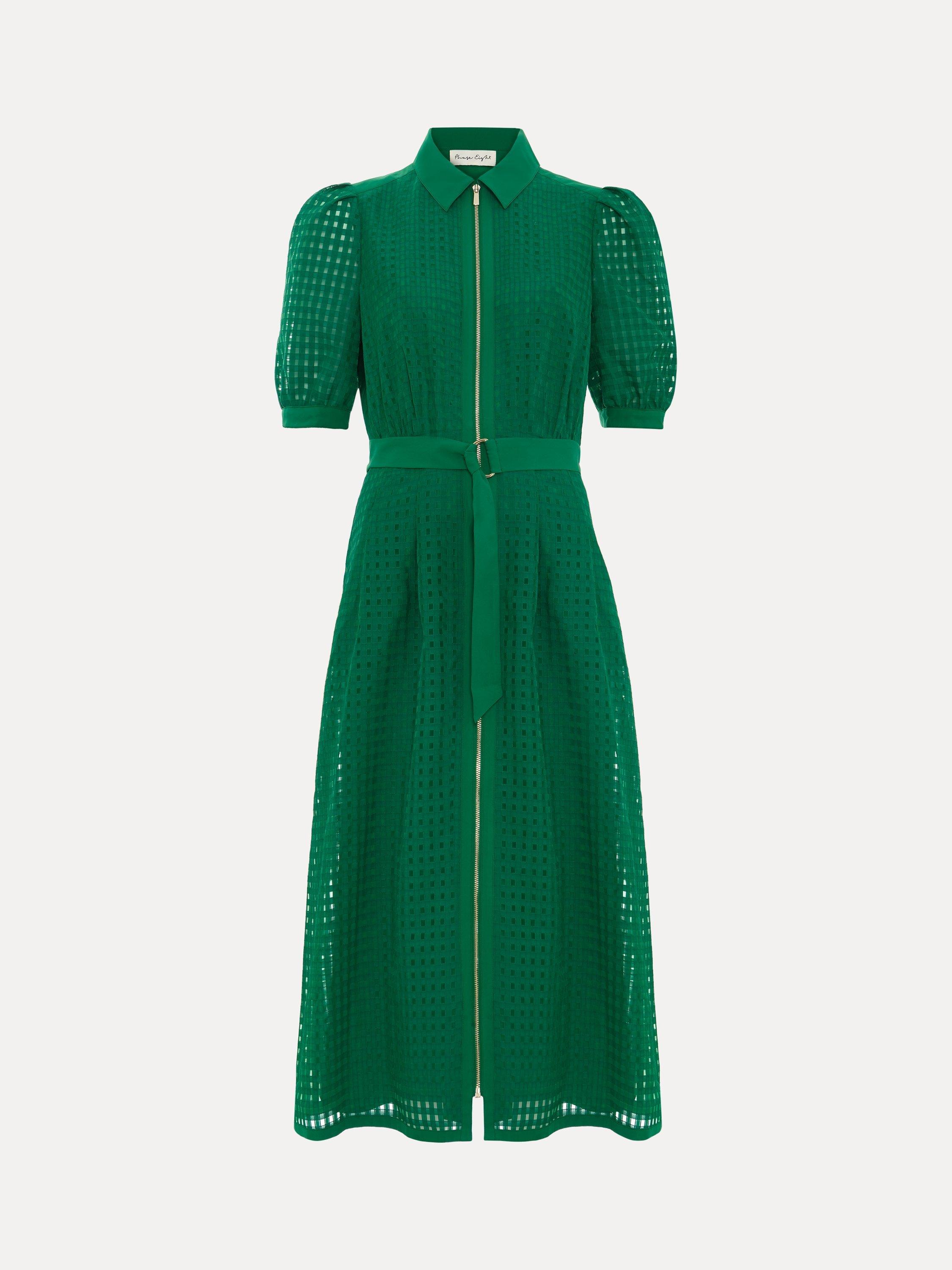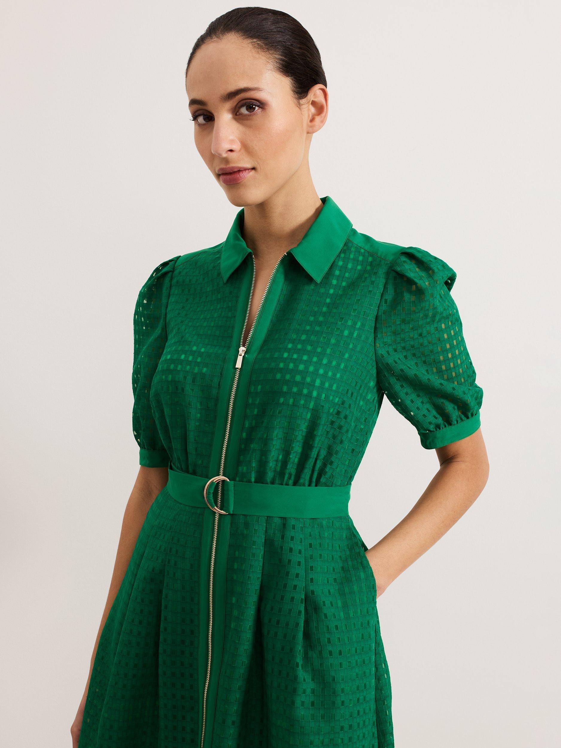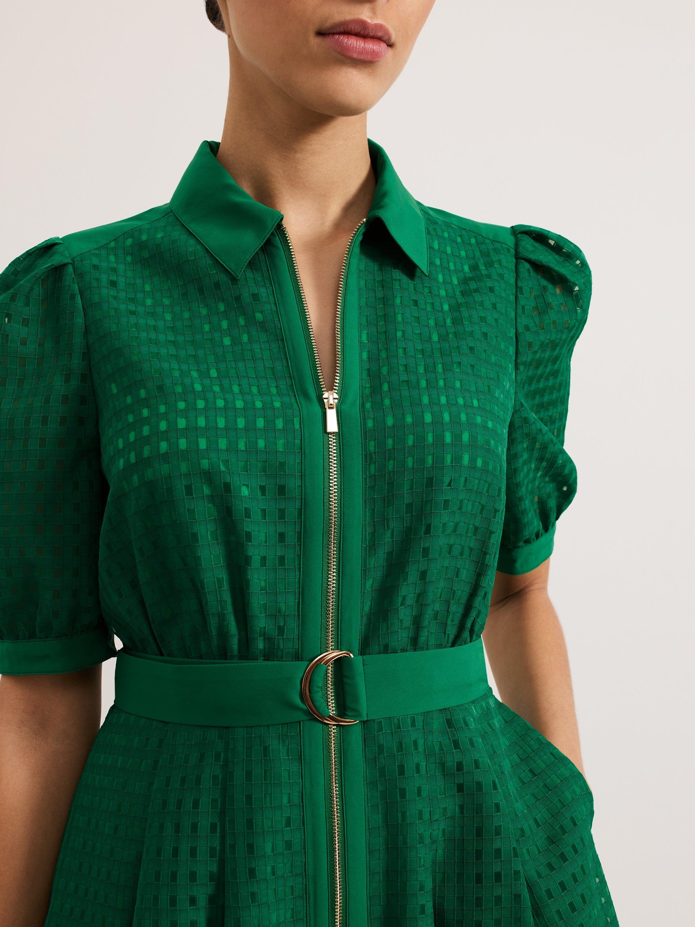 The kind of bright, bold dress you need to add to your wardrobe. Designed in an on-trend shade, the Carey dress features a textured pattern, short puffed sleeves and a zip front detail. Wear with heels or sandals for a the perfect make-a-statement outfit.