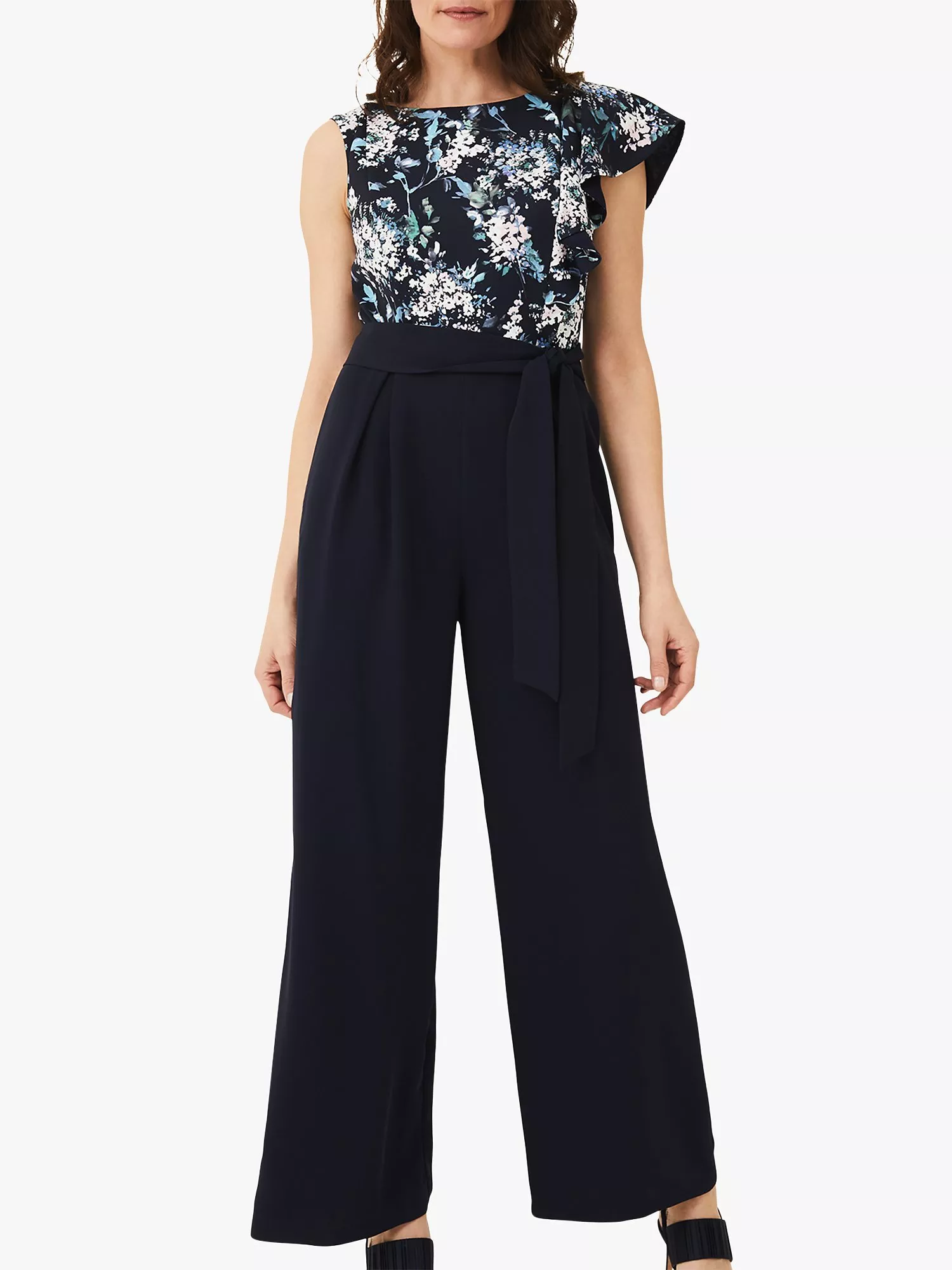A modern alternative to a dress, Phase Eight's Casey jumpsuit is cut with a tapered leg fit and features a contrasting floral bodice accented with a statement frill detail. Define your figure with the matching waist tie and elongate your outline with sleek heels for instant glamour.