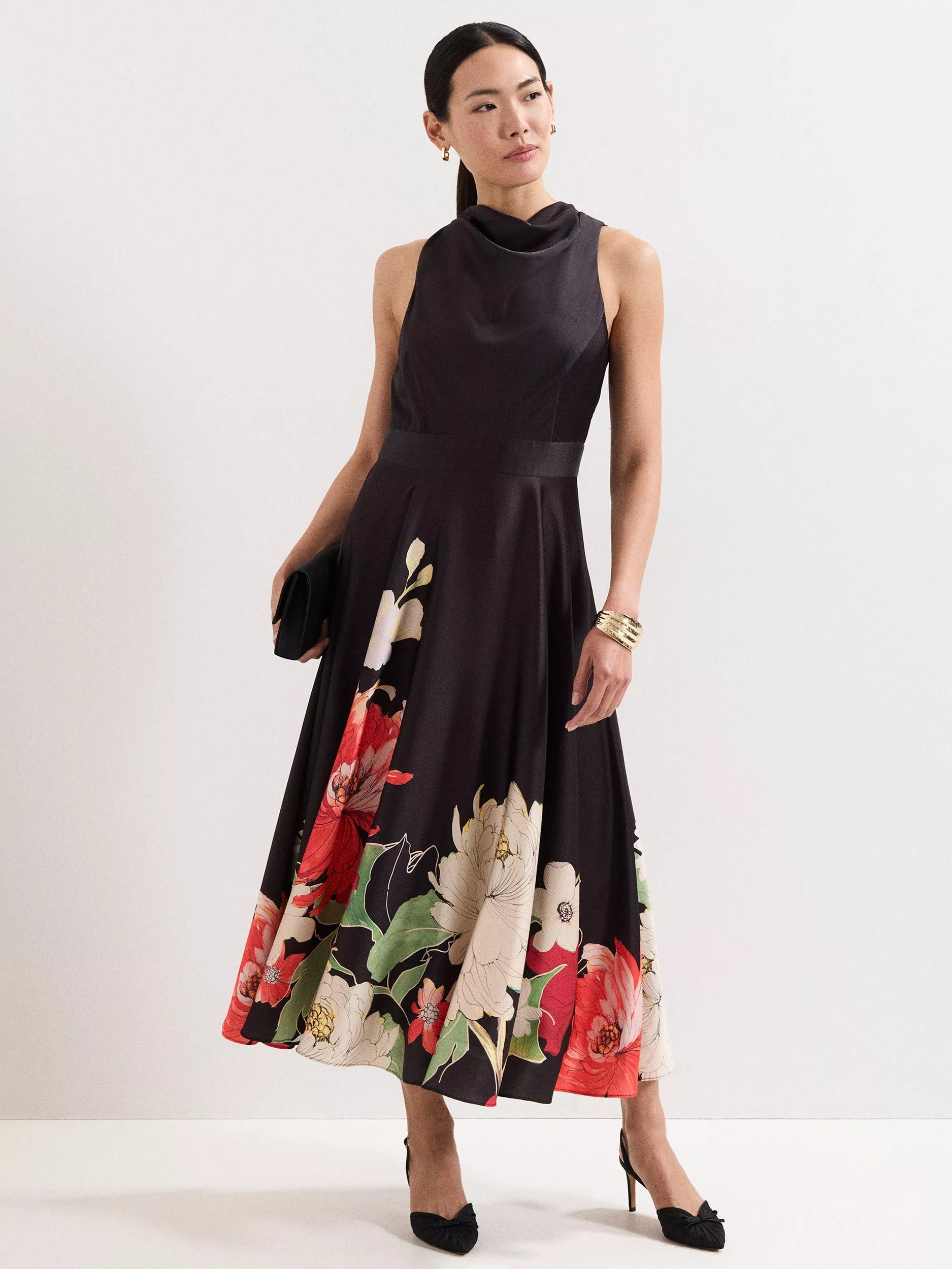 This satin midi event dress reflects understated elegance. Designed in a modern halter cowl neck style, the fluidity of the satin cascades effortlessly down to the skirt, highlighting the striking floral feature. Cinched in at the waist to further enhance the silhouette, style with black heels and a matching bag for a chic finished look.