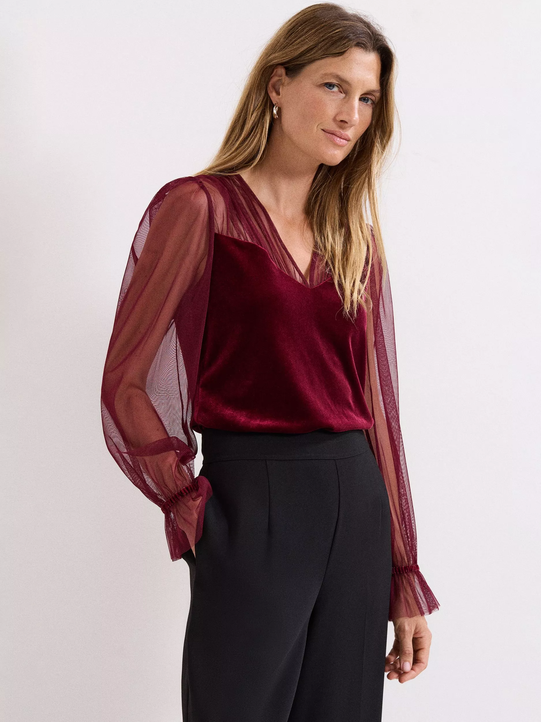 A blouse from Phase Eight, made in soft, textured velvet. With a V-neck and long sleeves, the plain colour means it goes with everything. A chic choice for after-dark style.