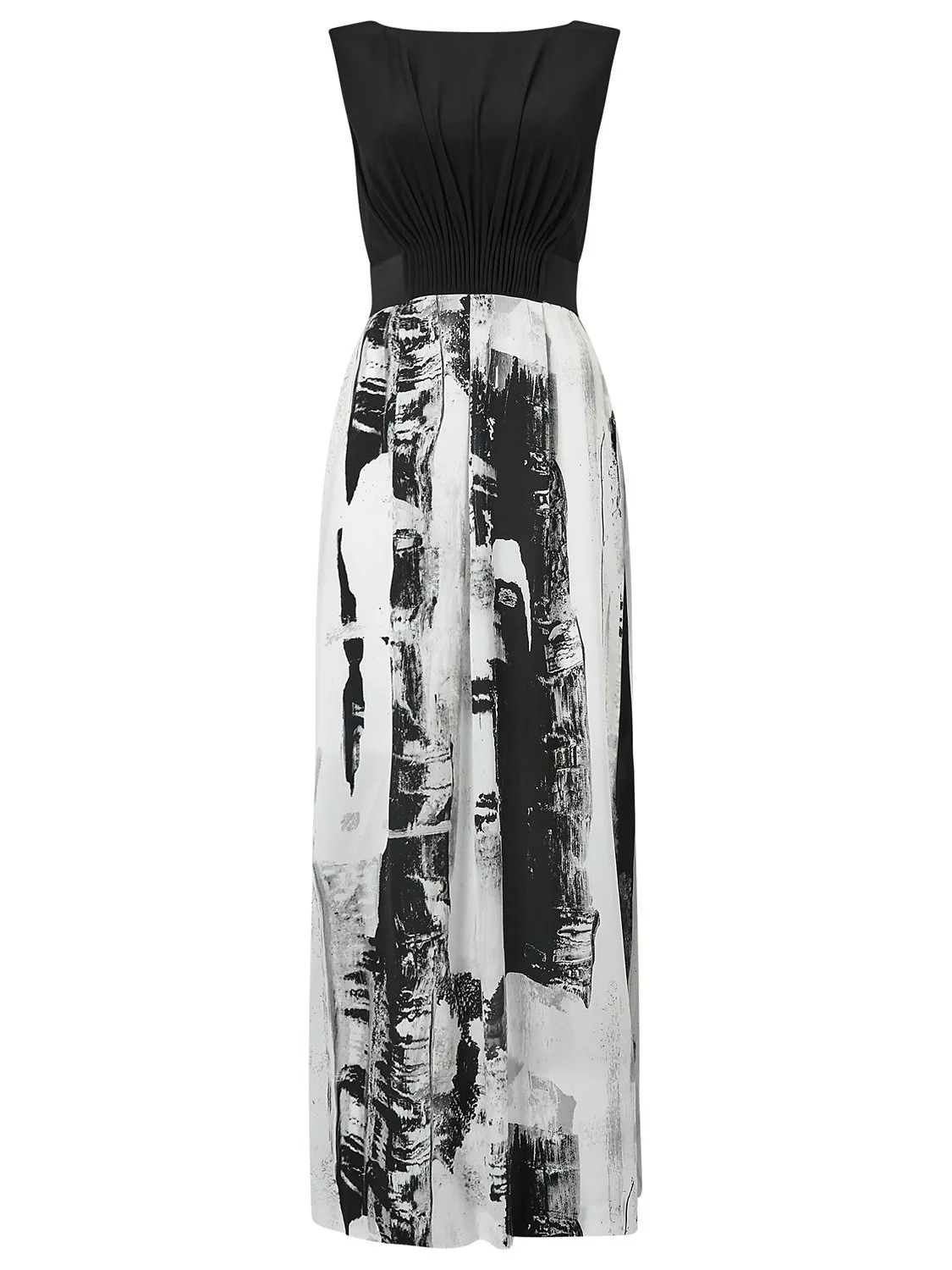 This elegant maxi dress features a bold abstract print skirt with an alluring side split and a contrasting fitted bodice with ruch detail and a stretch waistband. The style is complete with round neckline and fastens with a concealed back zip.