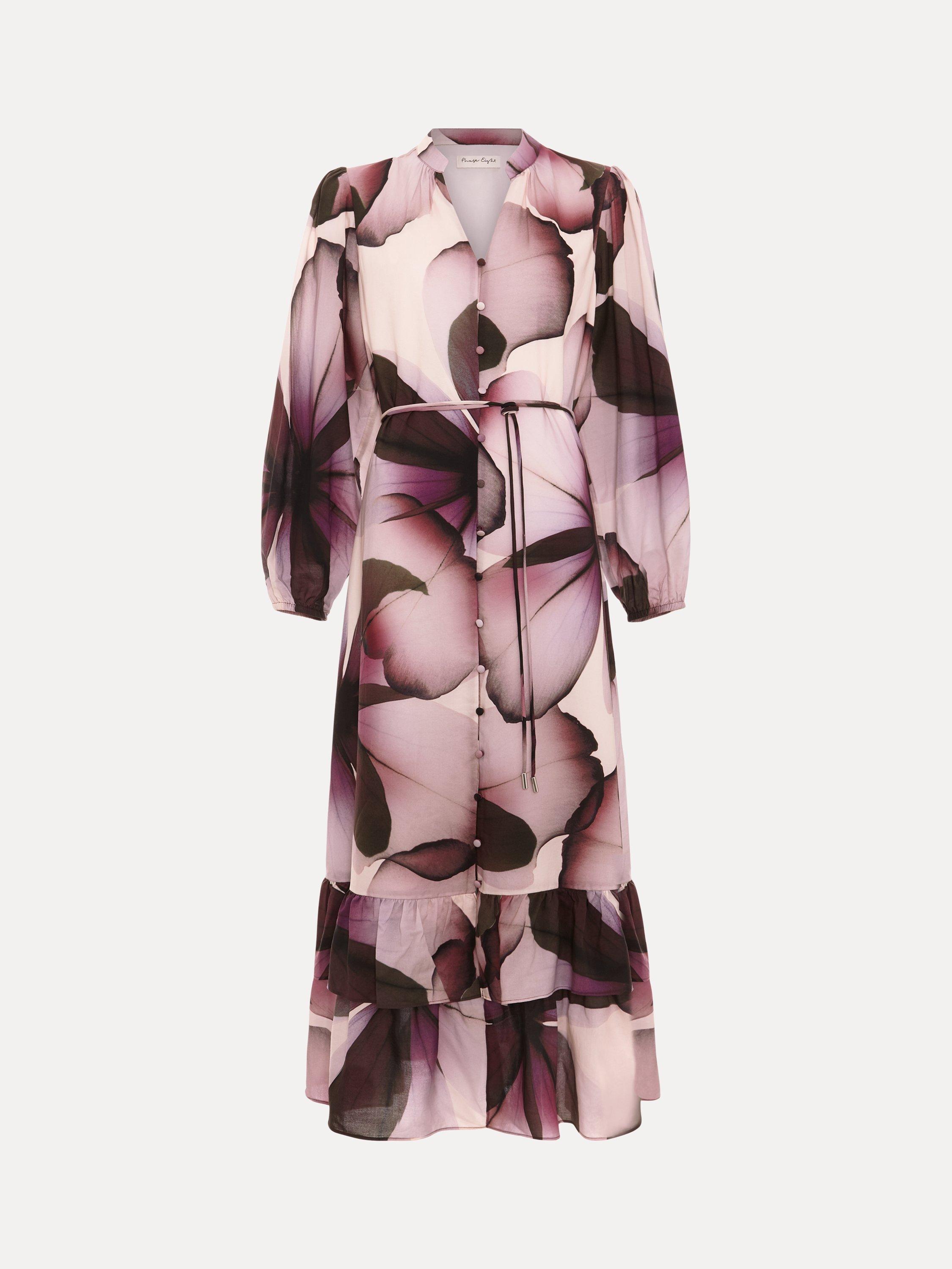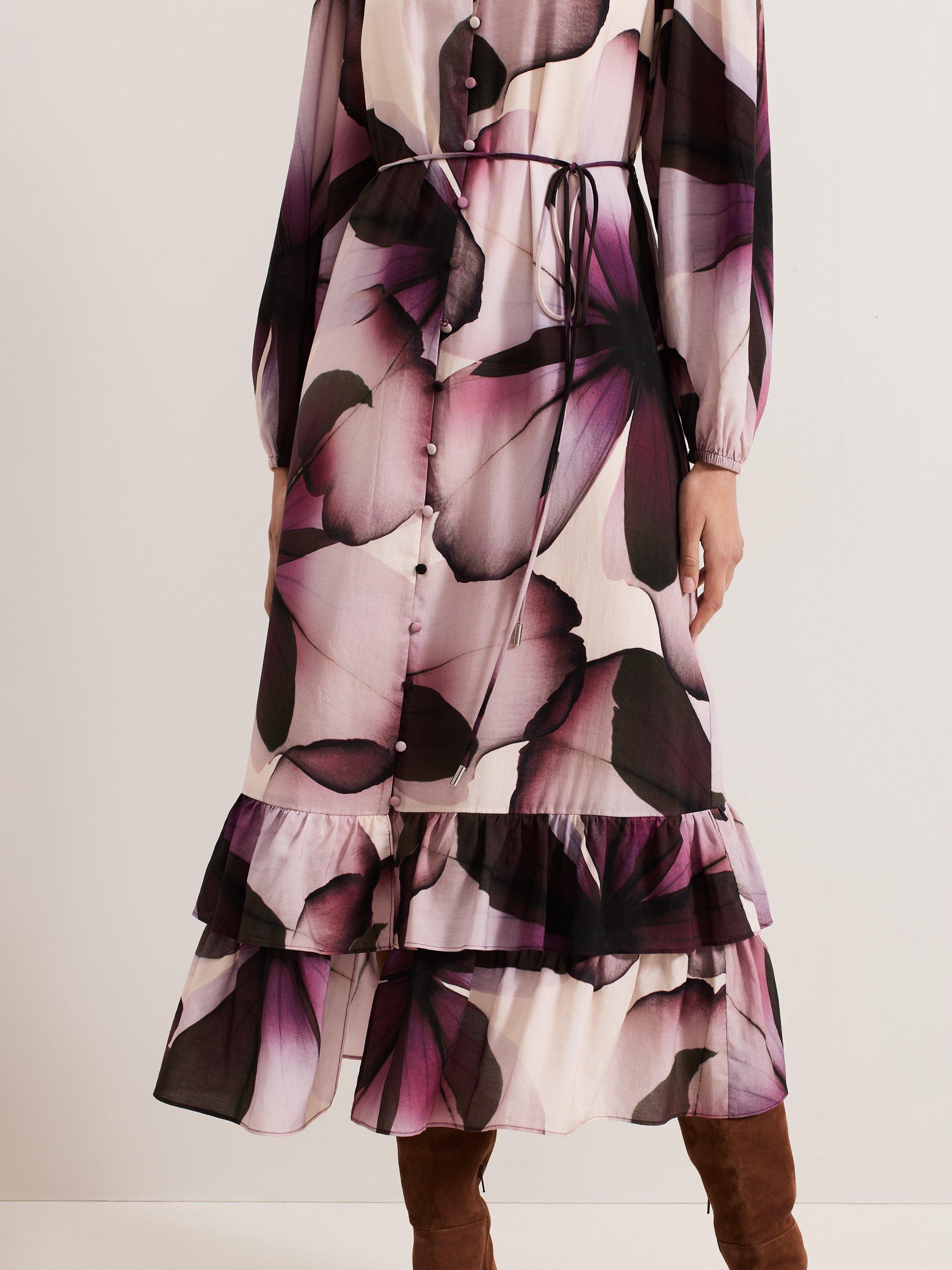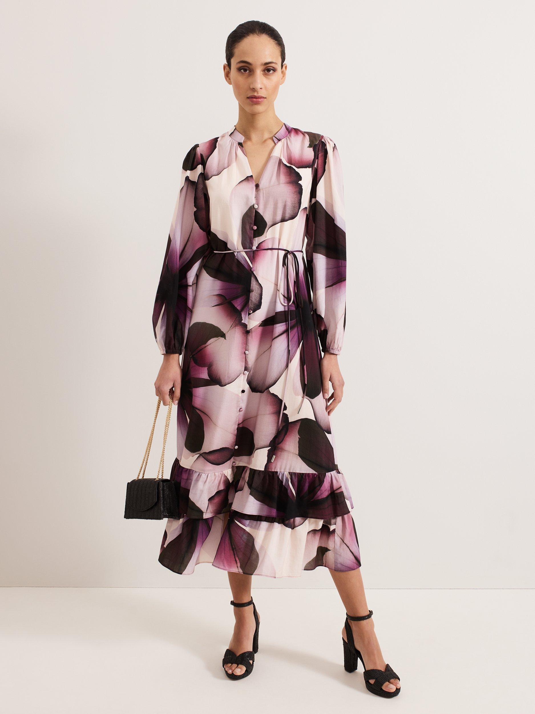 Elevate your wardrobe with the effortlessly adaptable Clarra dress. The soft floral print is perfect for transitioning through the seasons. Feminine blouson sleeves and ruffle detailing at the hem add subtle dimension to the contemporary shirt silhouette. We style ours with coordinating accessories for a look that's perfect for brunch, work or evenings out.