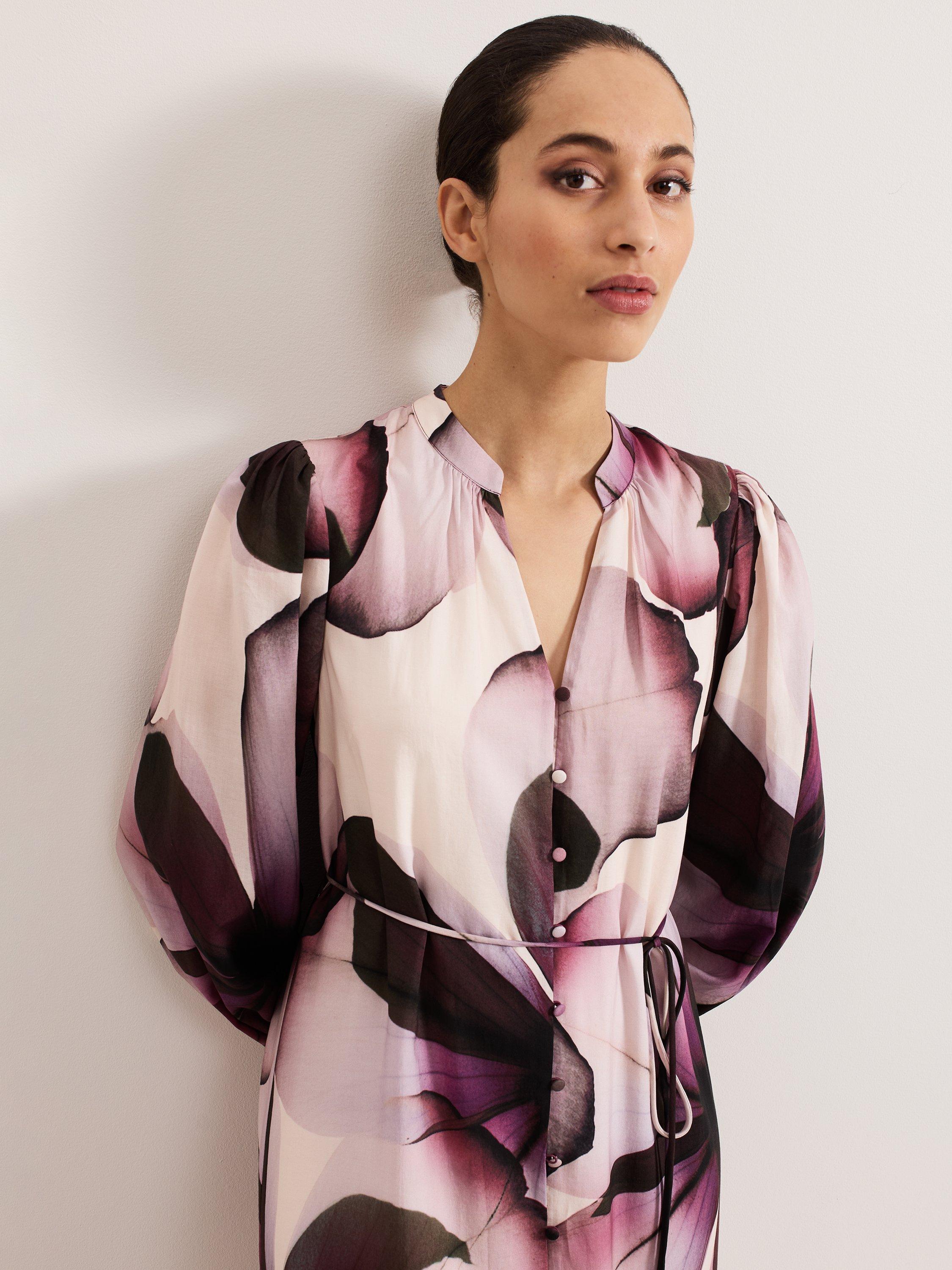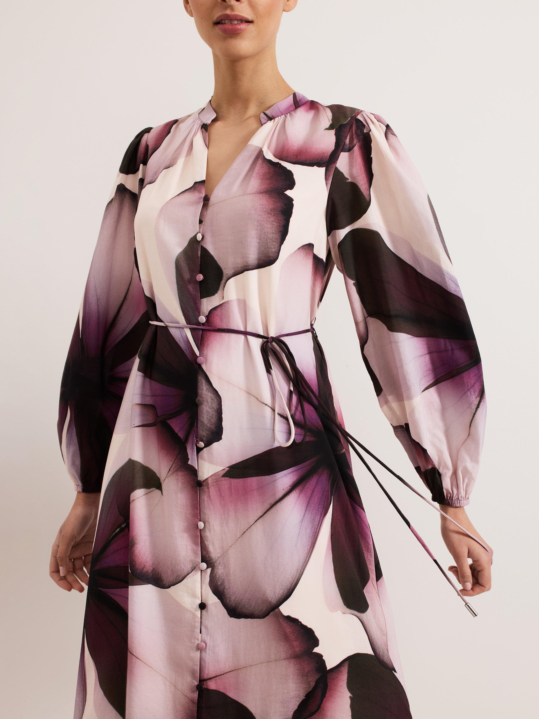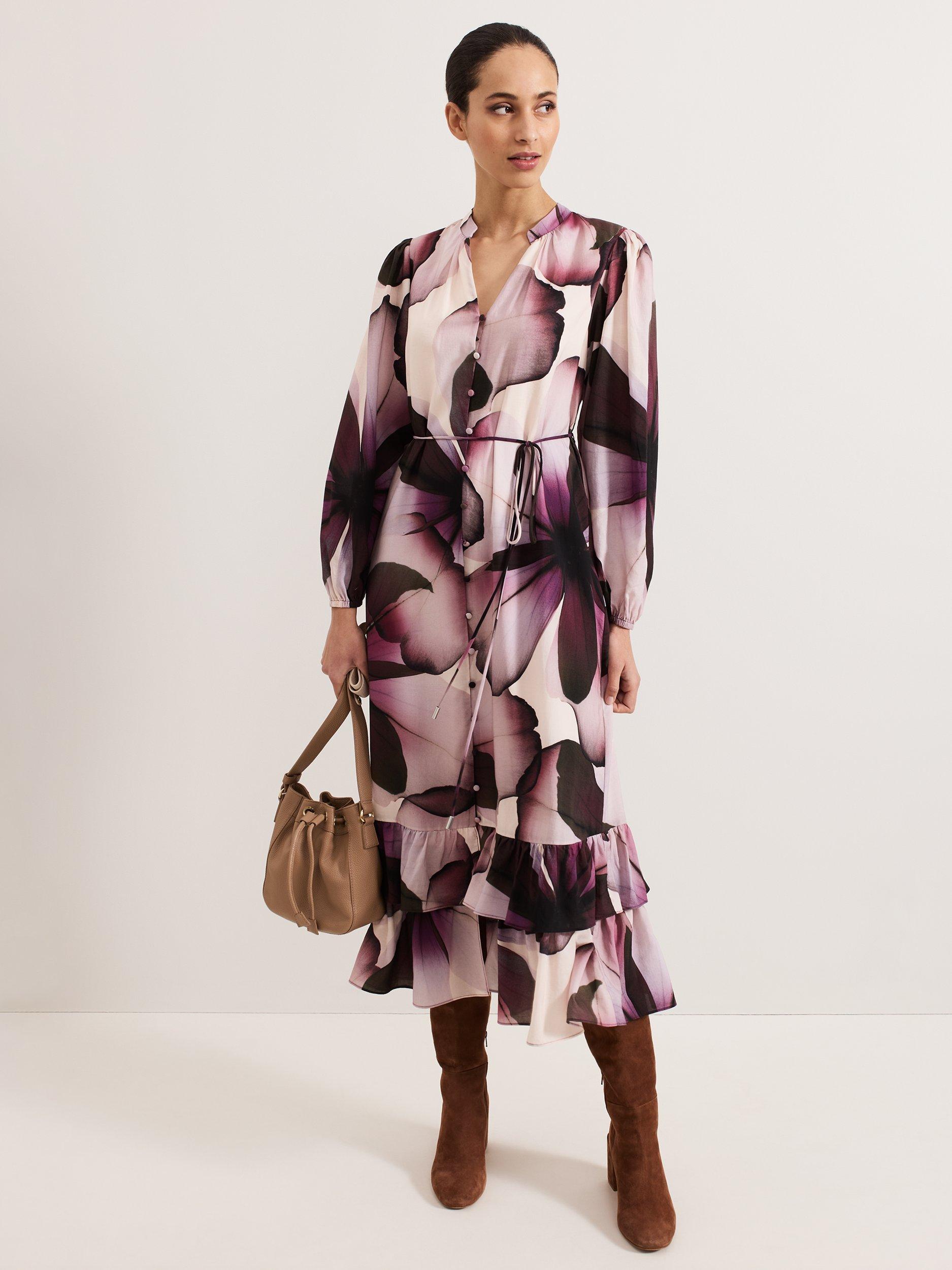 Elevate your wardrobe with the effortlessly adaptable Clarra dress. The soft floral print is perfect for transitioning through the seasons. Feminine blouson sleeves and ruffle detailing at the hem add subtle dimension to the contemporary shirt silhouette. We style ours with coordinating accessories for a look that's perfect for brunch, work or evenings out.