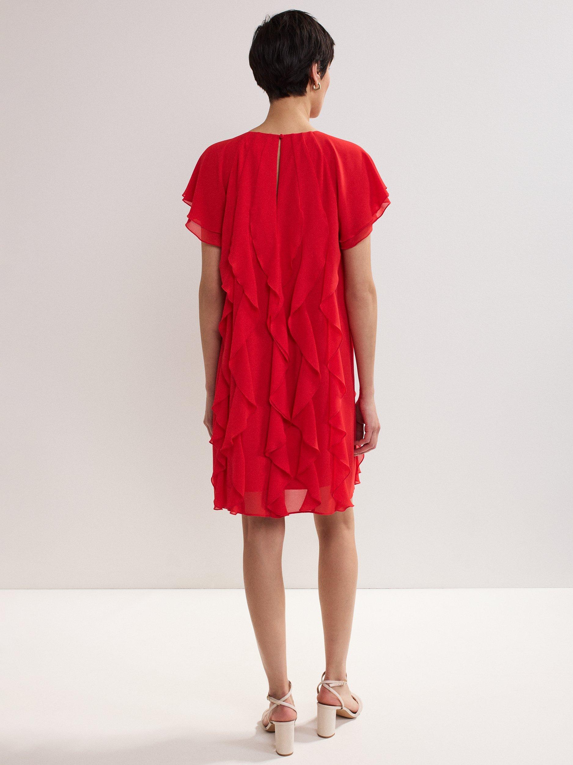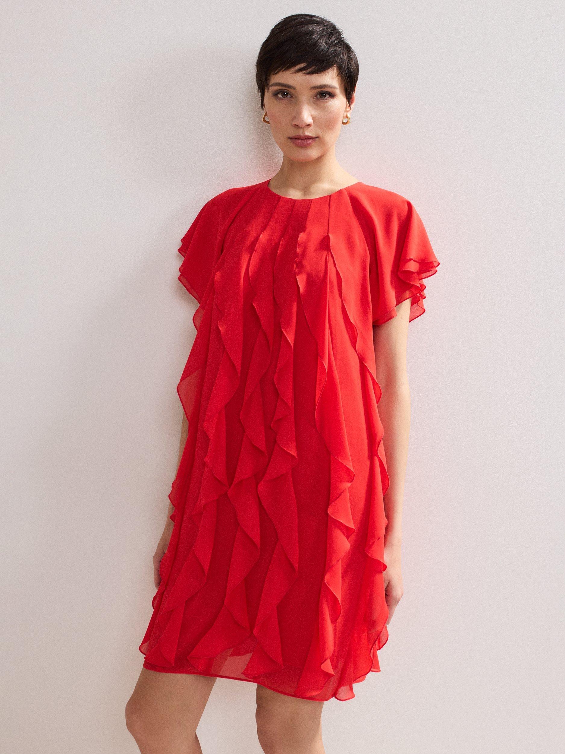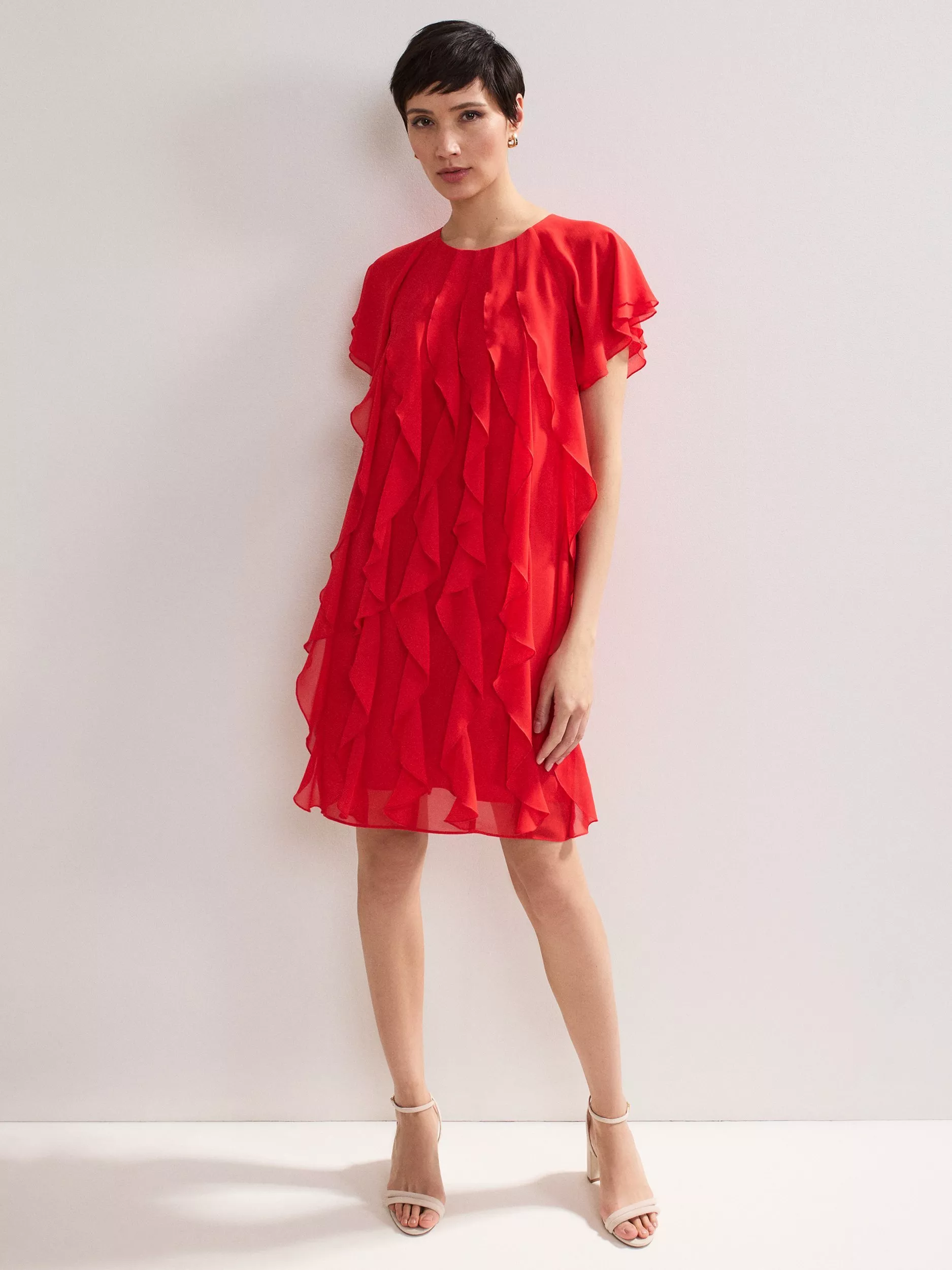 The perfect playful mini. This vibrant shift dress seamlessly blends comfort and style and is perfect for adding a pop of colour into your wardrobe. All over ruffle detailing provides a fun, feminine edge that is perfect for styling with heels for all your summer events.