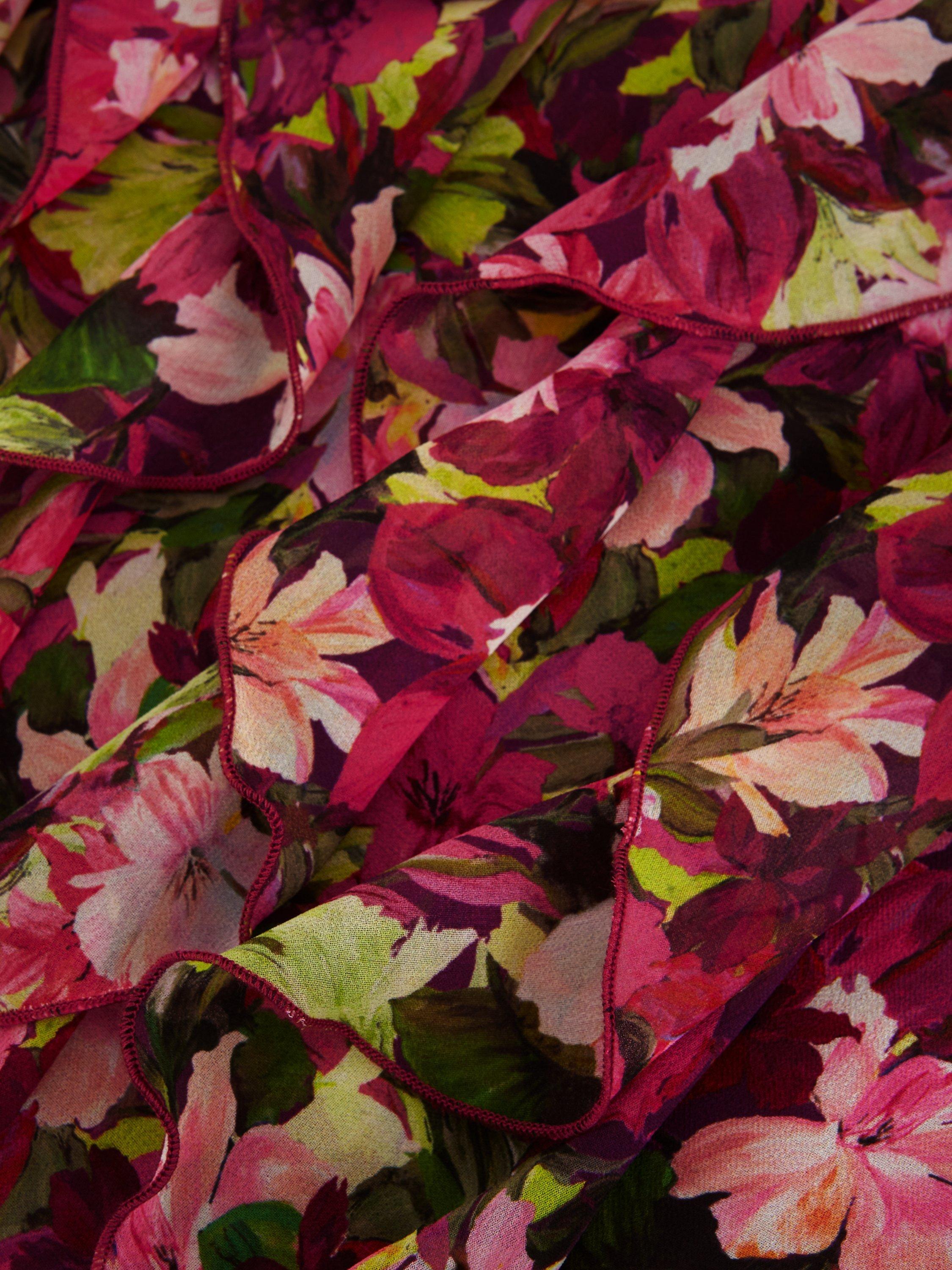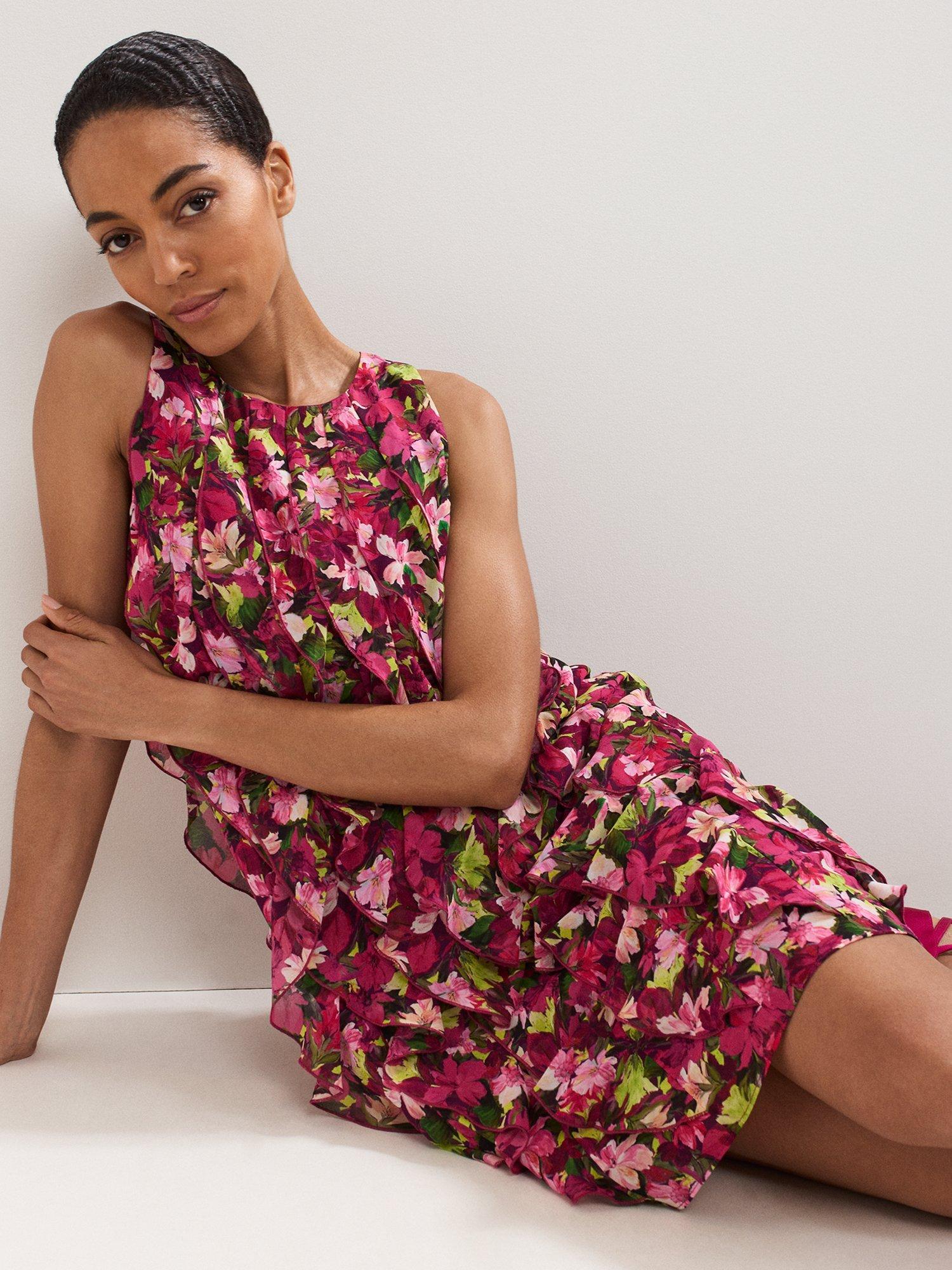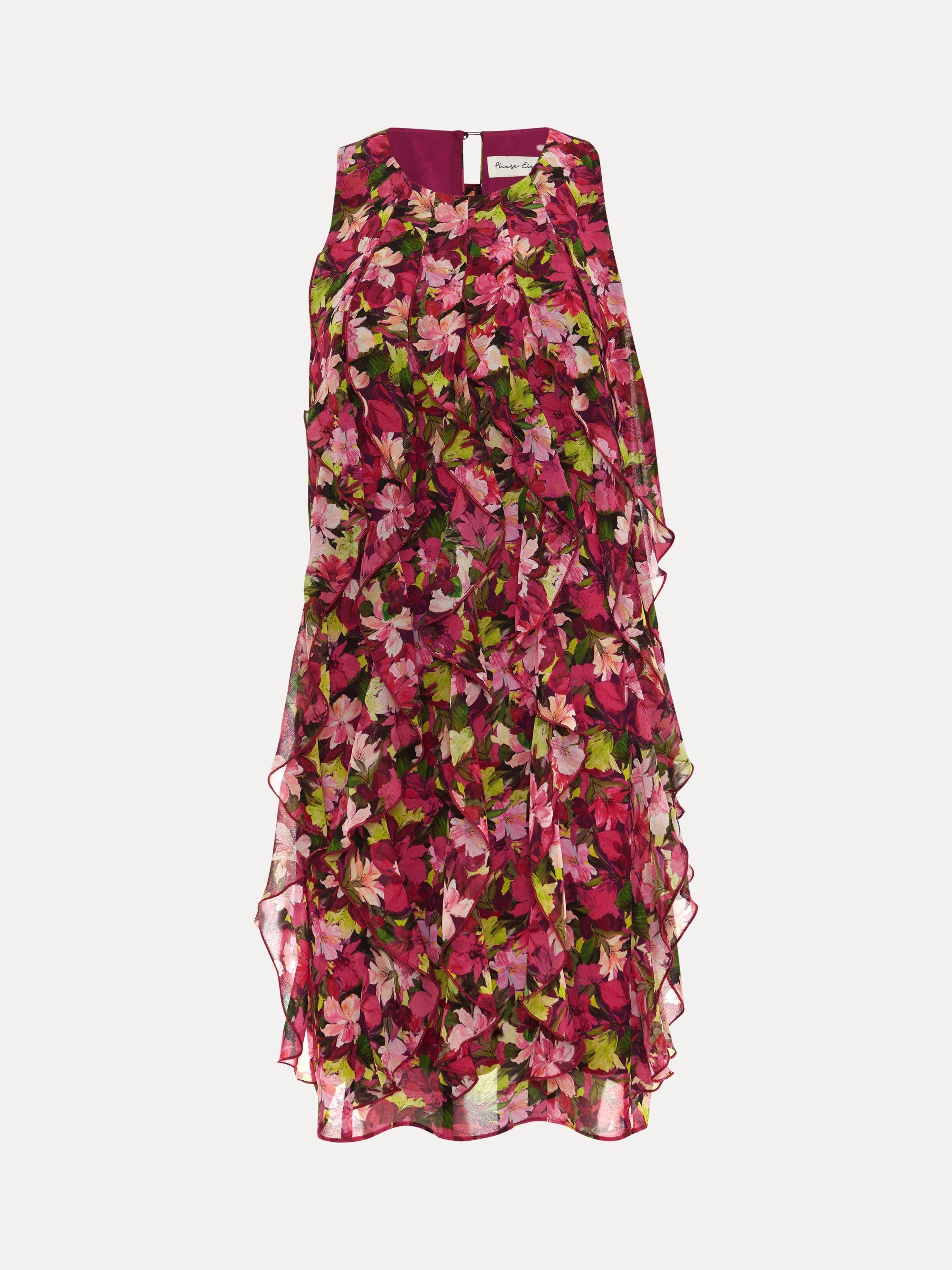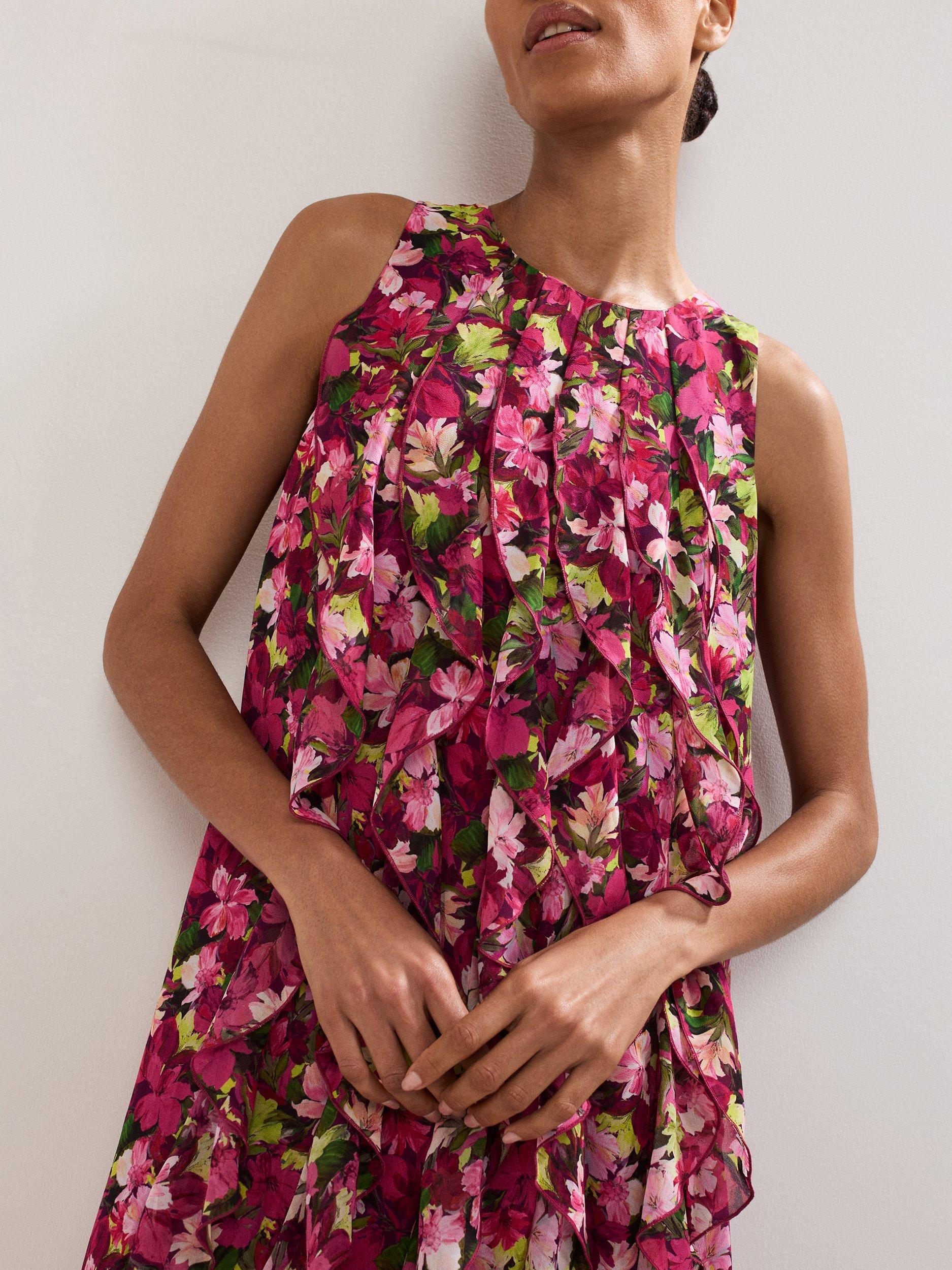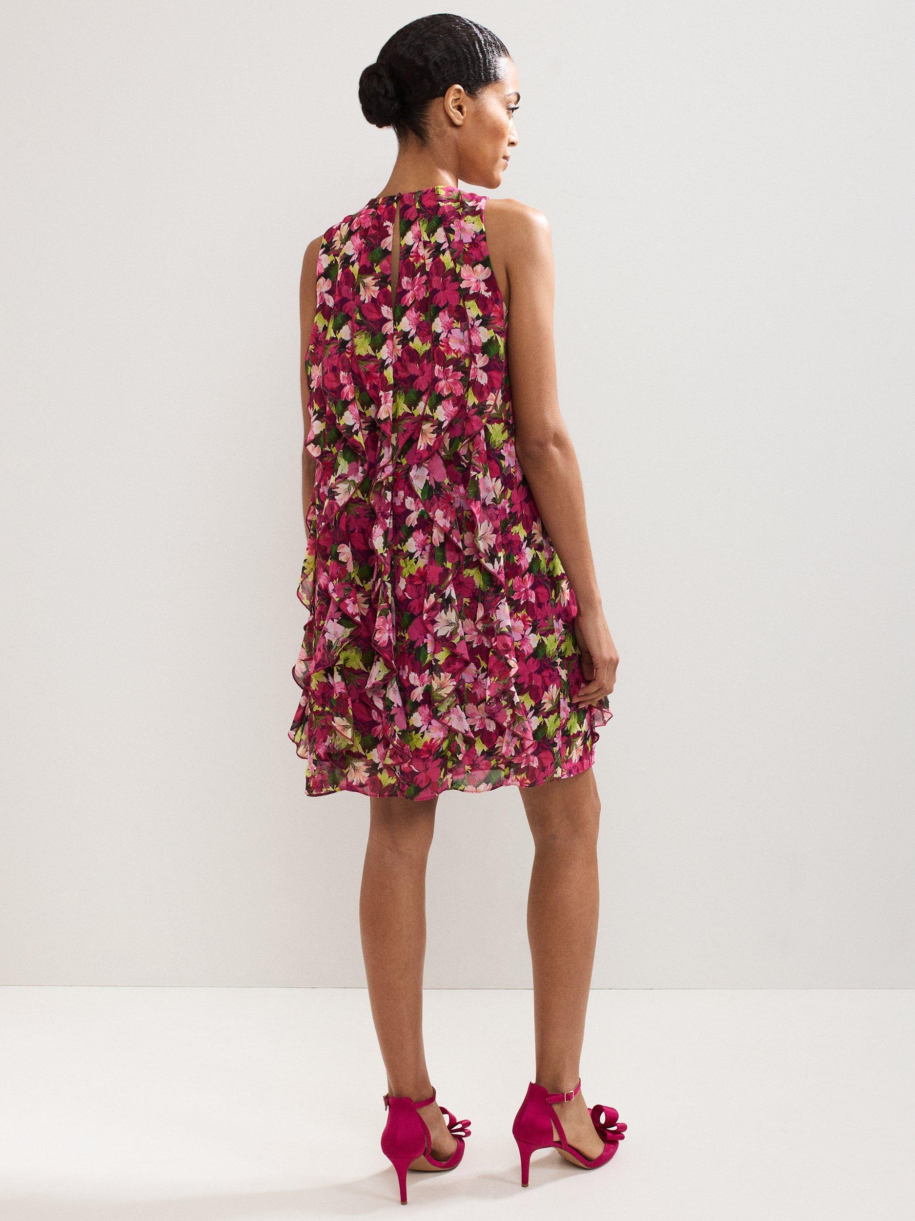 A flower lover's dream, this high impact mini dress is all about the details. Featuring a fun, feminine floral print in vibrant pinks with pops of green, and waterfall style ruffles adding movement and agility. Dress up with heels or dress down with your go-to white trainers.