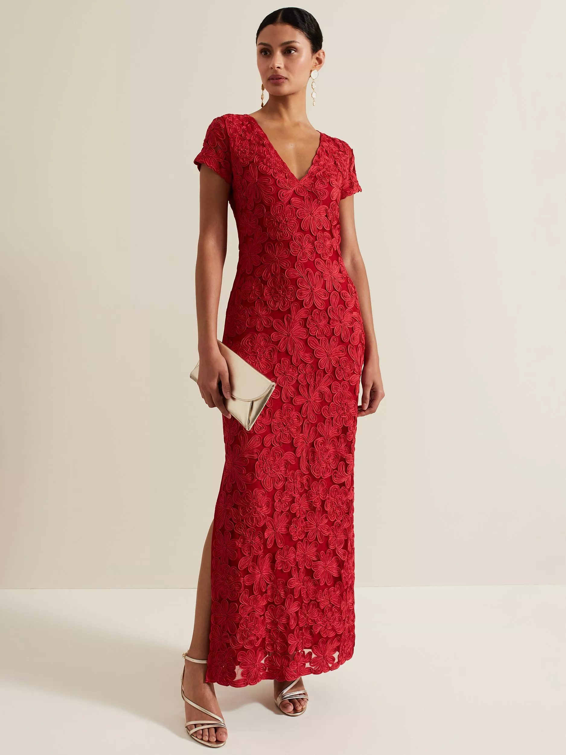 With an elegant fitted silhouette and flared hem this dress is embroidered throughout with signature tapework lace and features a feminine V-neckline.