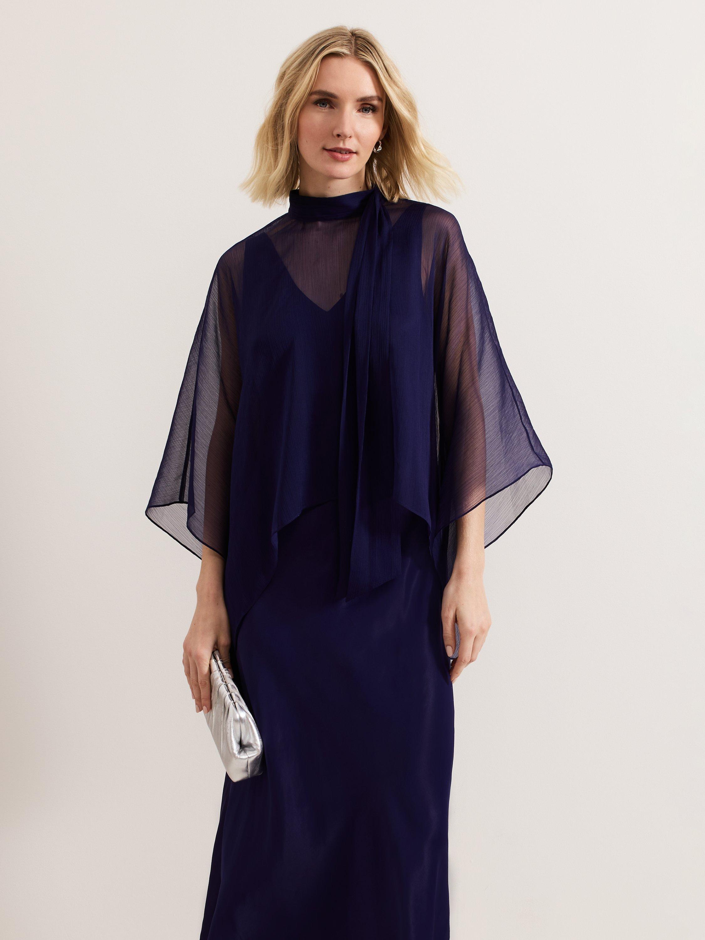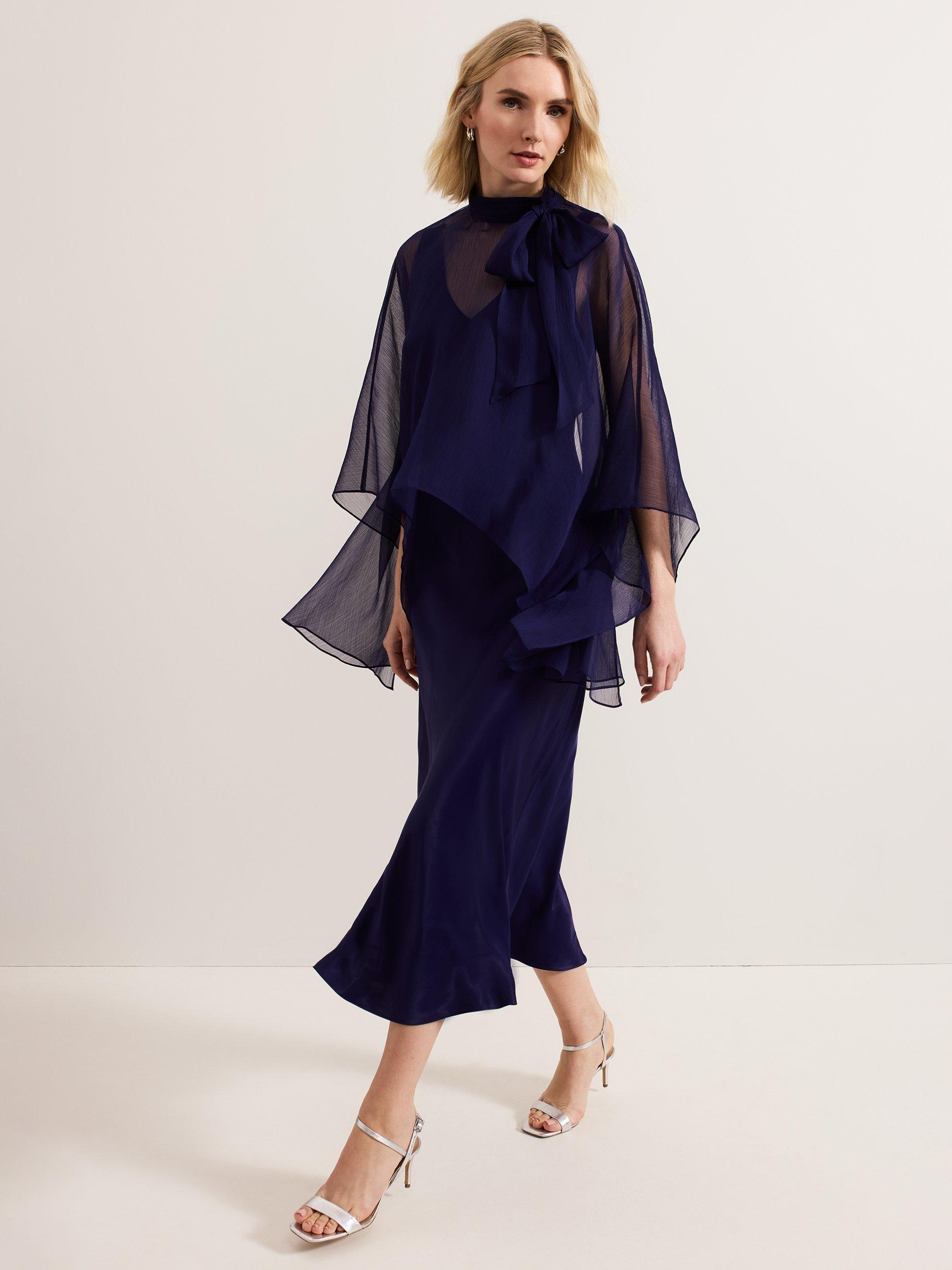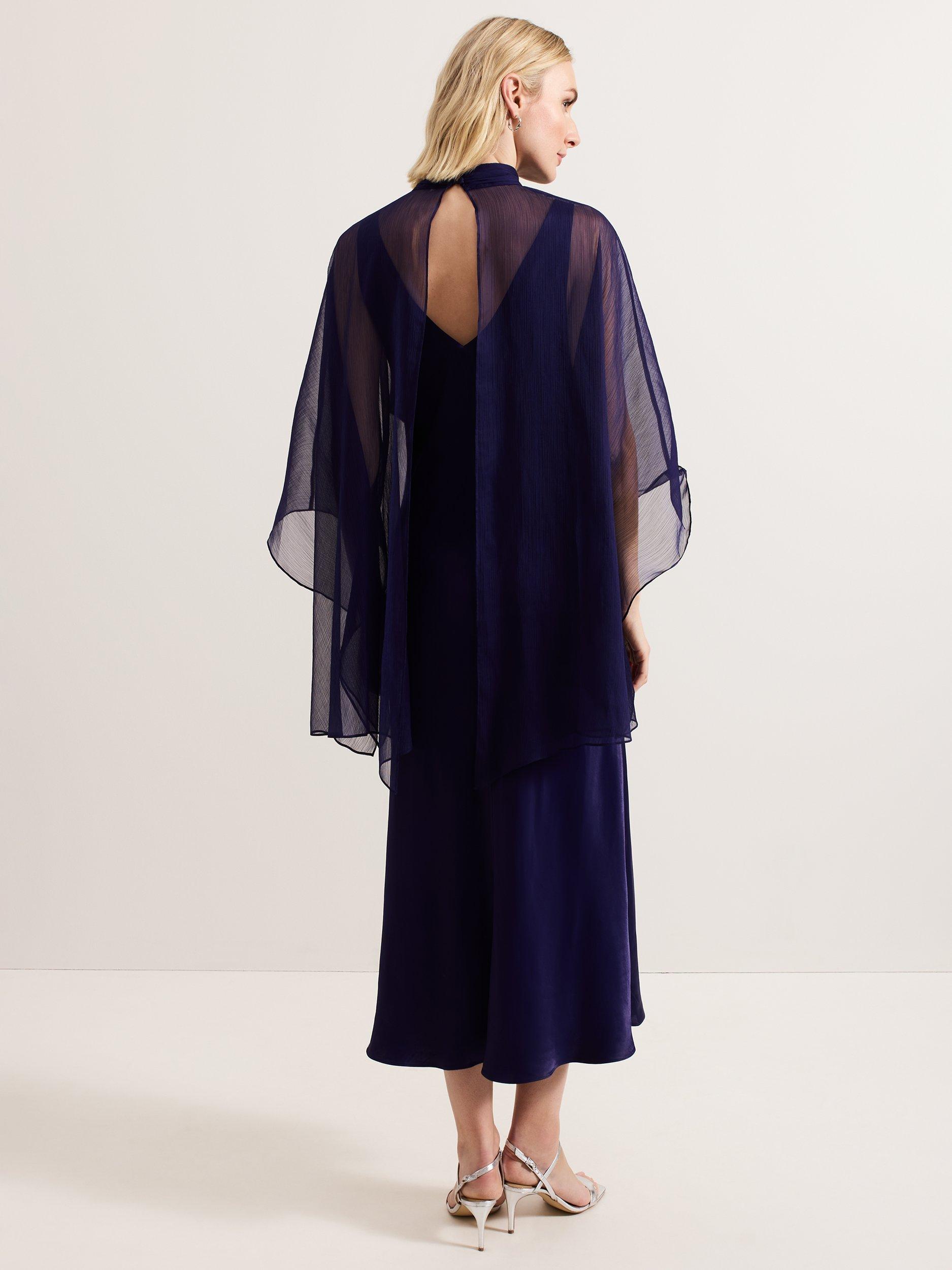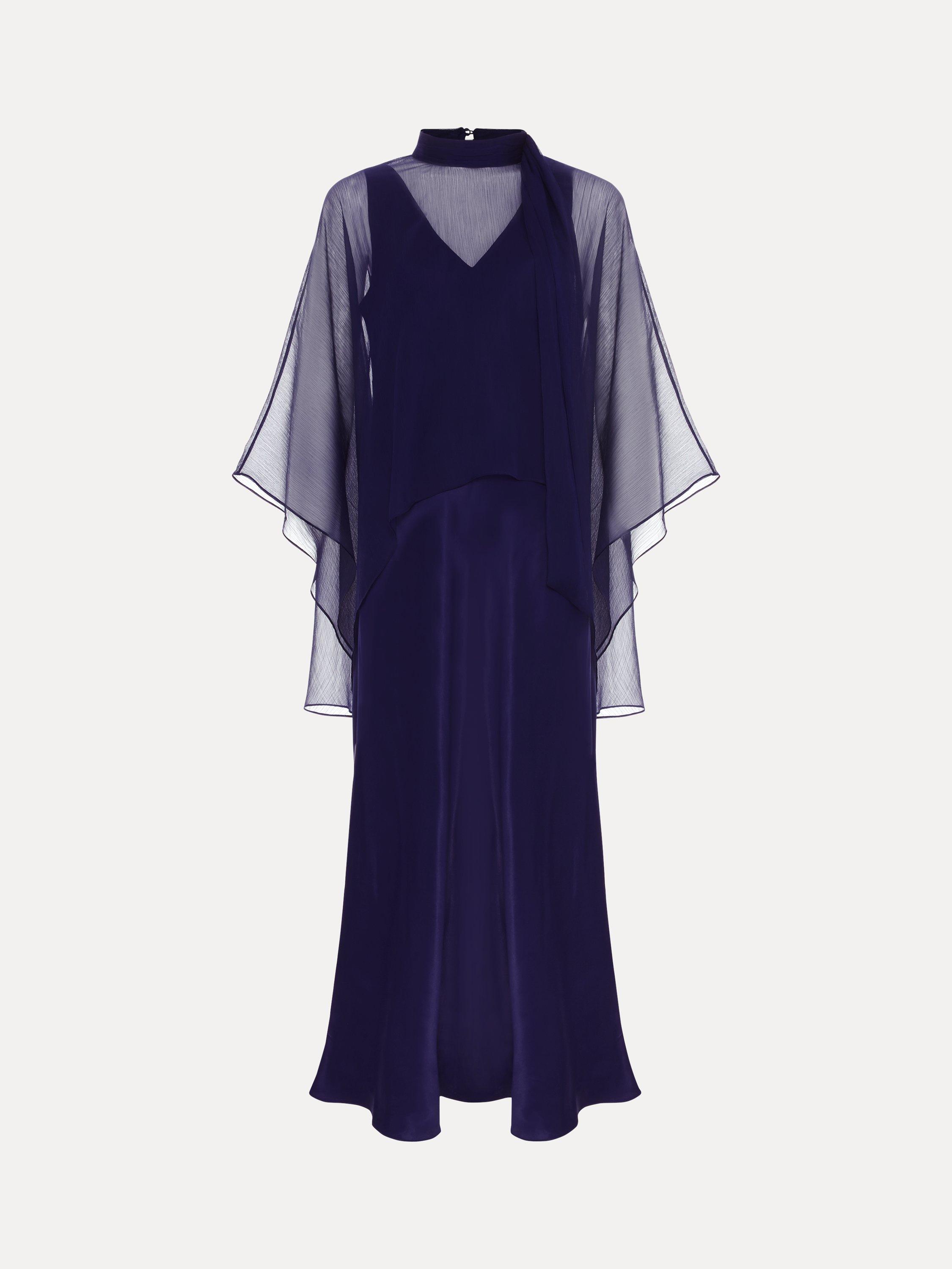 Modern and minimal, the Kyra dress is an effortless event style. In a stunning shade, this slip dress is crafted from a luxurious satin material that creates a subtle sheen. Wear on its own or style with the matching semi-sheer overlay that creates an elegant cape effect, perfect for when some added drama is called for.
