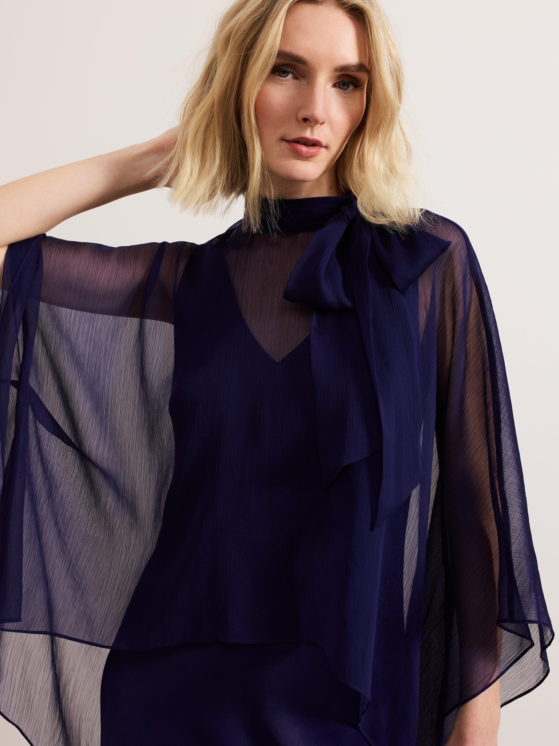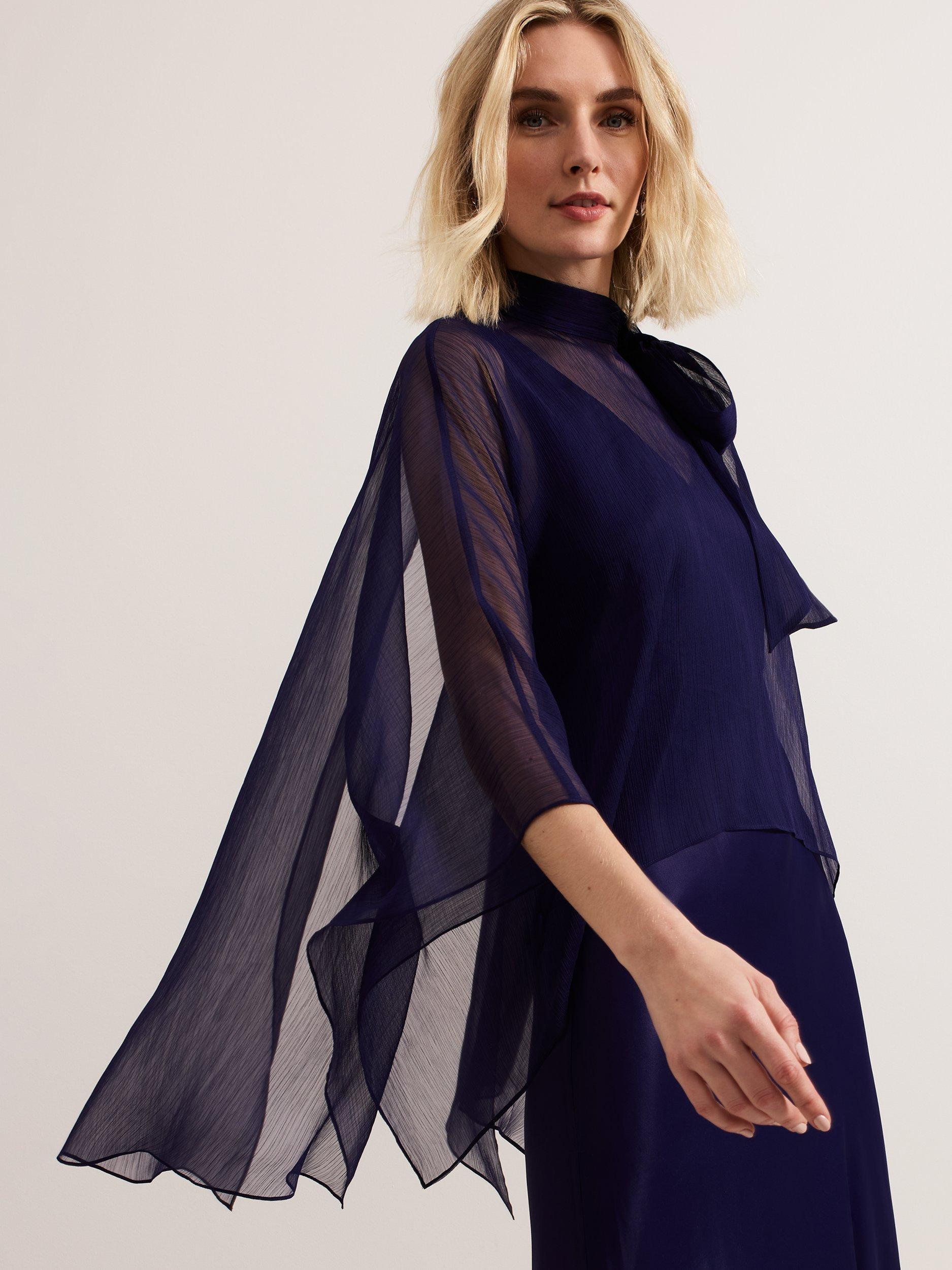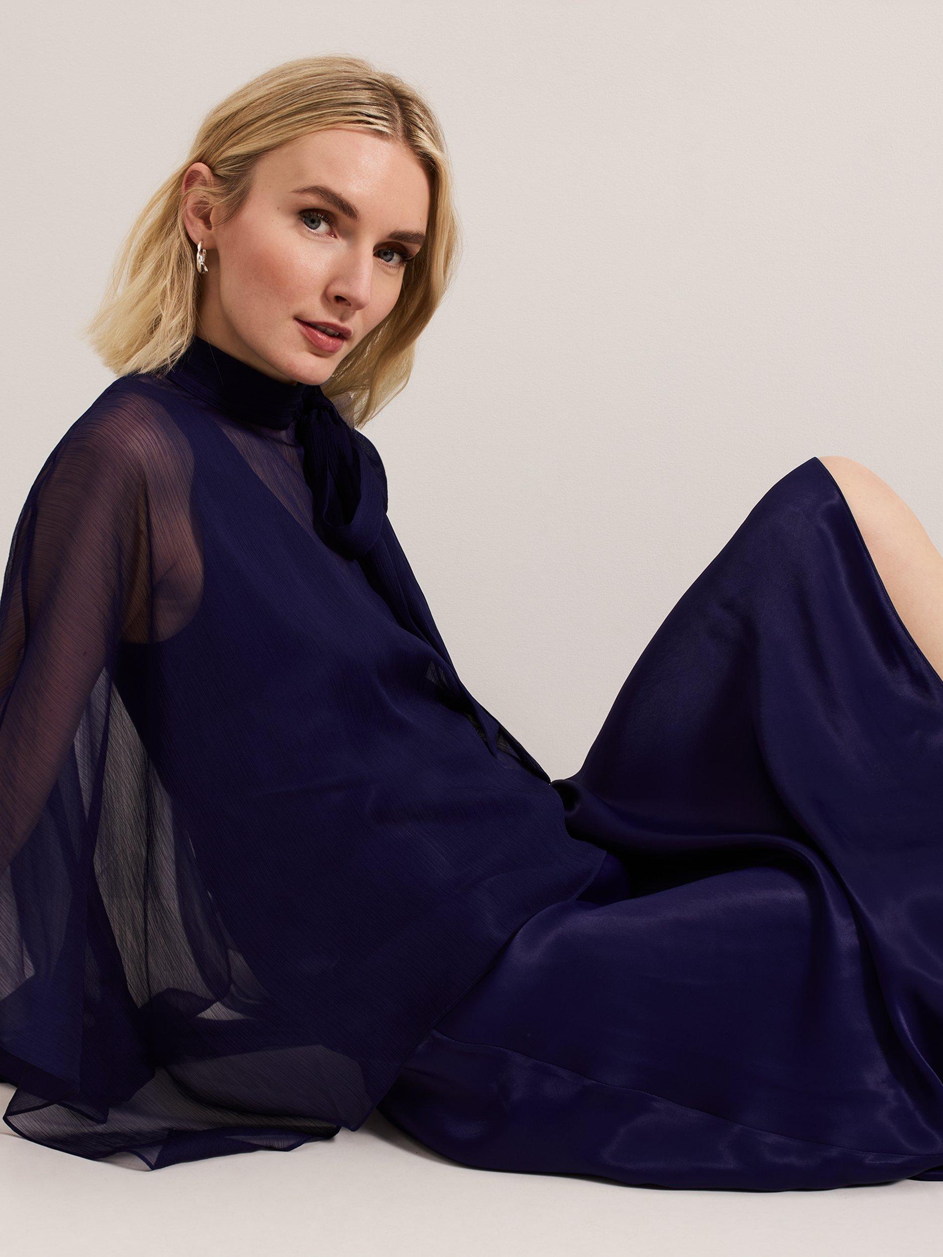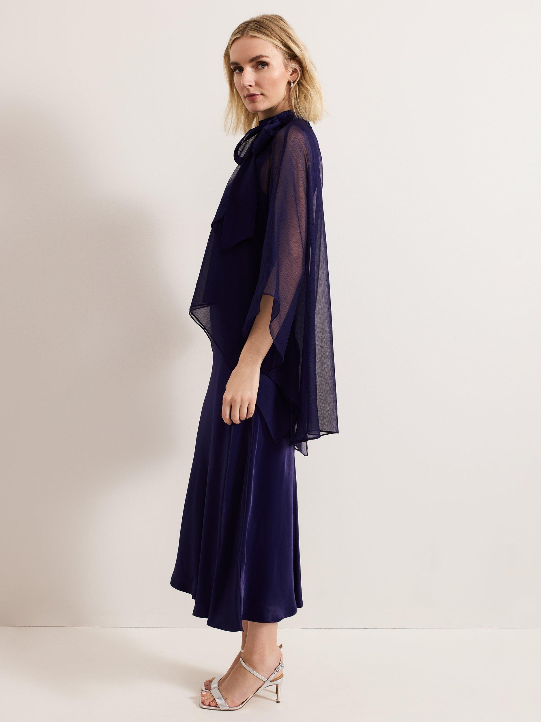 Modern and minimal, the Kyra dress is an effortless event style. In a stunning shade, this slip dress is crafted from a luxurious satin material that creates a subtle sheen. Wear on its own or style with the matching semi-sheer overlay that creates an elegant cape effect, perfect for when some added drama is called for.
