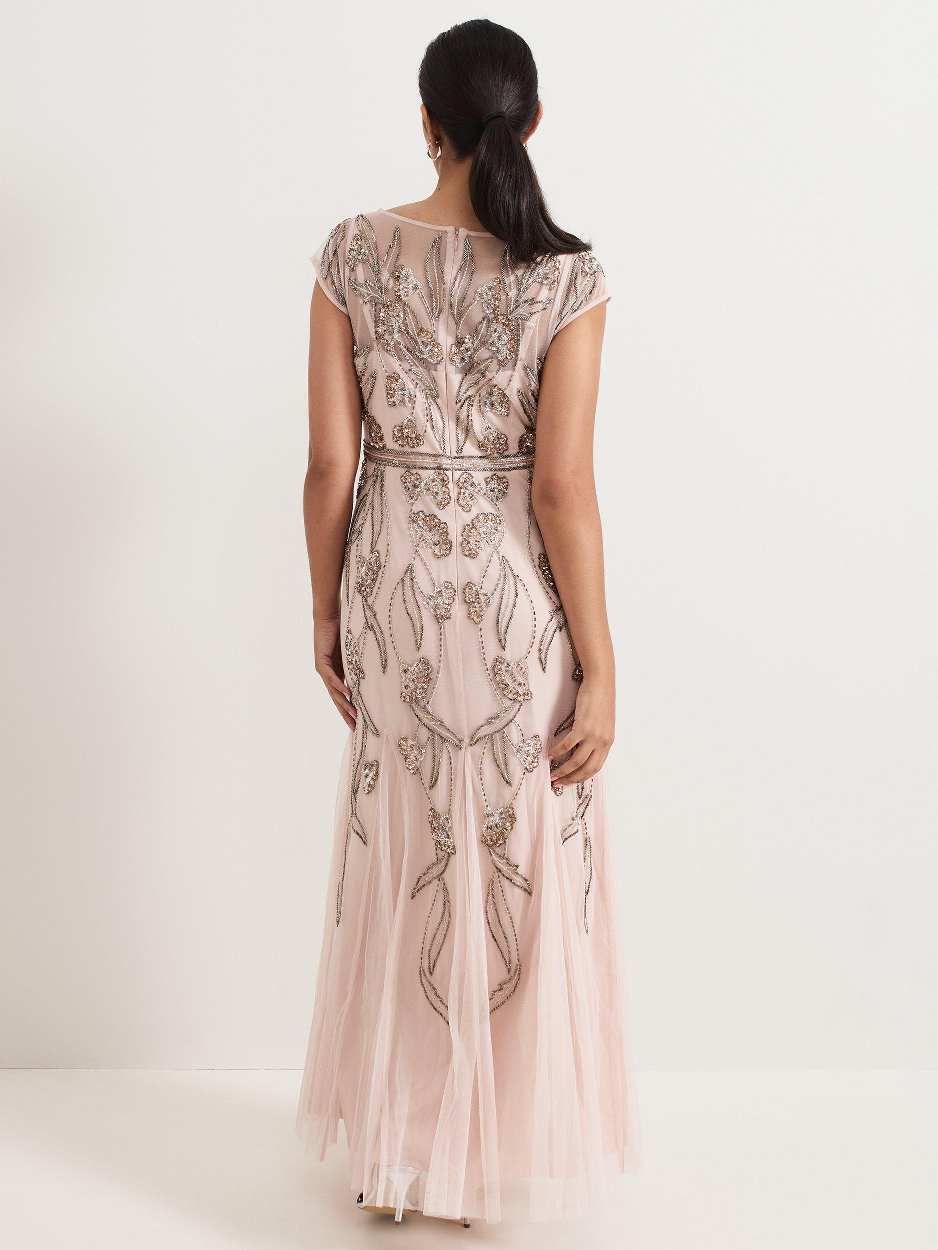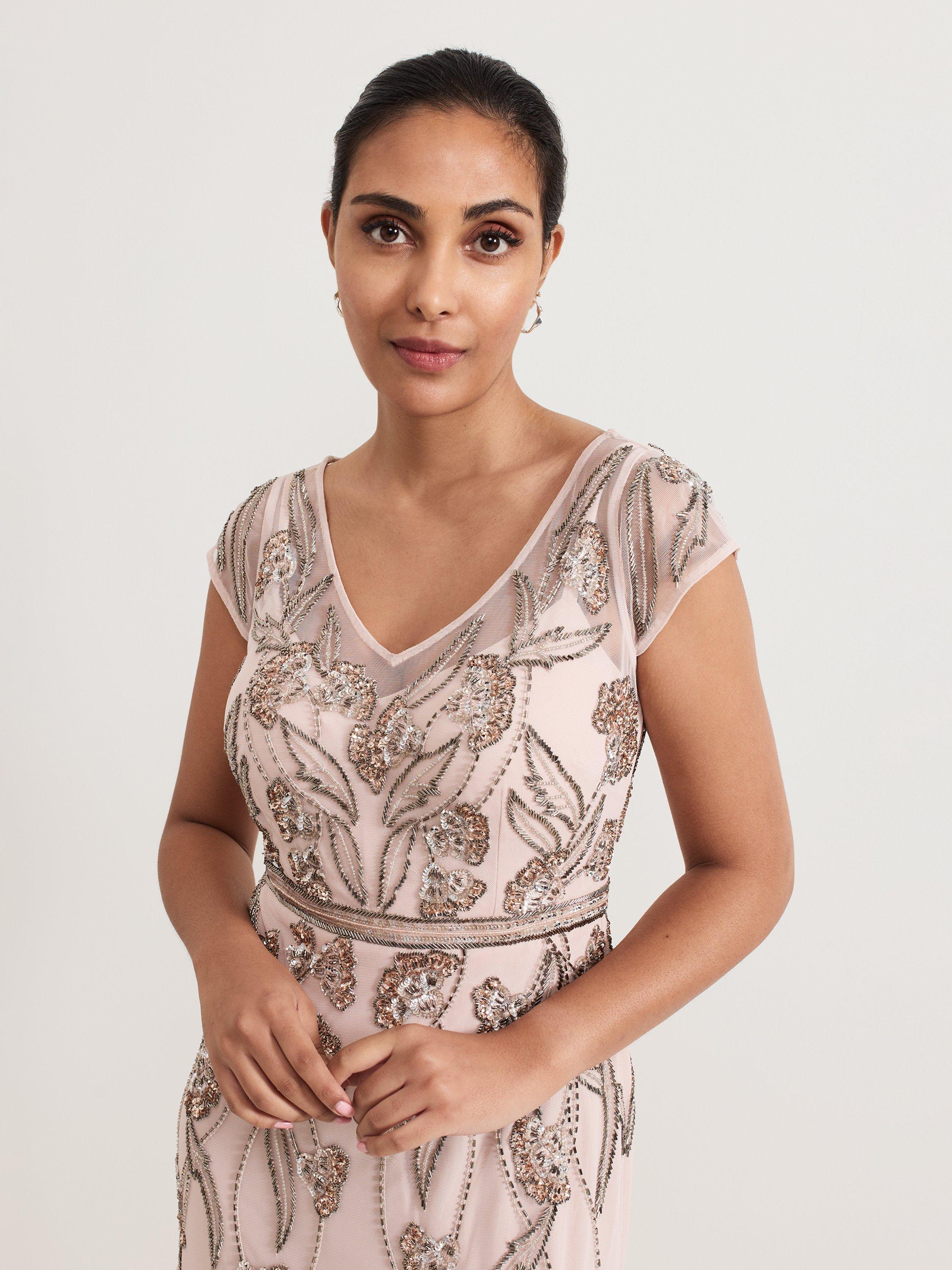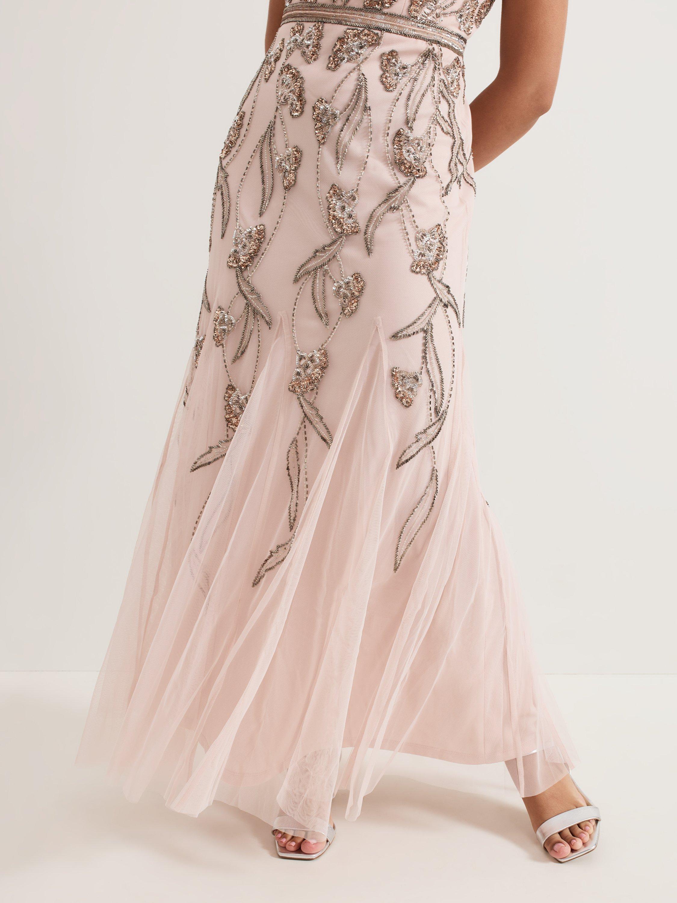 The Evonne dress is perfect for high glamour occasions. The mesh overlay is embellished with beaded detailing in a feminine leaf print. The waistband detail subtly highlights your figure before flowing through to an elegant maxi skirt. Pair with matching accessories for a standout event look.