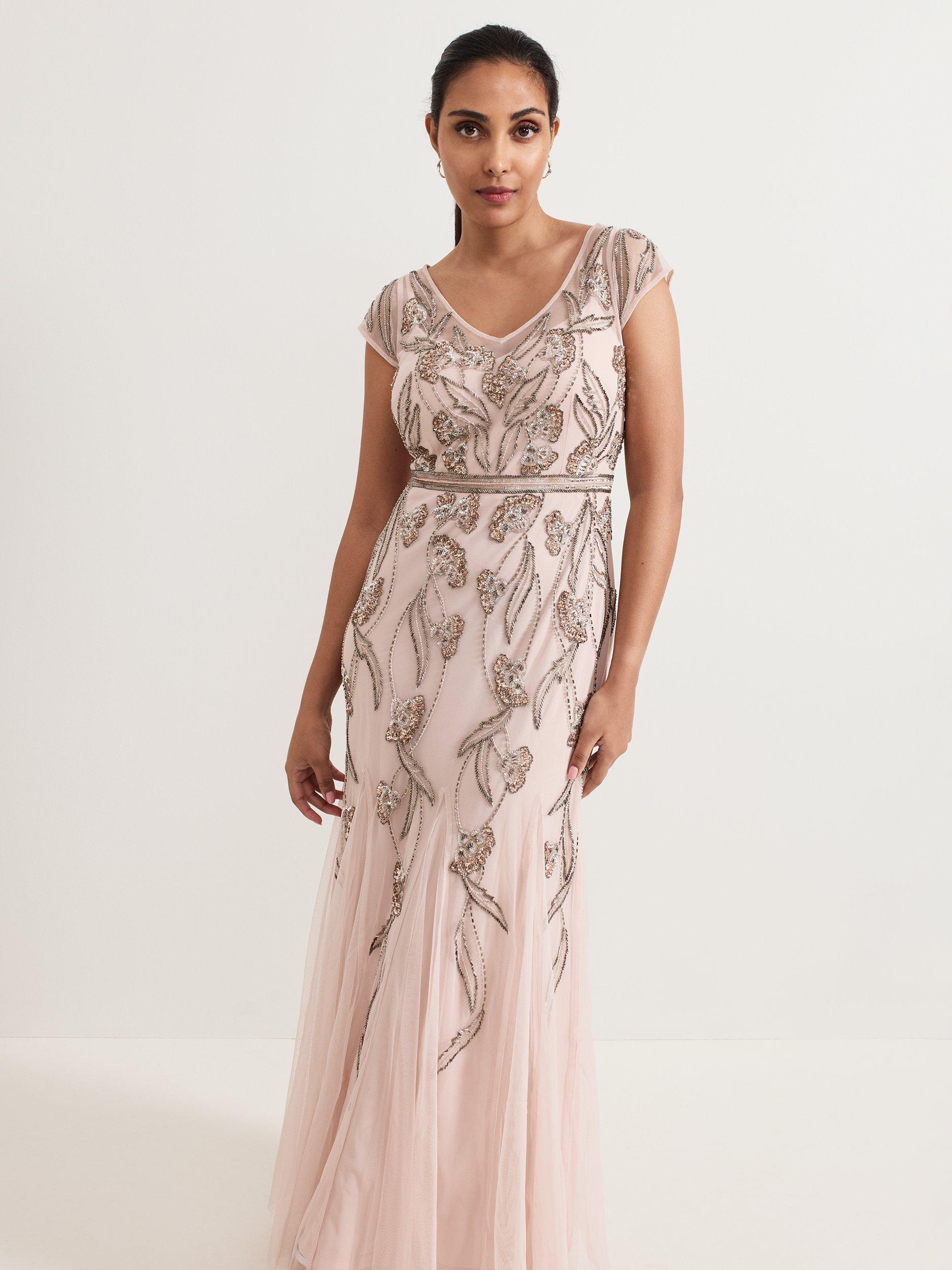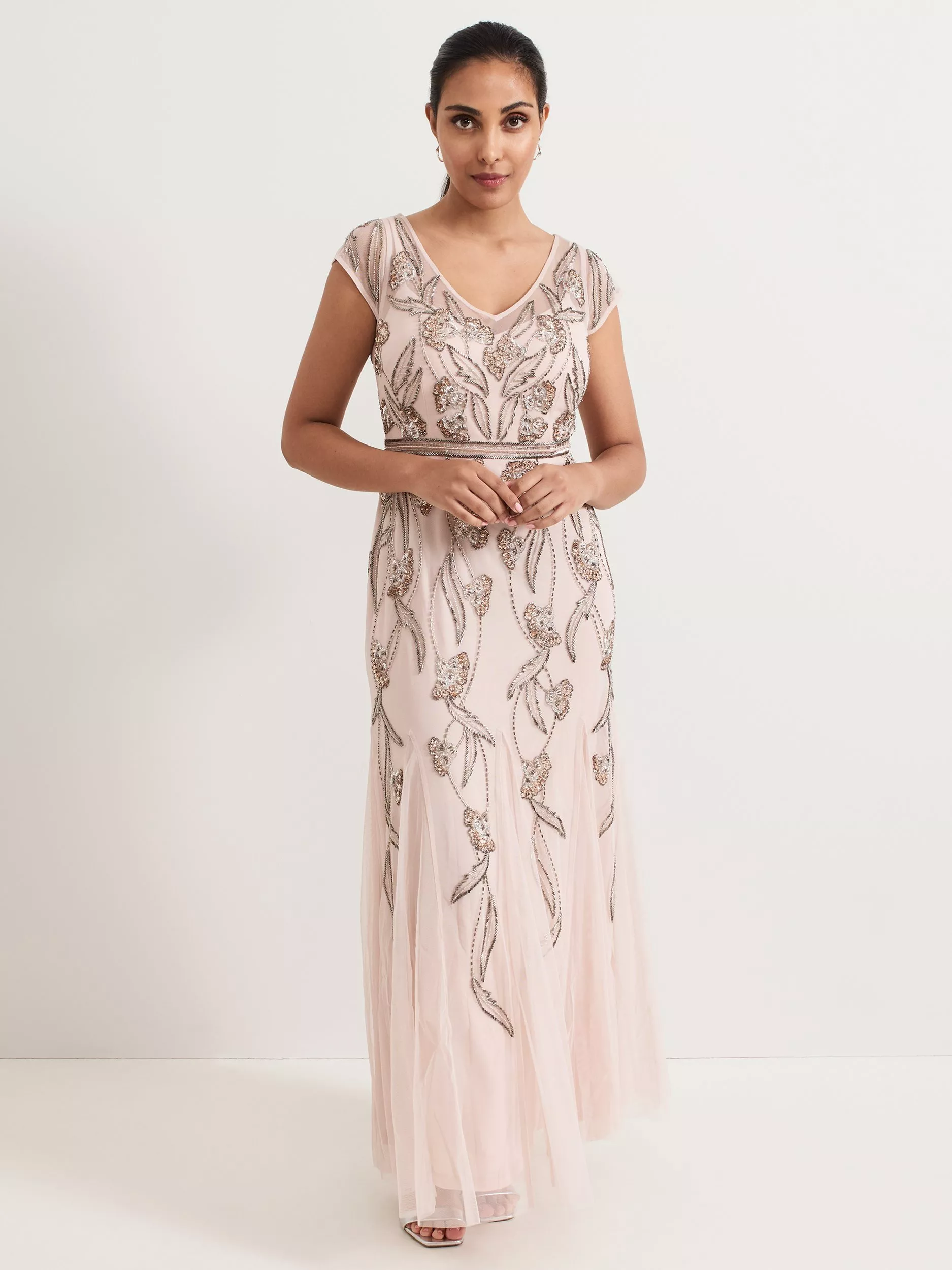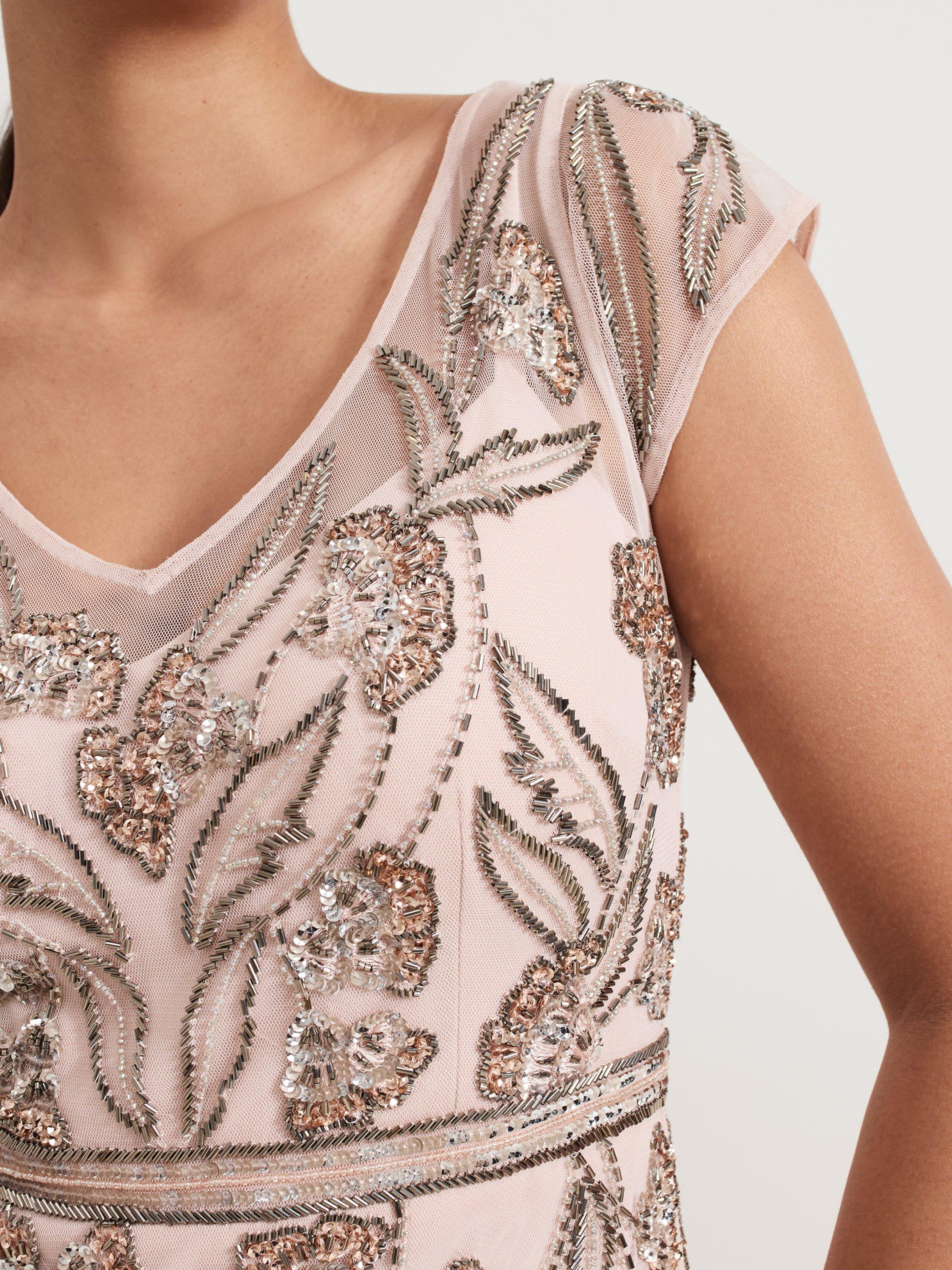 The Evonne dress is perfect for high glamour occasions. The mesh overlay is embellished with beaded detailing in a feminine leaf print. The waistband detail subtly highlights your figure before flowing through to an elegant maxi skirt. Pair with matching accessories for a standout event look.