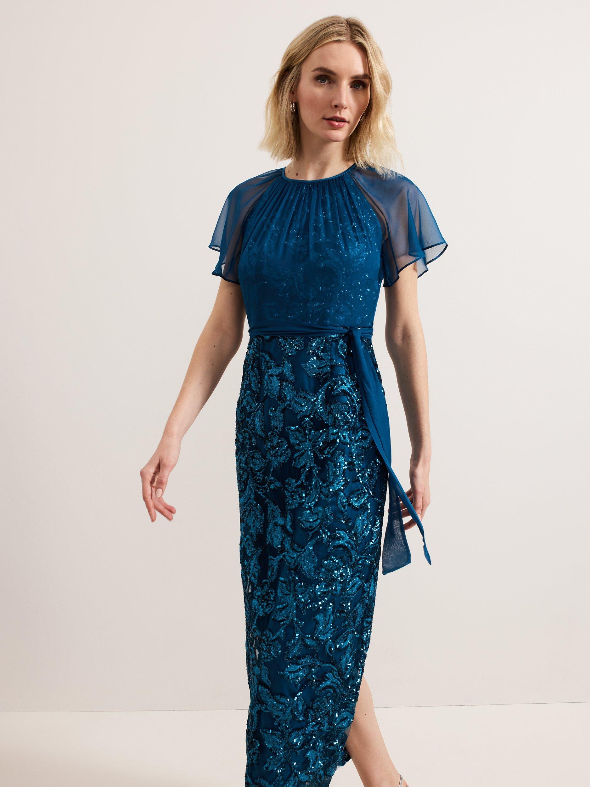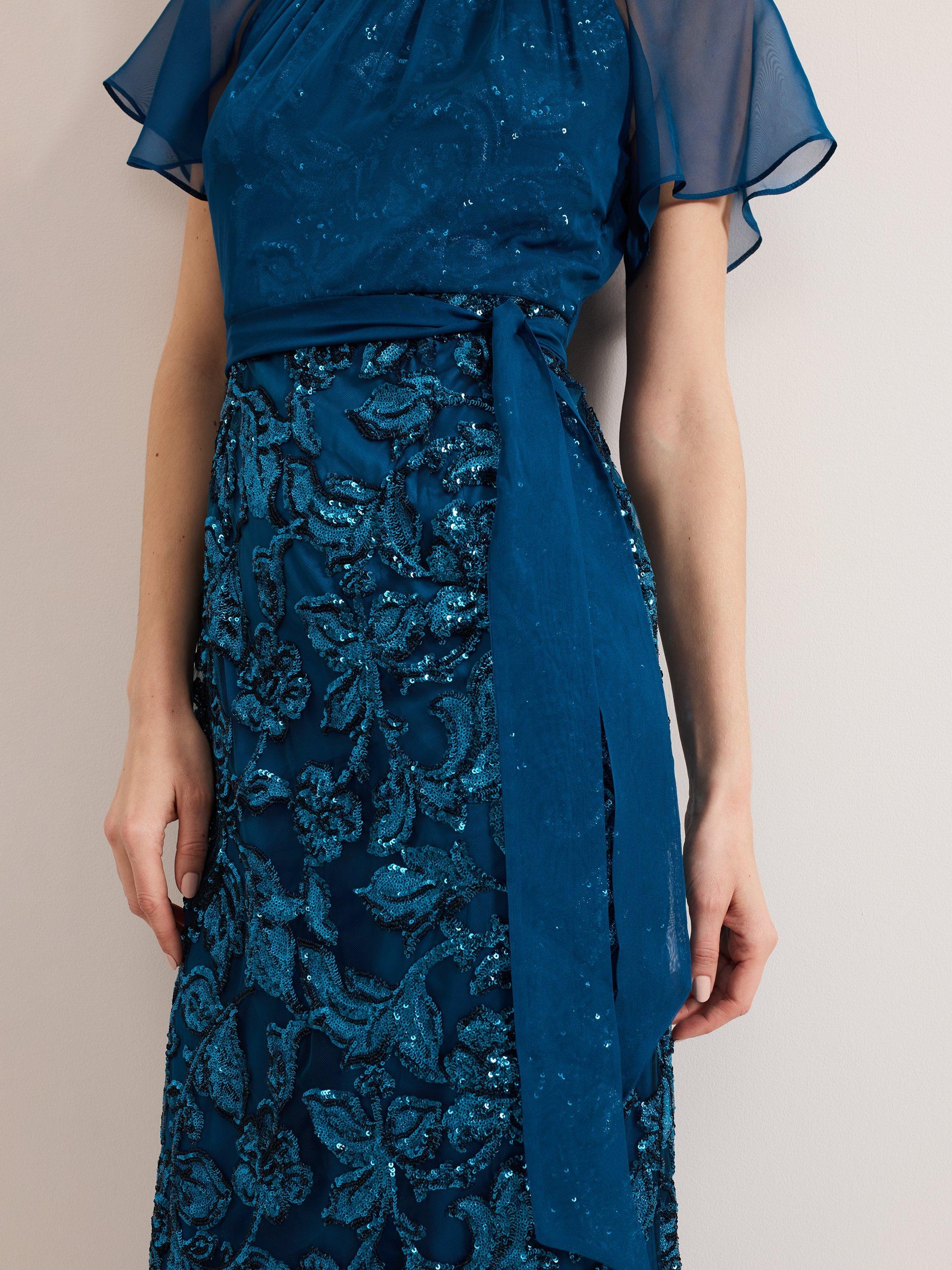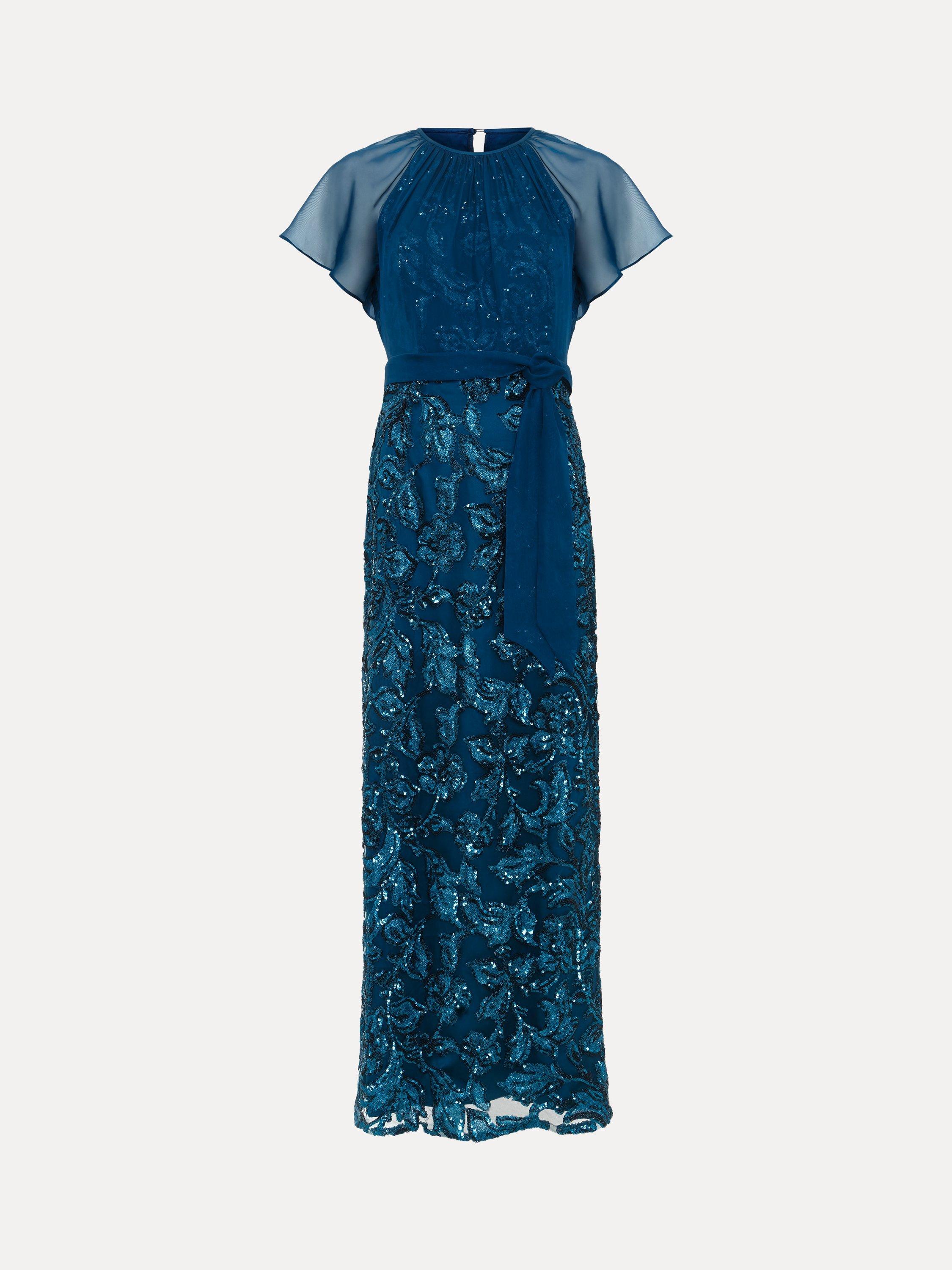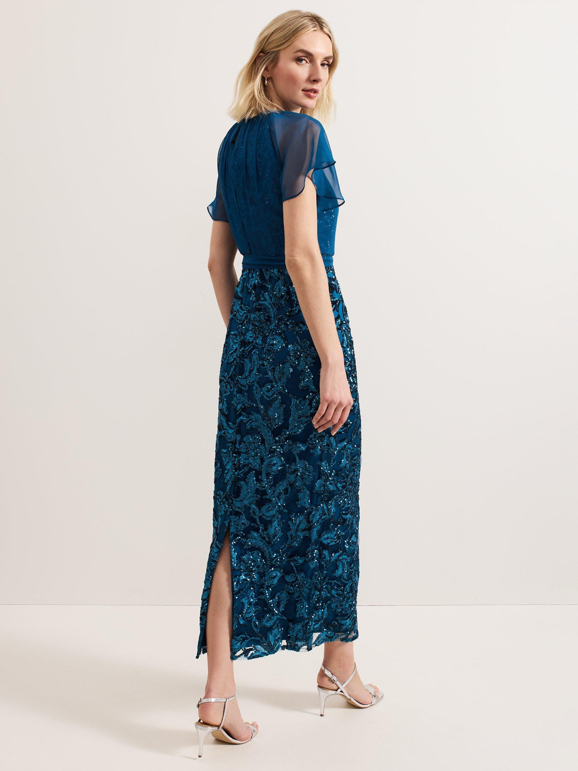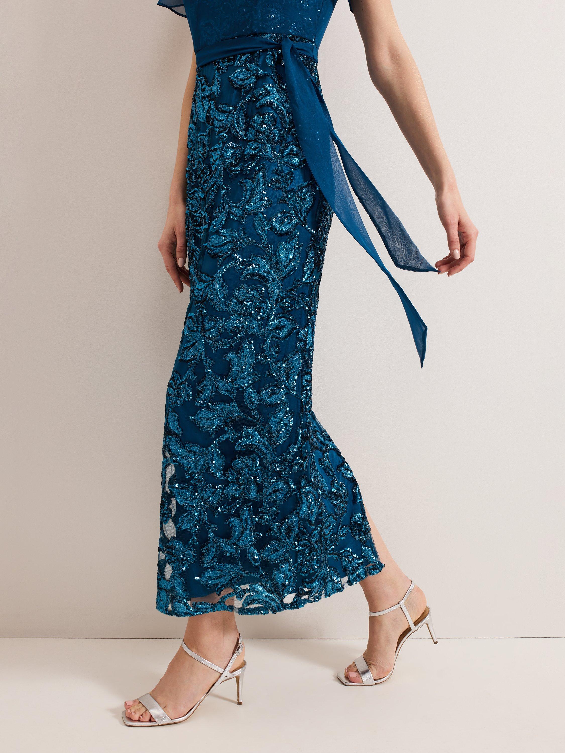 Embellished with all over sequin detailing, the Talia dress is perfect for high glamour events. Finished with a semi-sheer chiffon top and tie detail it falls through to a flattering column maxi skirt with a split detail at the back for added allure. Style with simple accessories and let the shimmering style speak for itself.