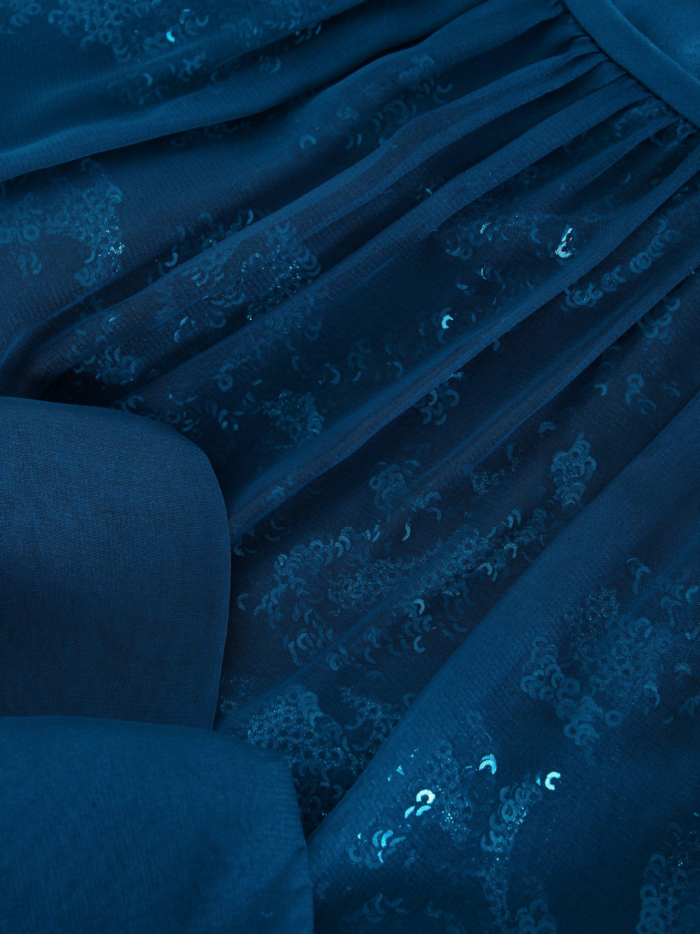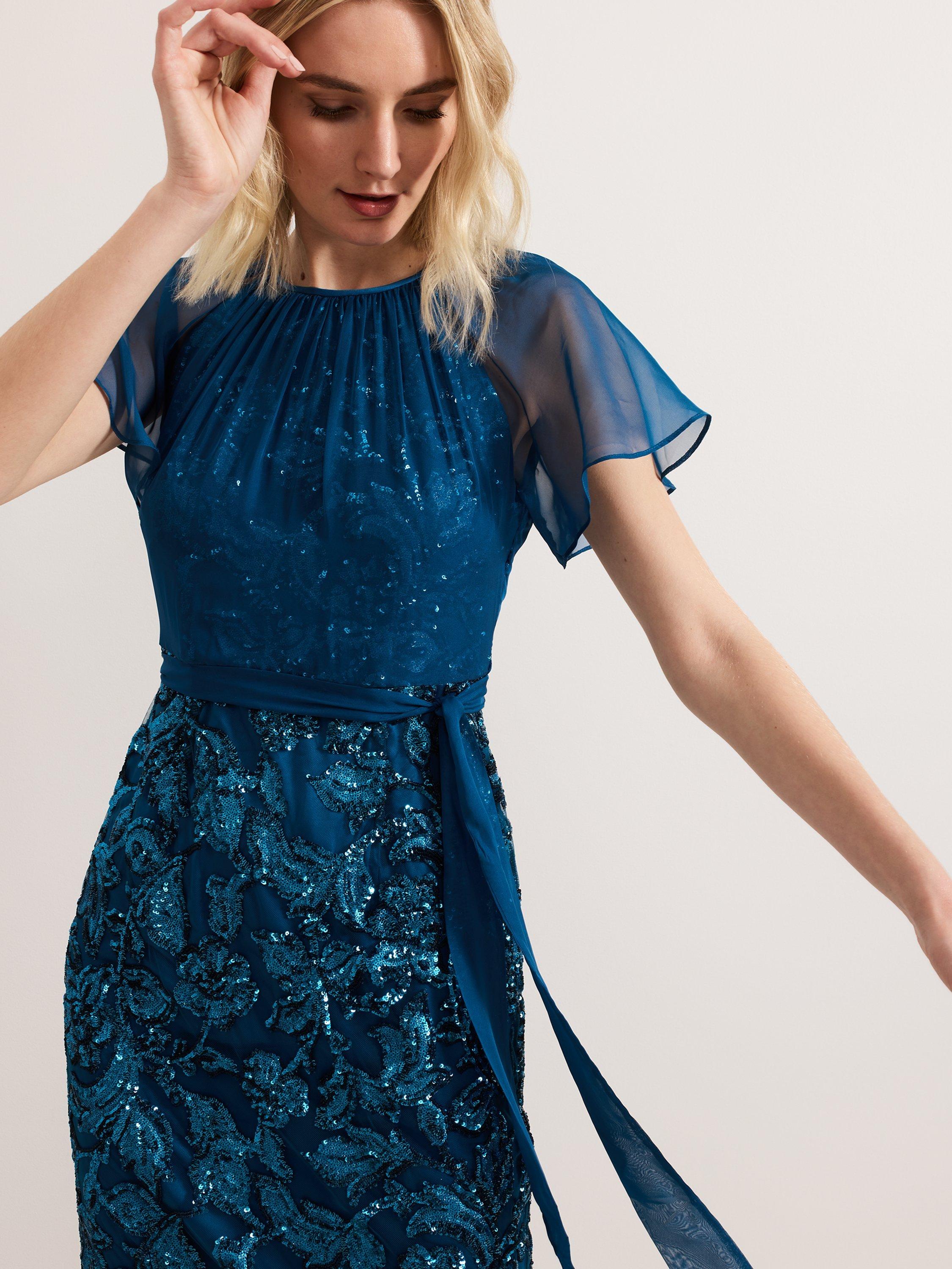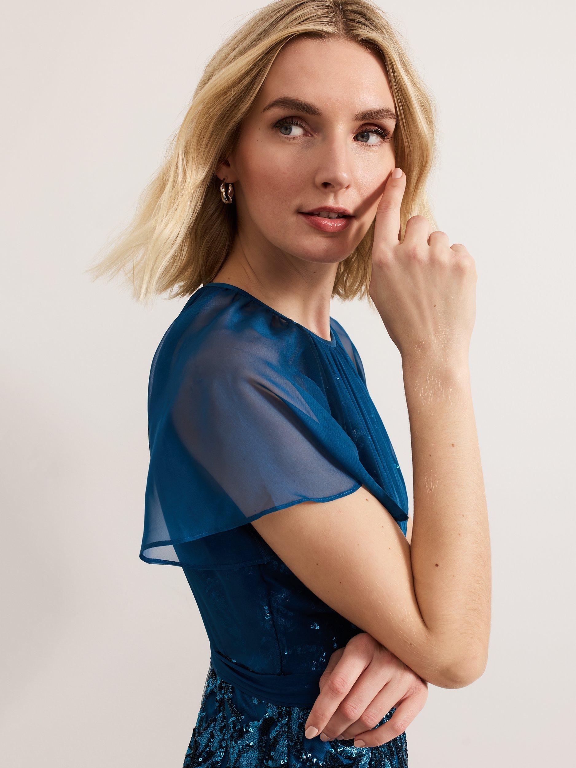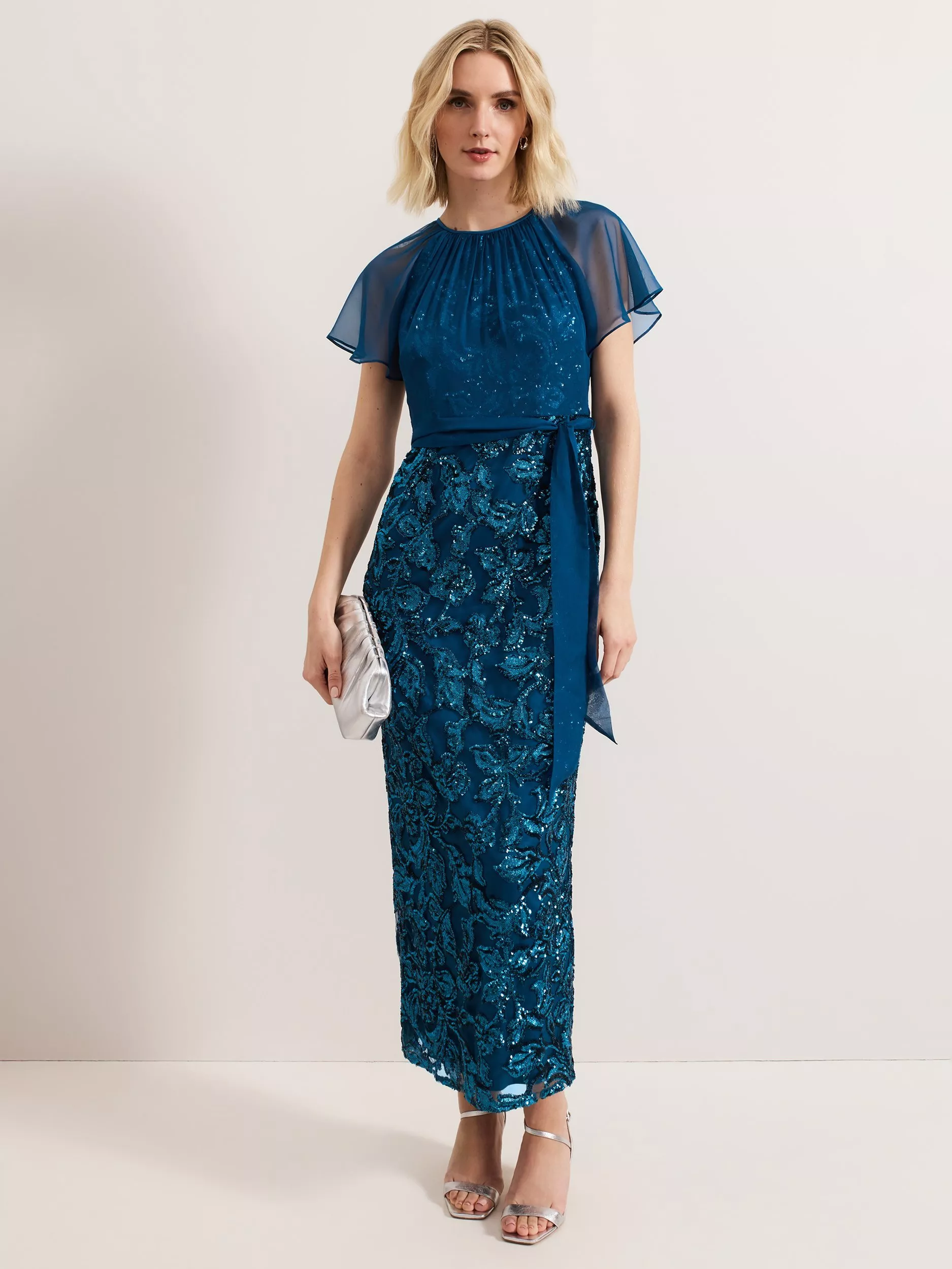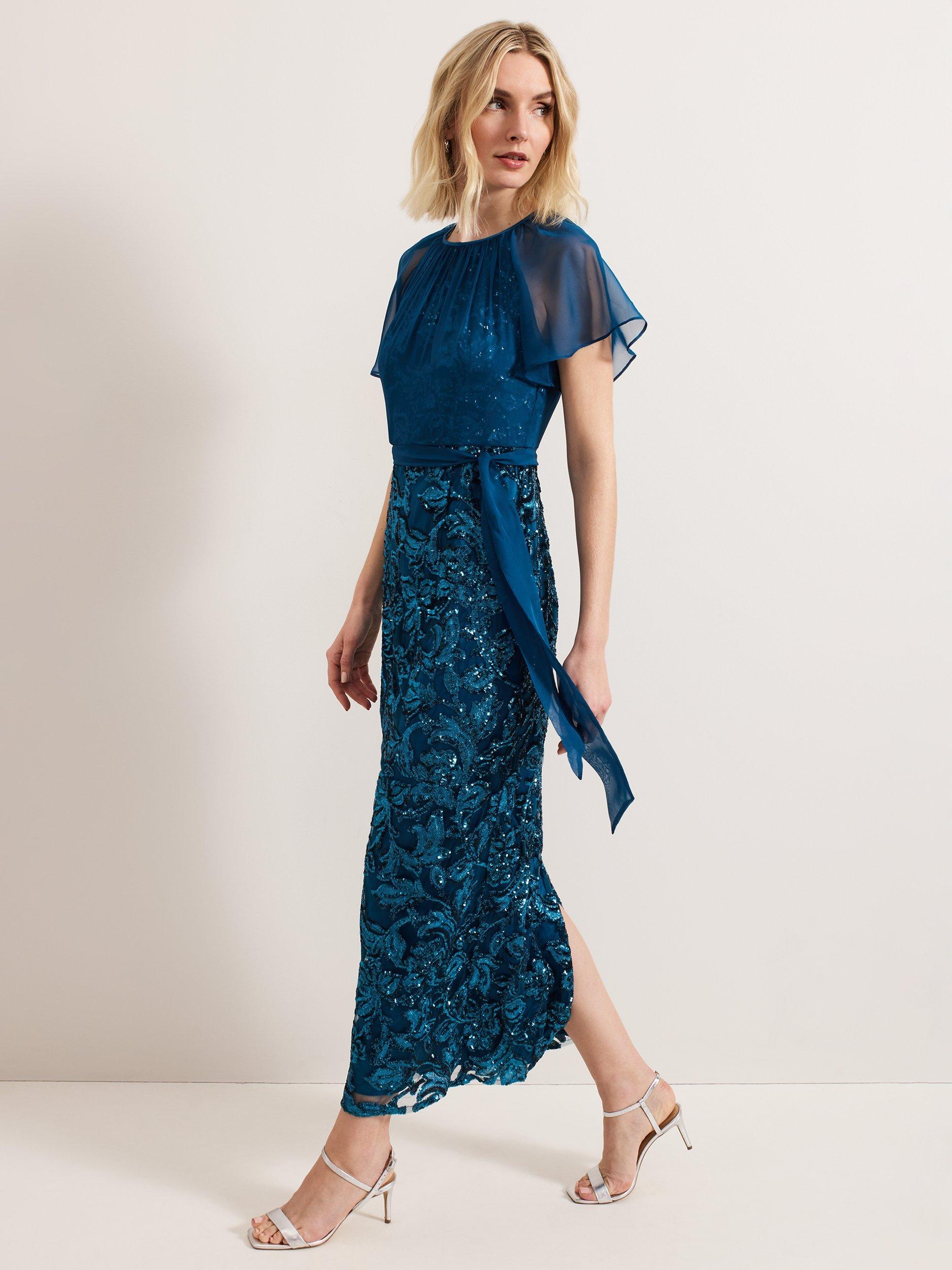 Embellished with all over sequin detailing, the Talia dress is perfect for high glamour events. Finished with a semi-sheer chiffon top and tie detail it falls through to a flattering column maxi skirt with a split detail at the back for added allure. Style with simple accessories and let the shimmering style speak for itself.