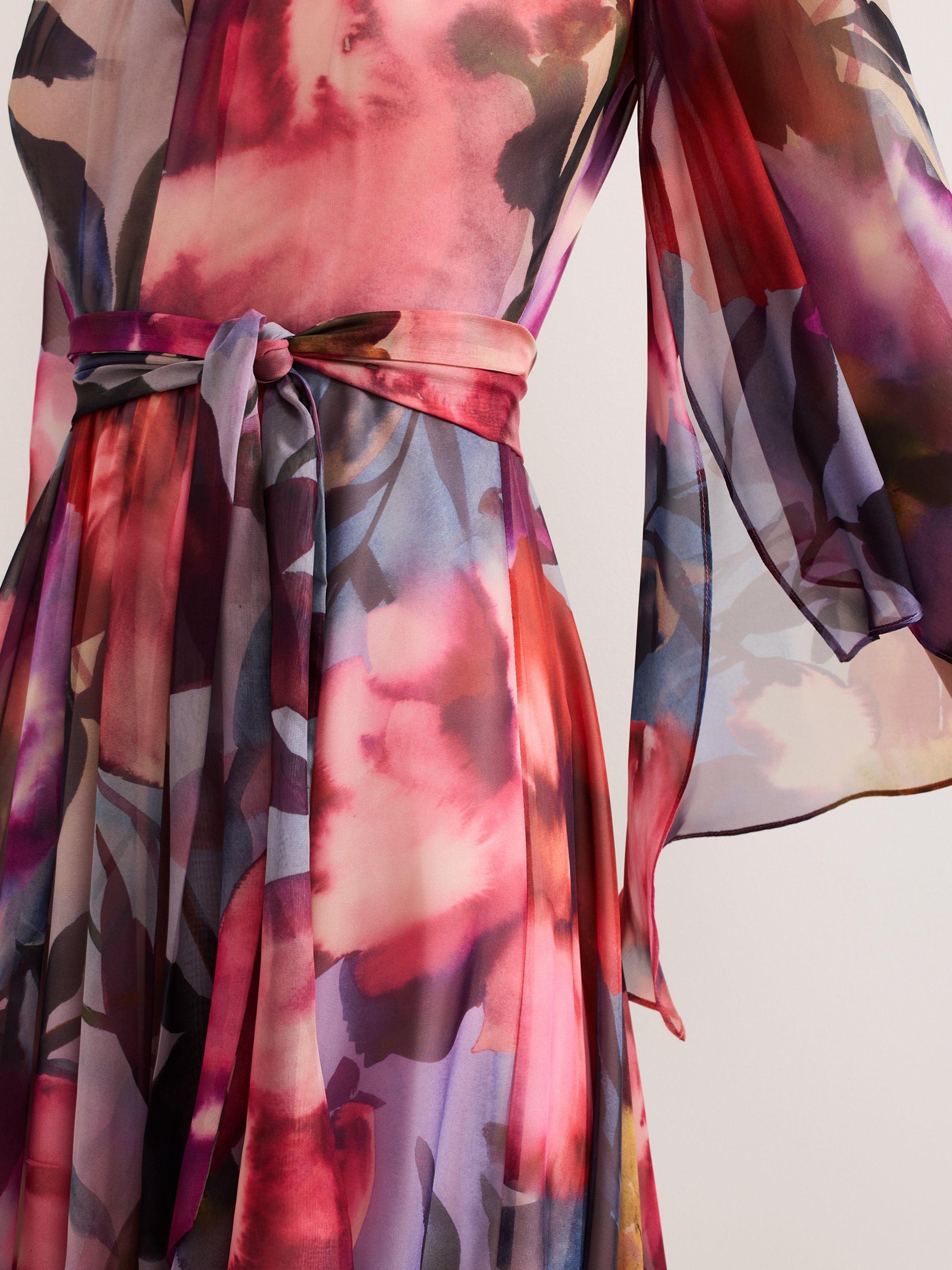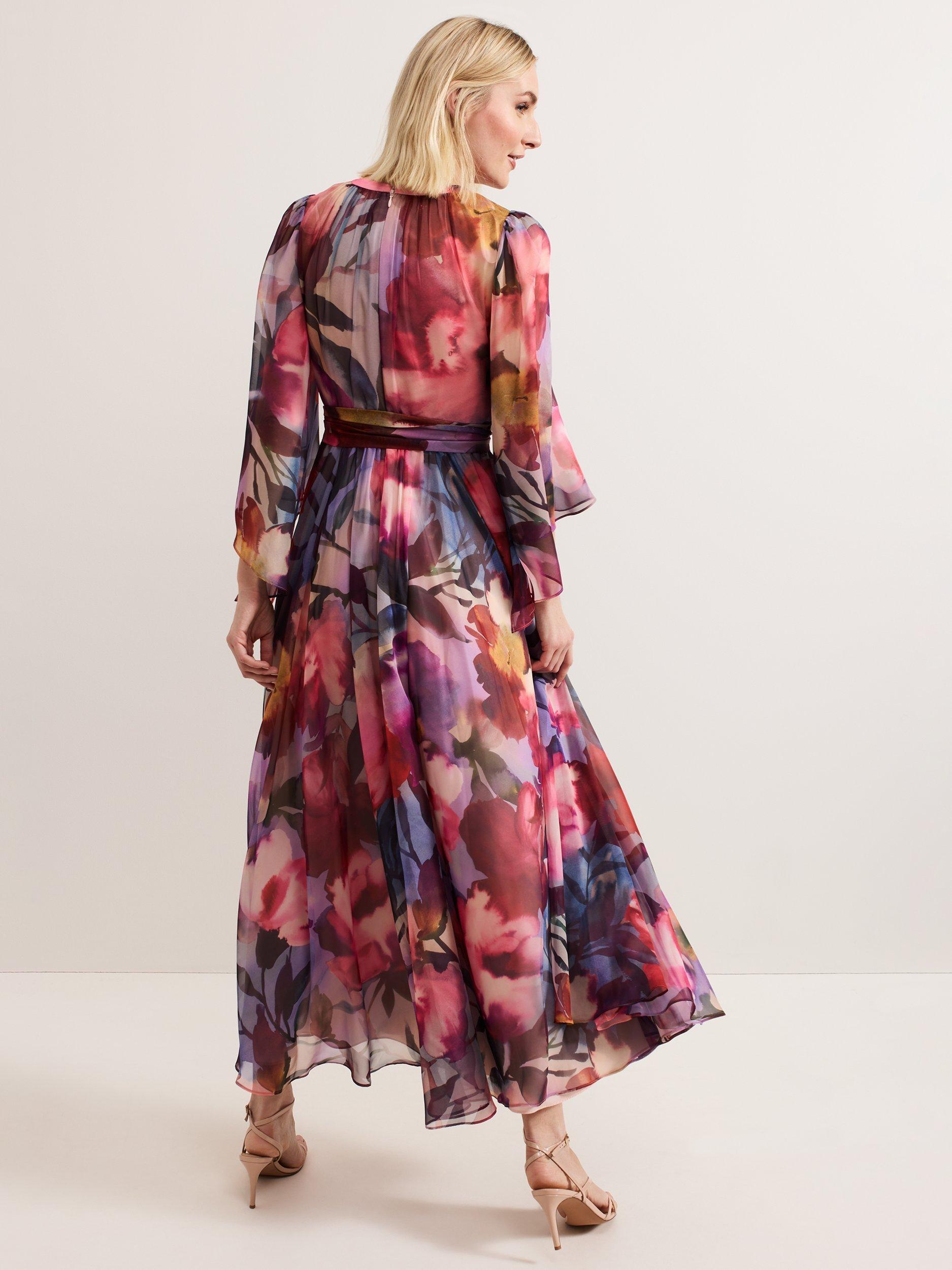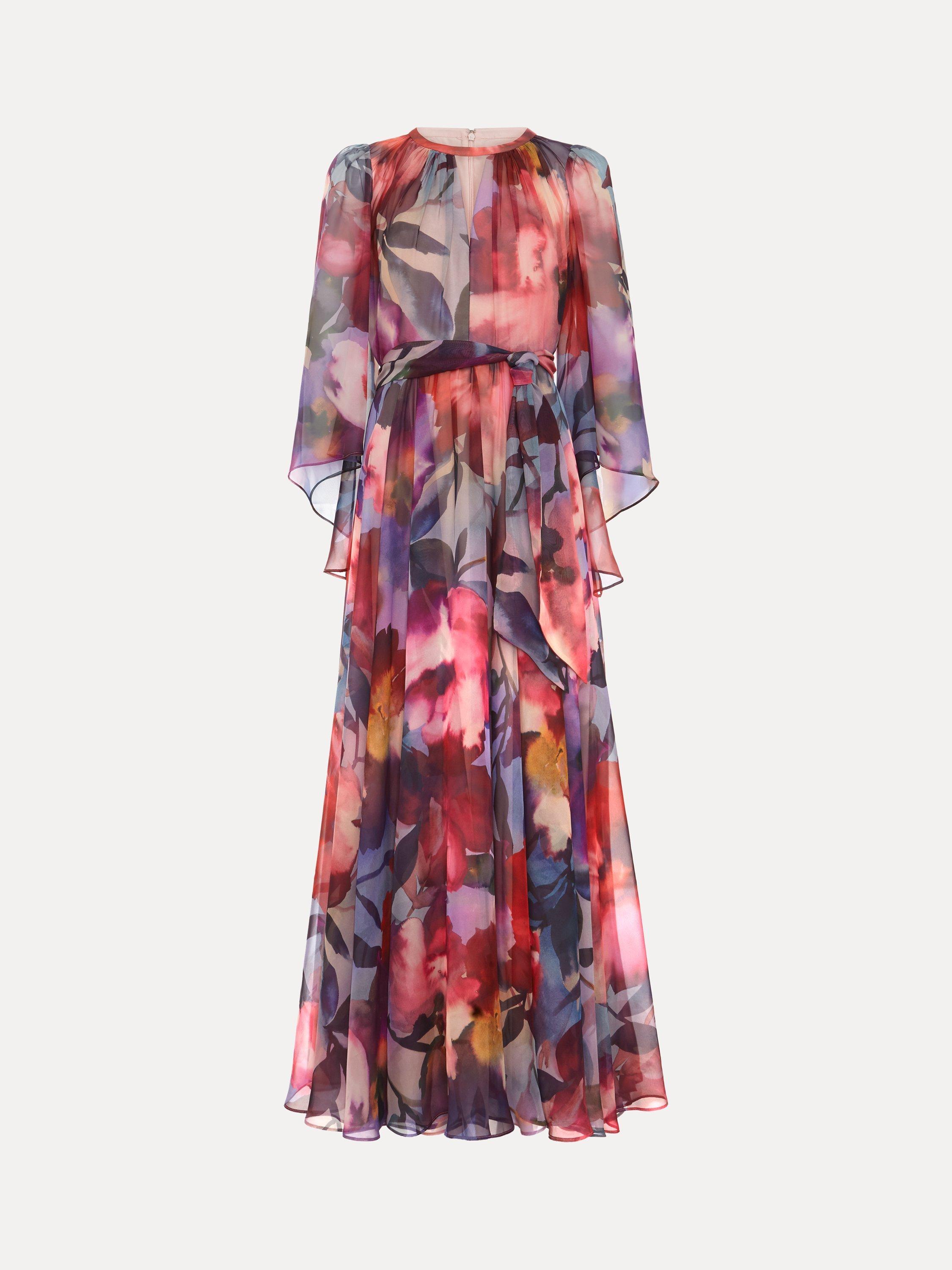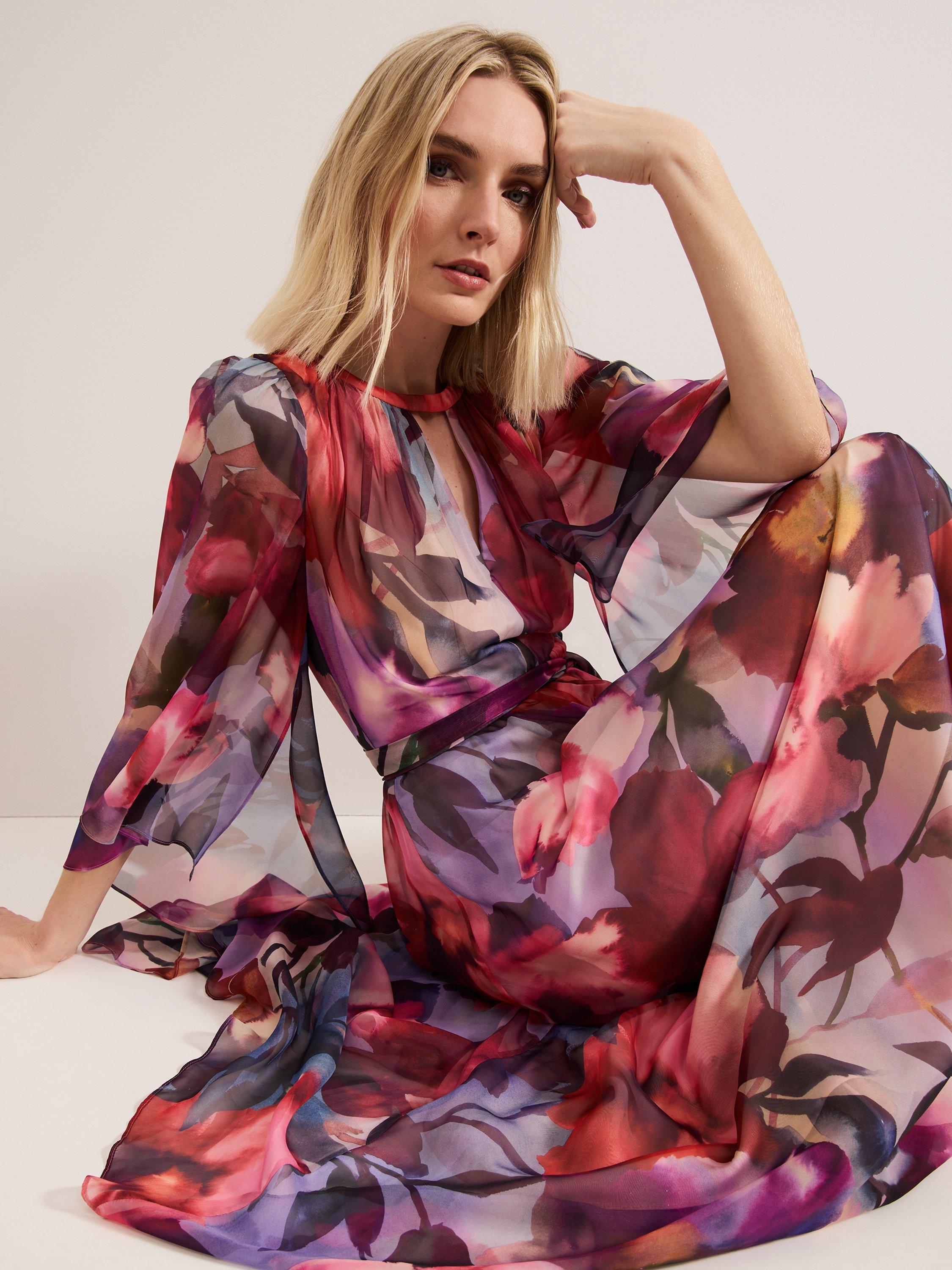 Make an entrance in the Willma dress. Featuring a statement floral print, this maxi dress is effortlessly elegant. Flowing semi-sheer sleeves create a cape effect that adds dimension whilst the tie belt subtly highlights your figure. Style with simple heels for a feminine event look.