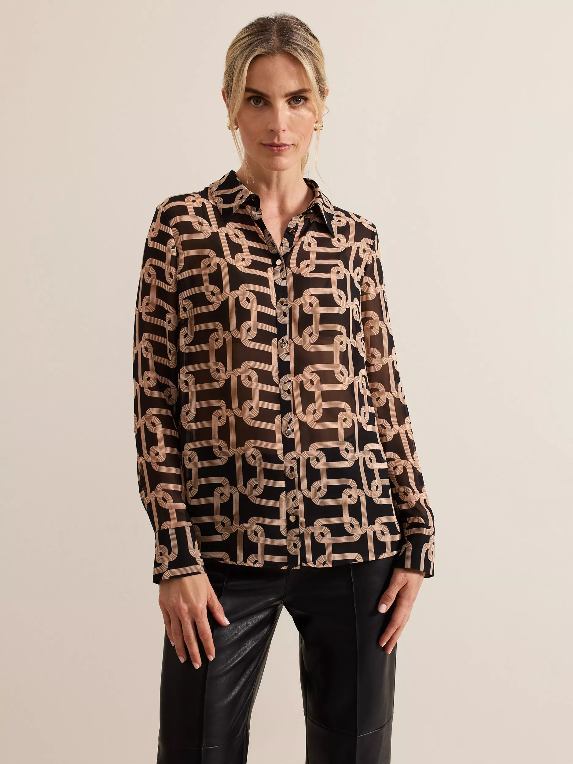 Designed in a black and tan chain print, this semi-sheer Cora shirt features a classic collar, long sleeves and gold button detailing. Pair with any of your favourite separates for a classic style that will take you from work to weekend.