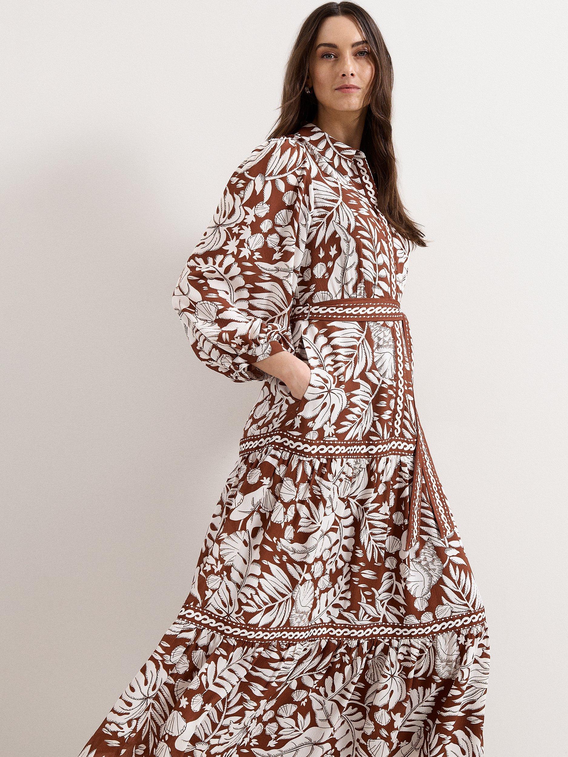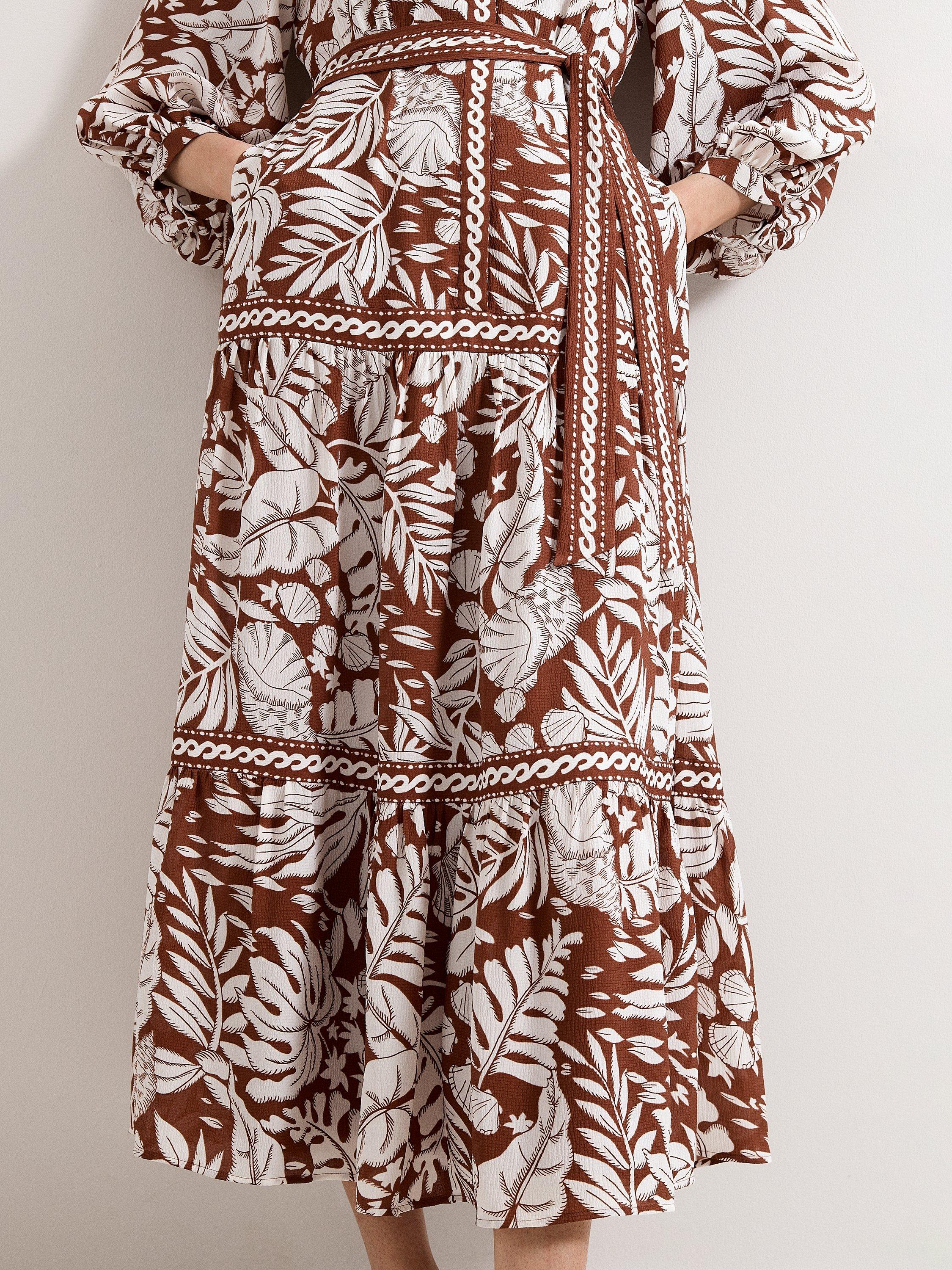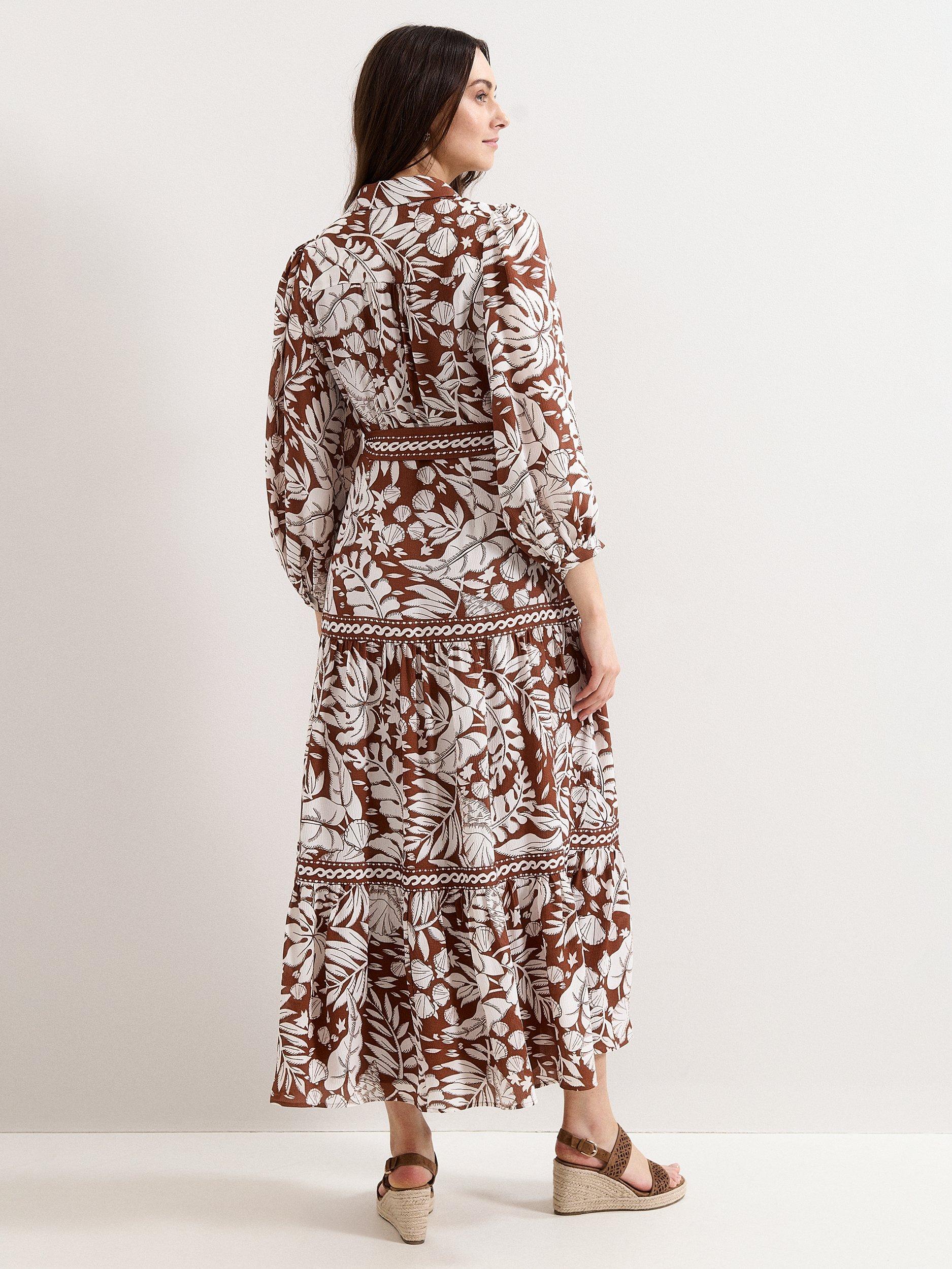 A midi dress shaped with tiered A-line panels and long sleeves, finished with a sharp collar and a leaf print for a fresh twist on day dressing. Perfect for adding structure and movement to your wardrobe, suited to shifting temperatures and layered looks.