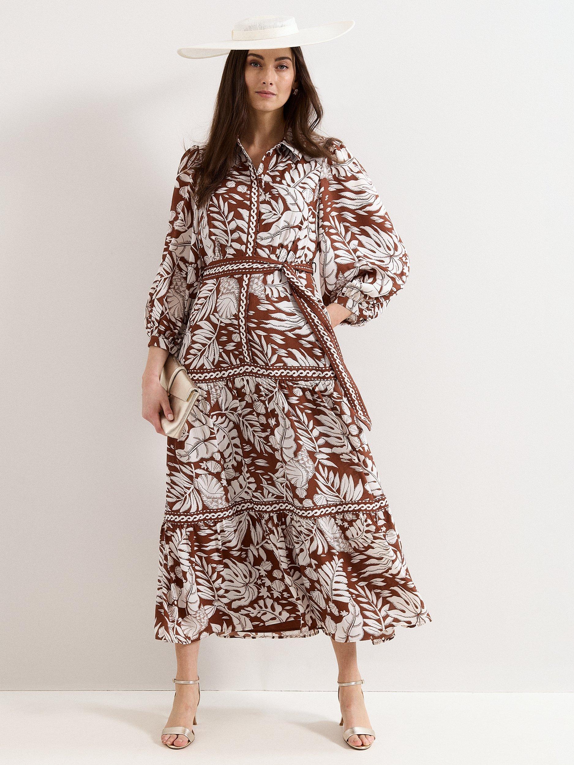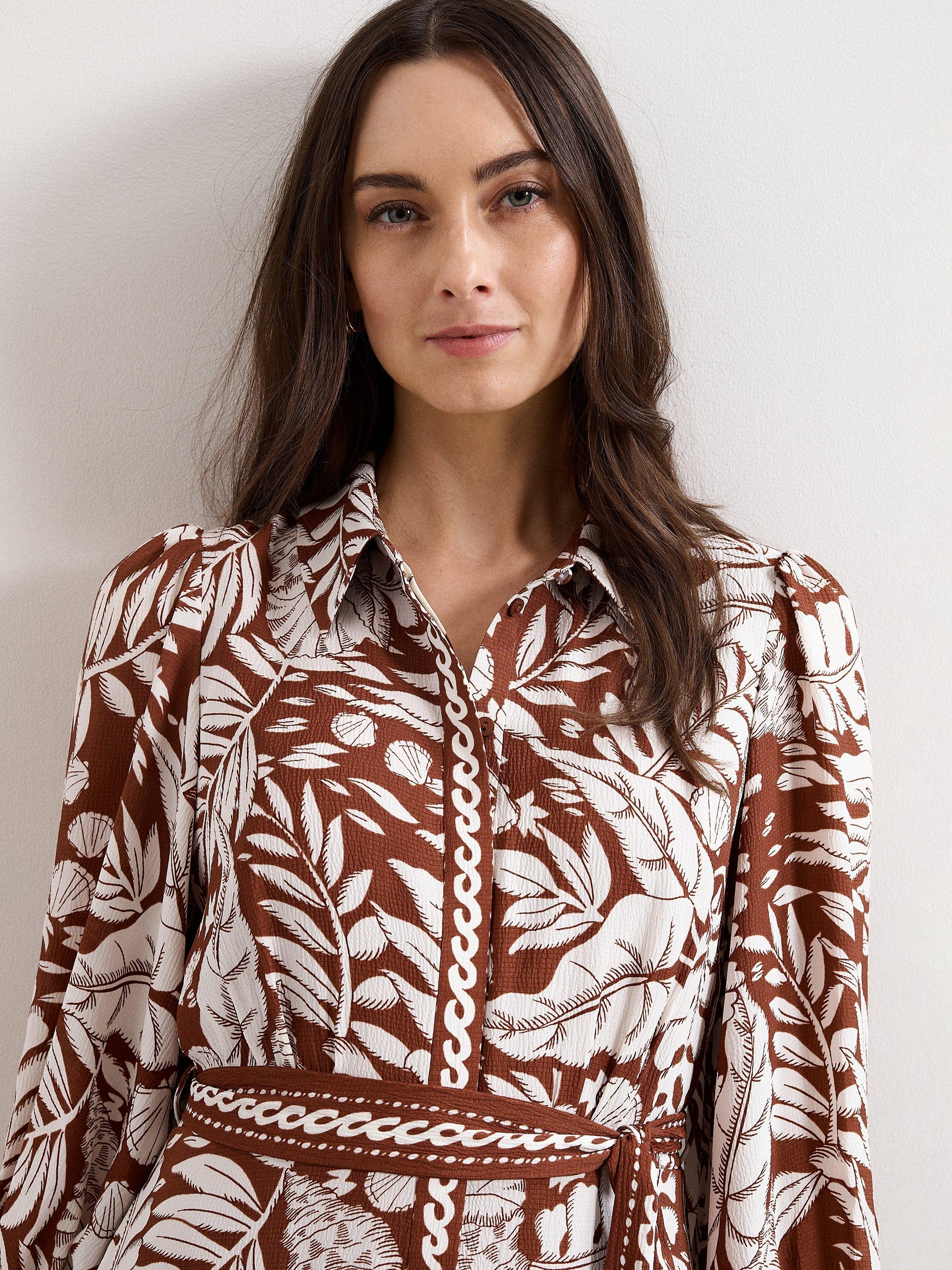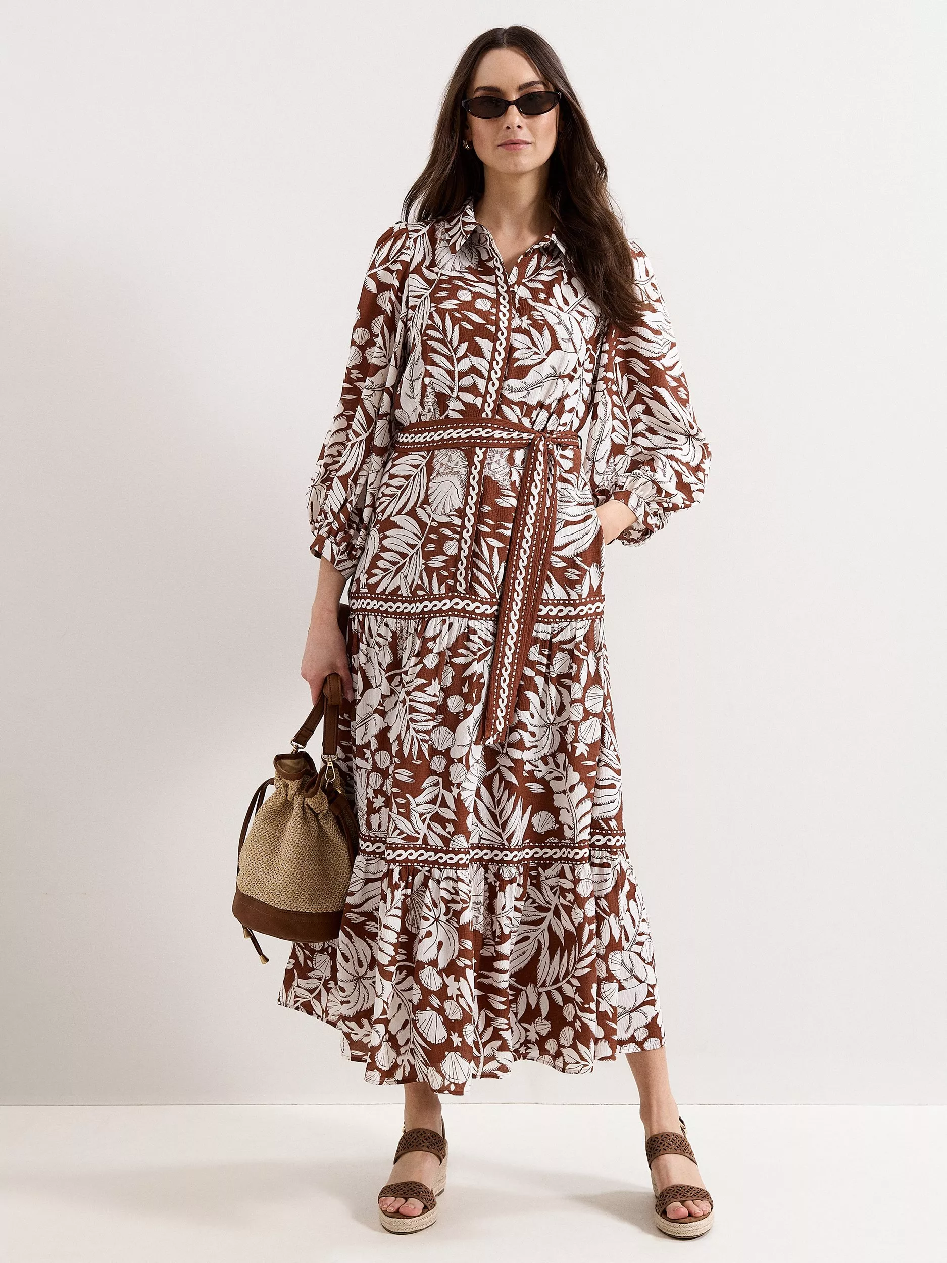 A midi dress shaped with tiered A-line panels and long sleeves, finished with a sharp collar and a leaf print for a fresh twist on day dressing. Perfect for adding structure and movement to your wardrobe, suited to shifting temperatures and layered looks.