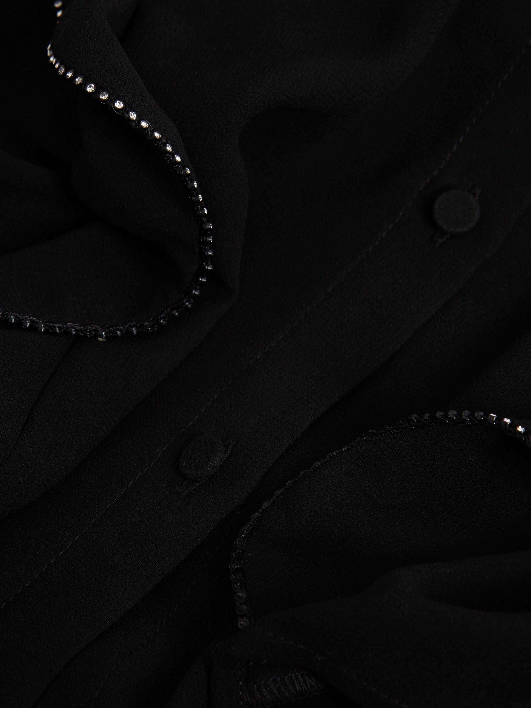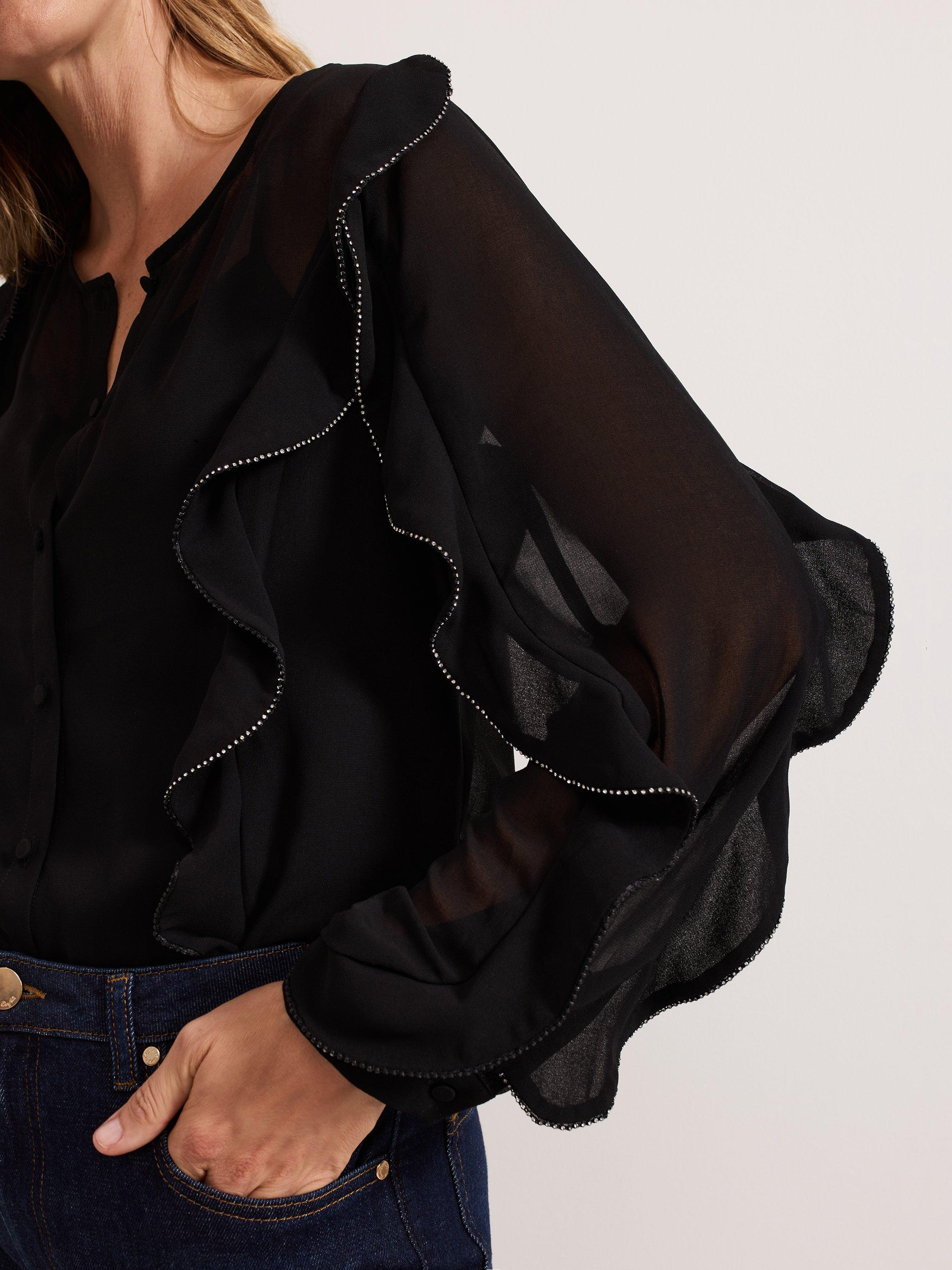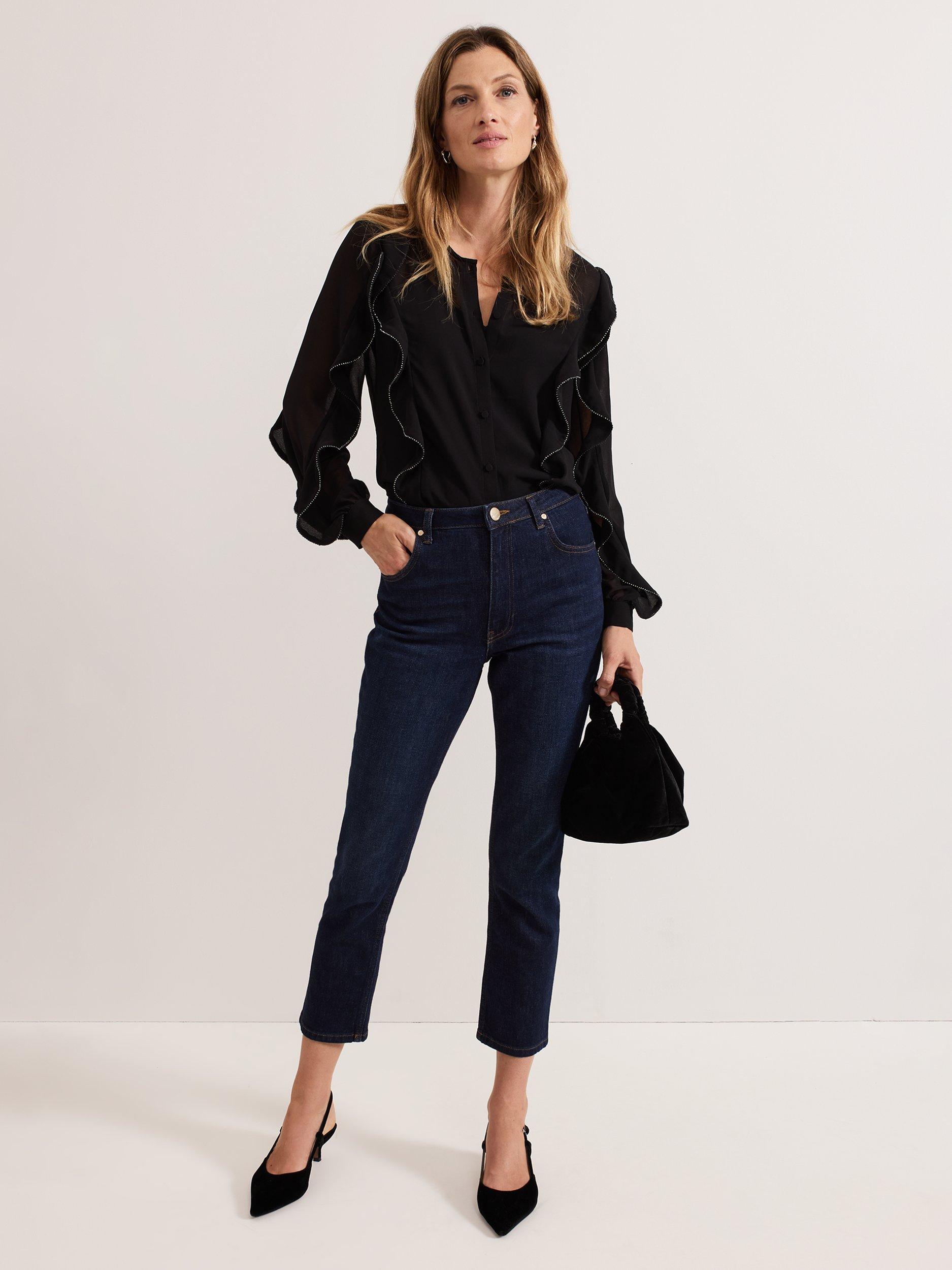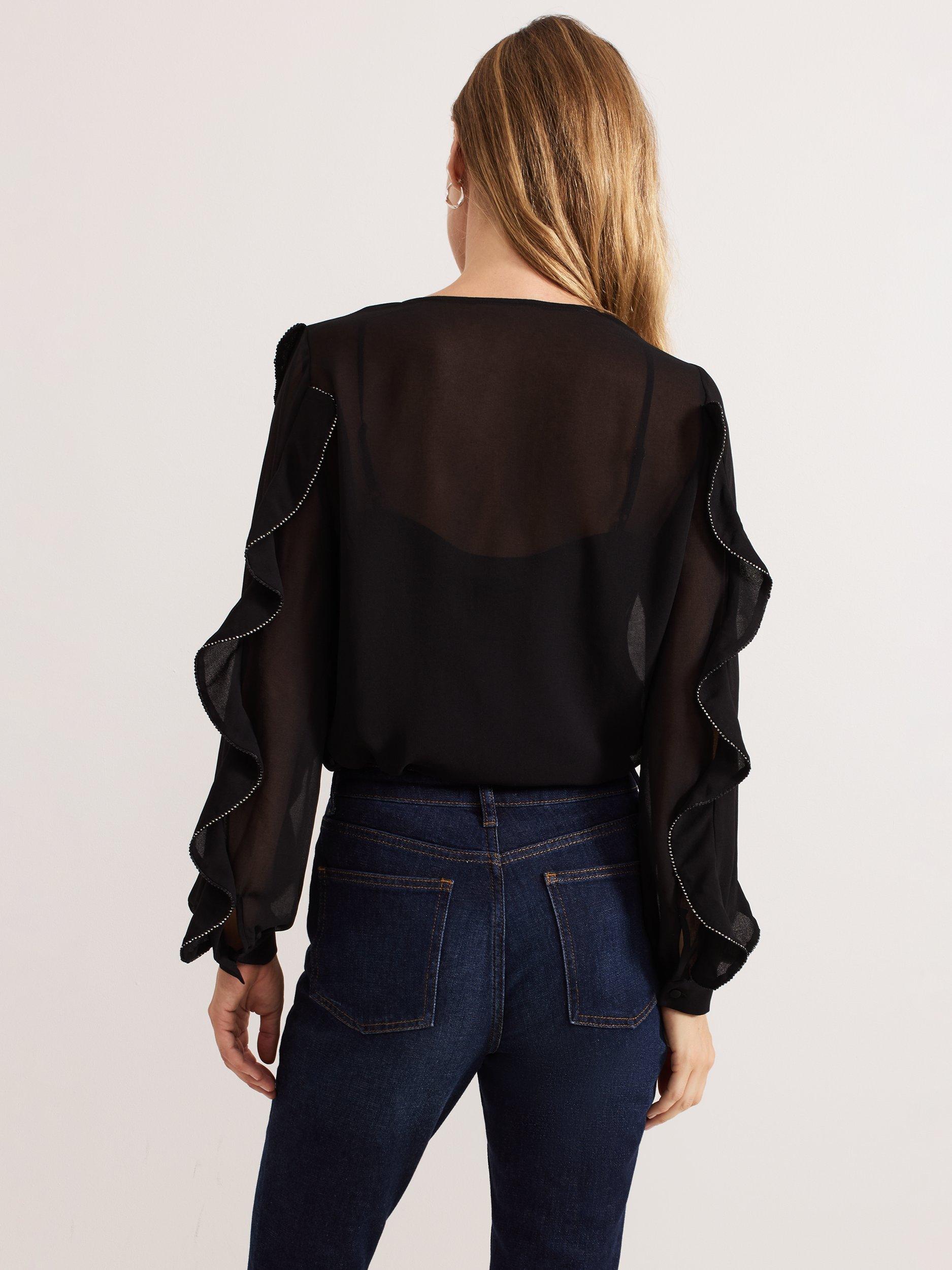 It's the delicate ruffles and semi-sheer fabric that makes this blouse a romantic style to add to your new season wardrobe. Designed in a hue that you'll reach for time and time again, this blouse features silver sparkle detailing that adds a touch of glamour, perfect to pair with your favourite separates and heels for an evening look.
