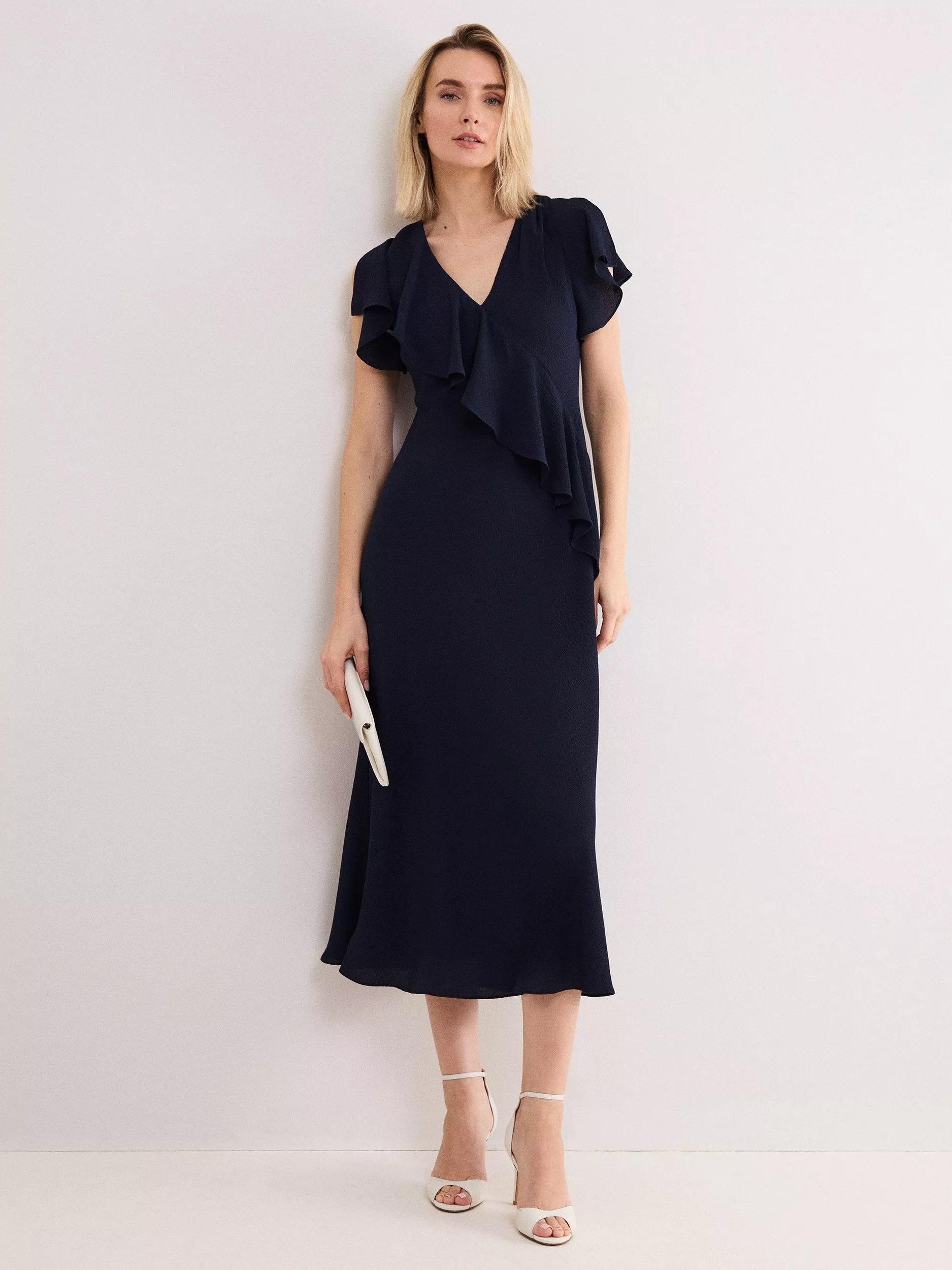 This Phase Eight midi dress features a shift design with cascading ruffles, a flattering V-neck and playful V-back. A great choice for evening events and celebrations, it feels comfortable while also standing out.