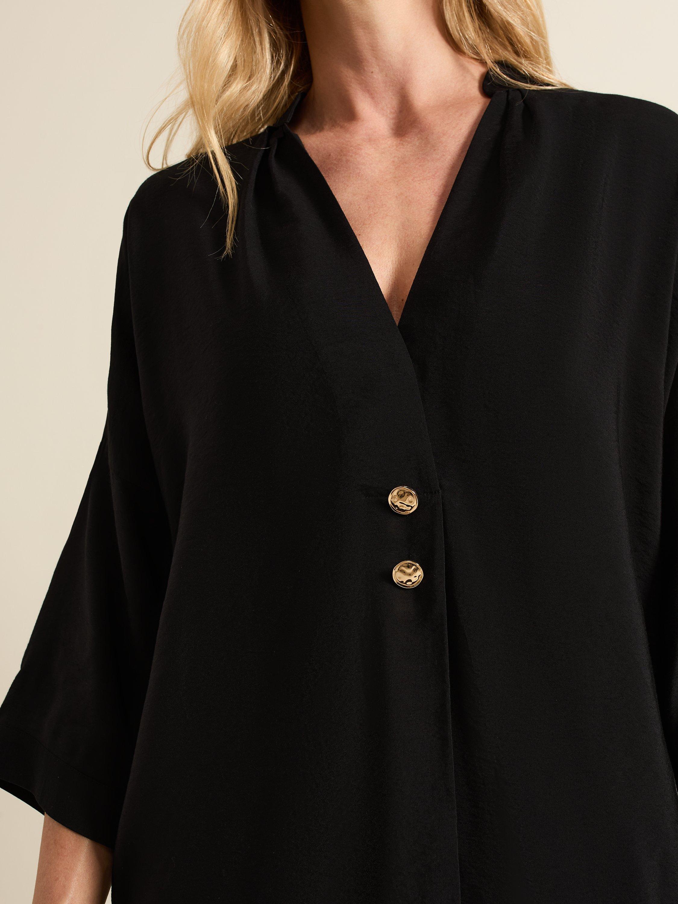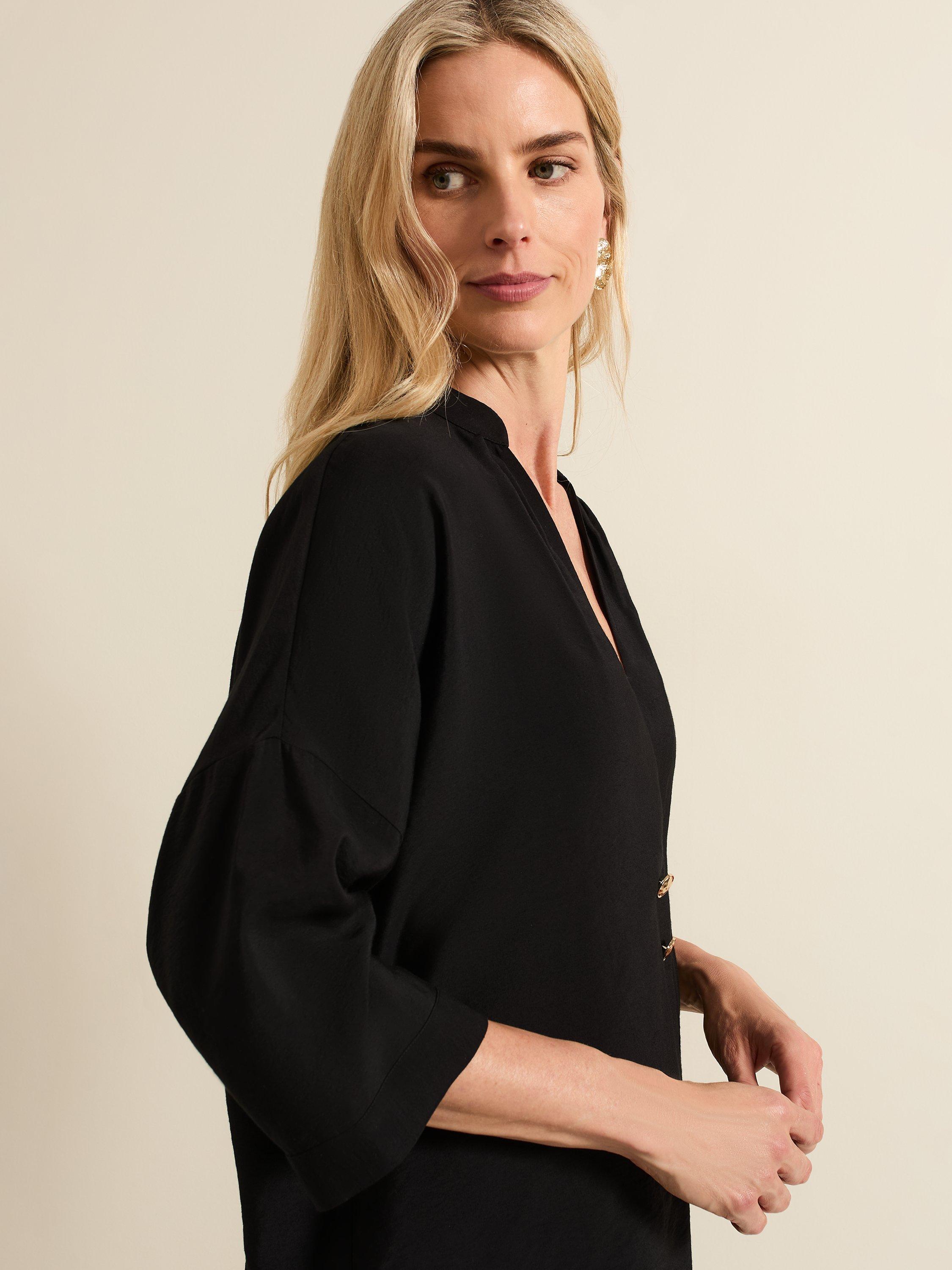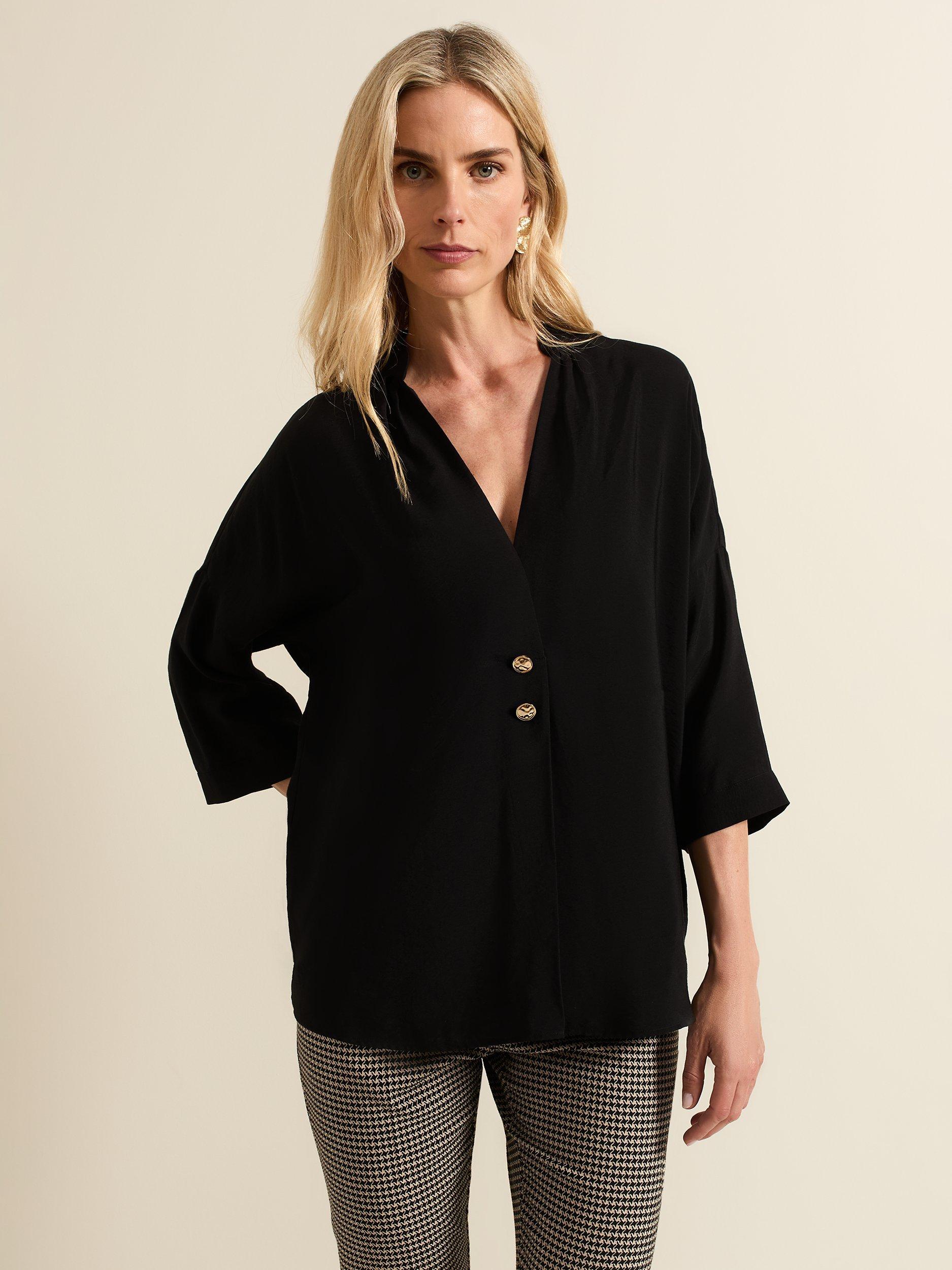 Designed with a V-neckline and 3/4 sleeves, our Cynthia shirt is perfect for a casual, everyday look. Gold button detailing contrasts the black for an easy style to pair with any of your favourite separates.