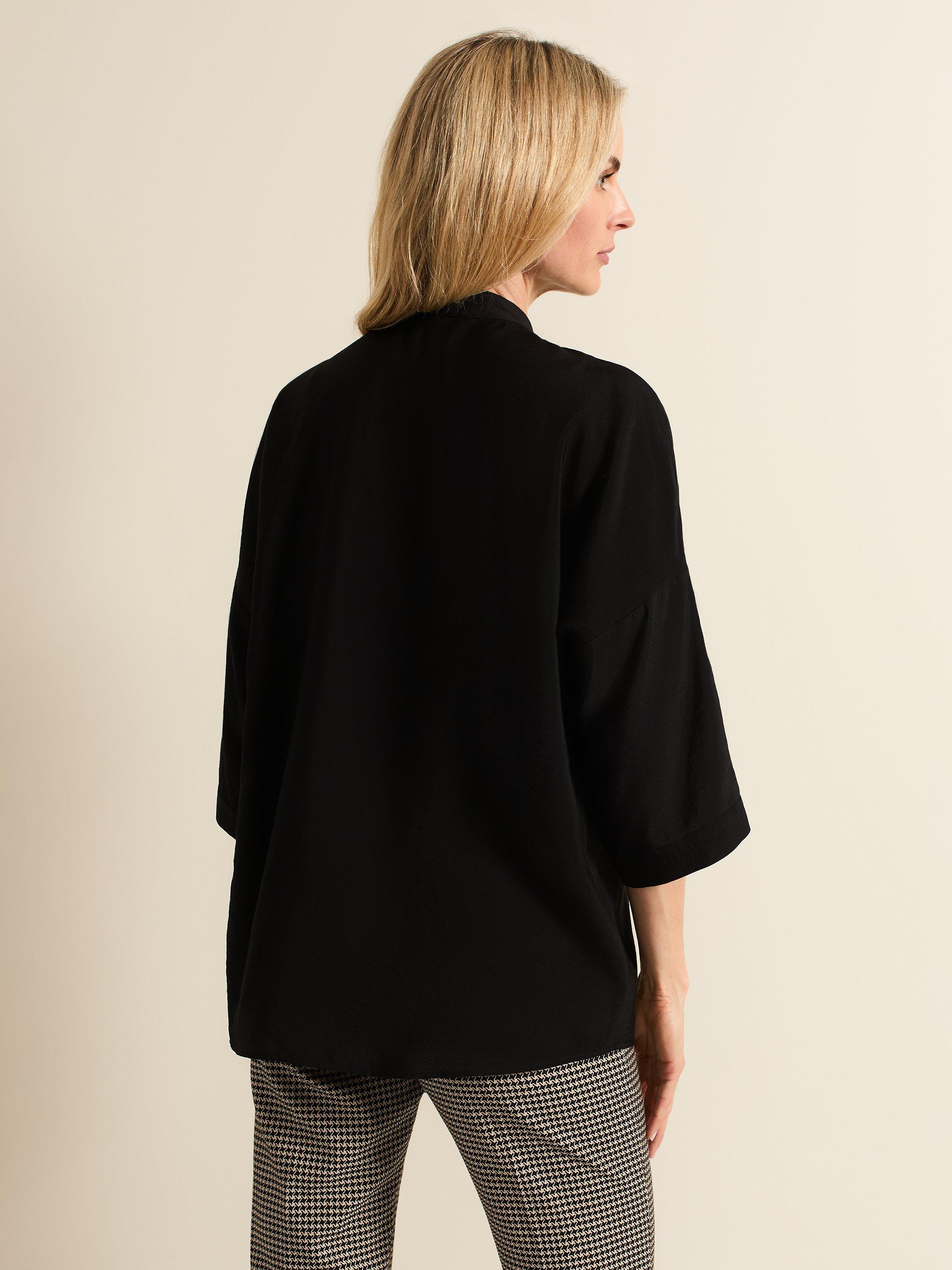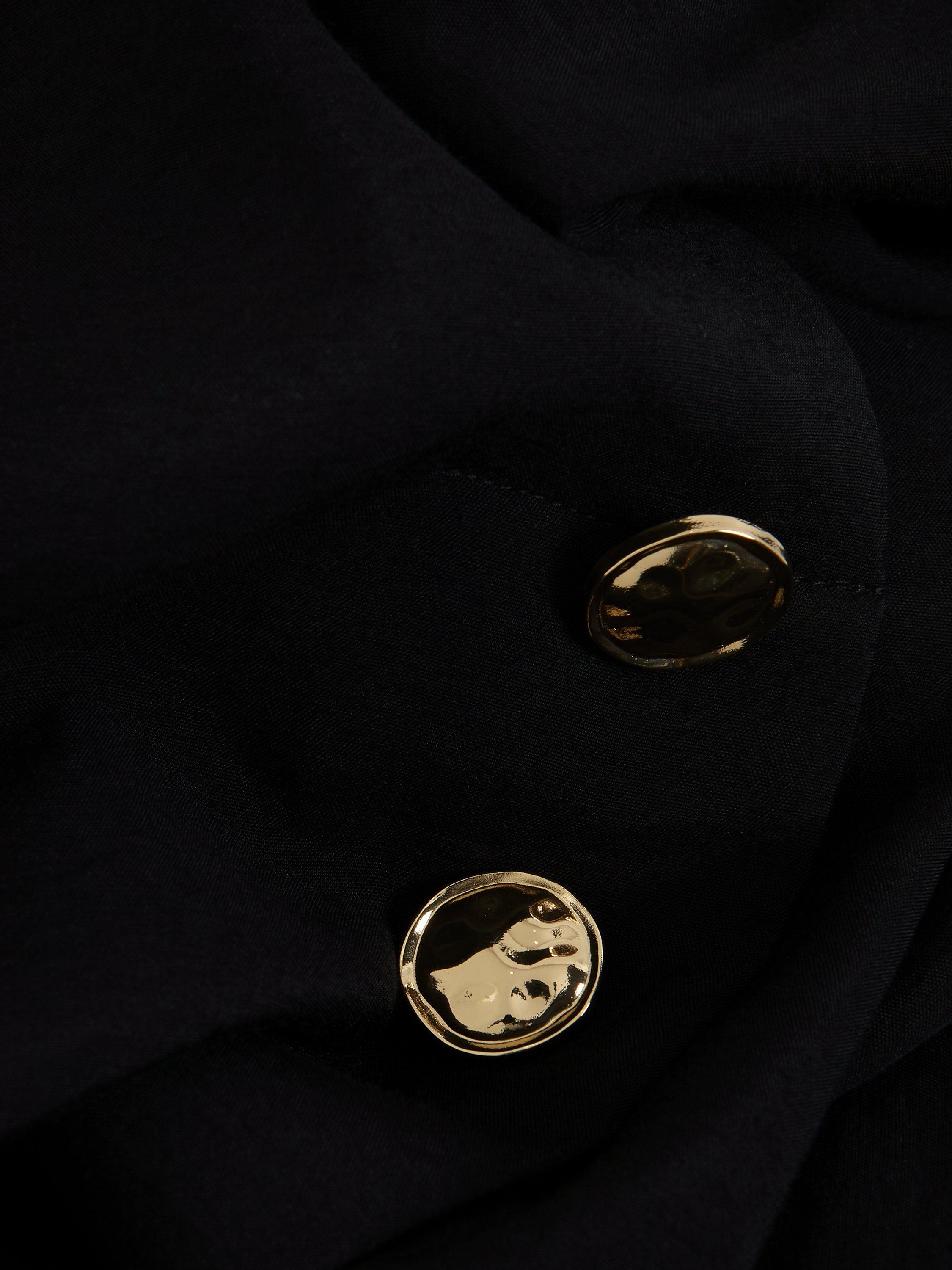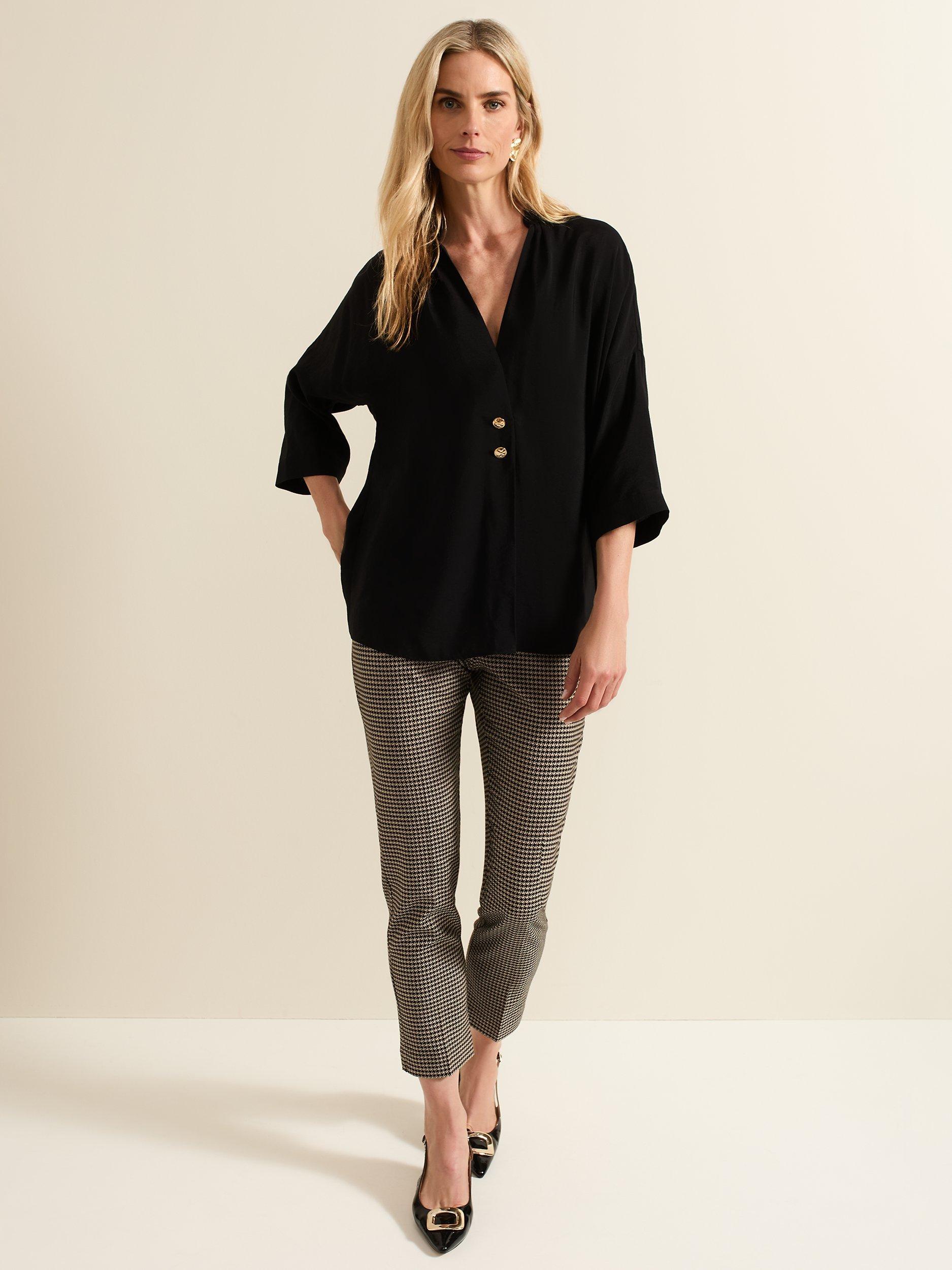Designed with a V-neckline and 3/4 sleeves, our Cynthia shirt is perfect for a casual, everyday look. Gold button detailing contrasts the black for an easy style to pair with any of your favourite separates.