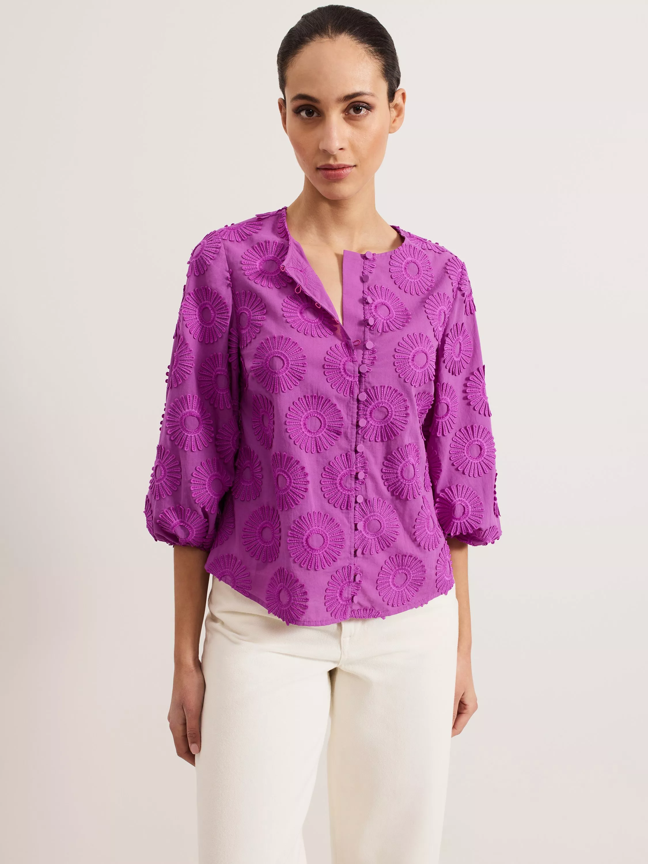 Add a pop of colour to your spring wardrobe. Updated with a contemporary daisy print, this textured blouse pairs effortlessly with your favourite trousers for a look that will take you from work to the weekend.