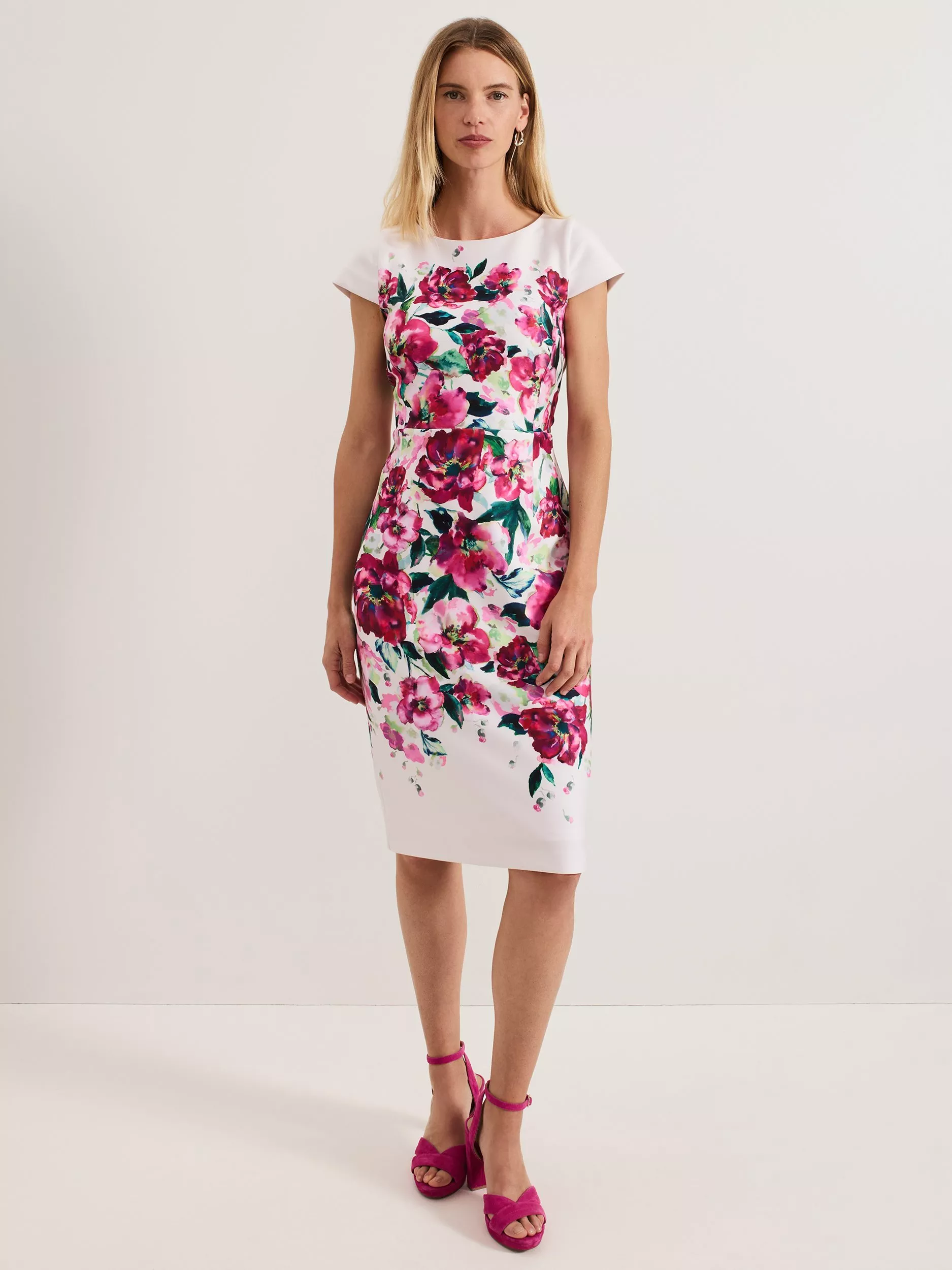 The Dannas dress features a striking floral design, perfect for all your special events. With an elegant boat neckline and short capped sleeves, this dress falls at the knee for a sophisticated midi silhouette.