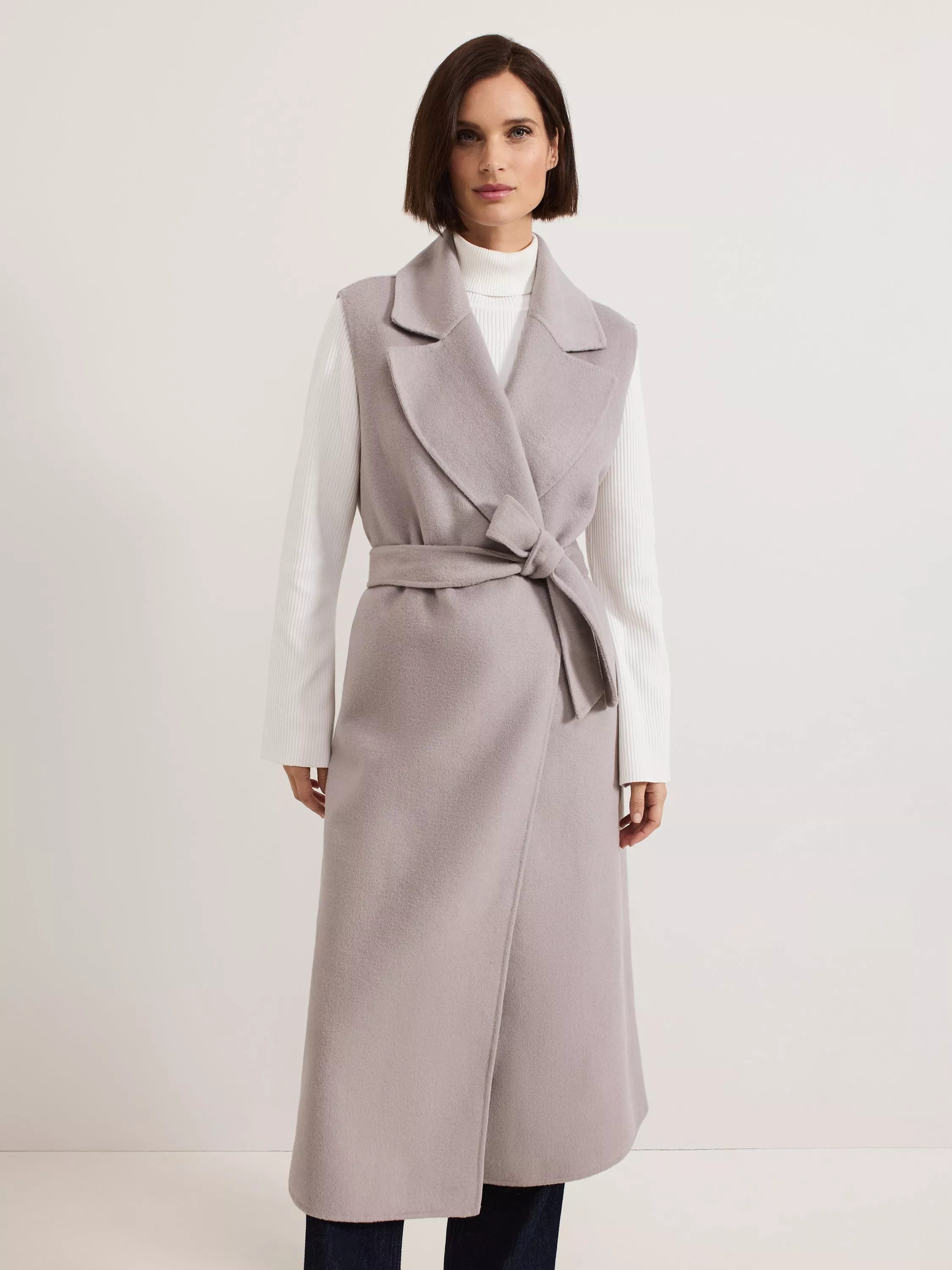 Perfect for wrapping up in, this sleeveless coat from Phase Eight has a longline cut for a sleek profile. Detailed with collar lapels and a self-tie fabric belt at the waist, it is made using a rich double-faced wool blend for a warming fit.