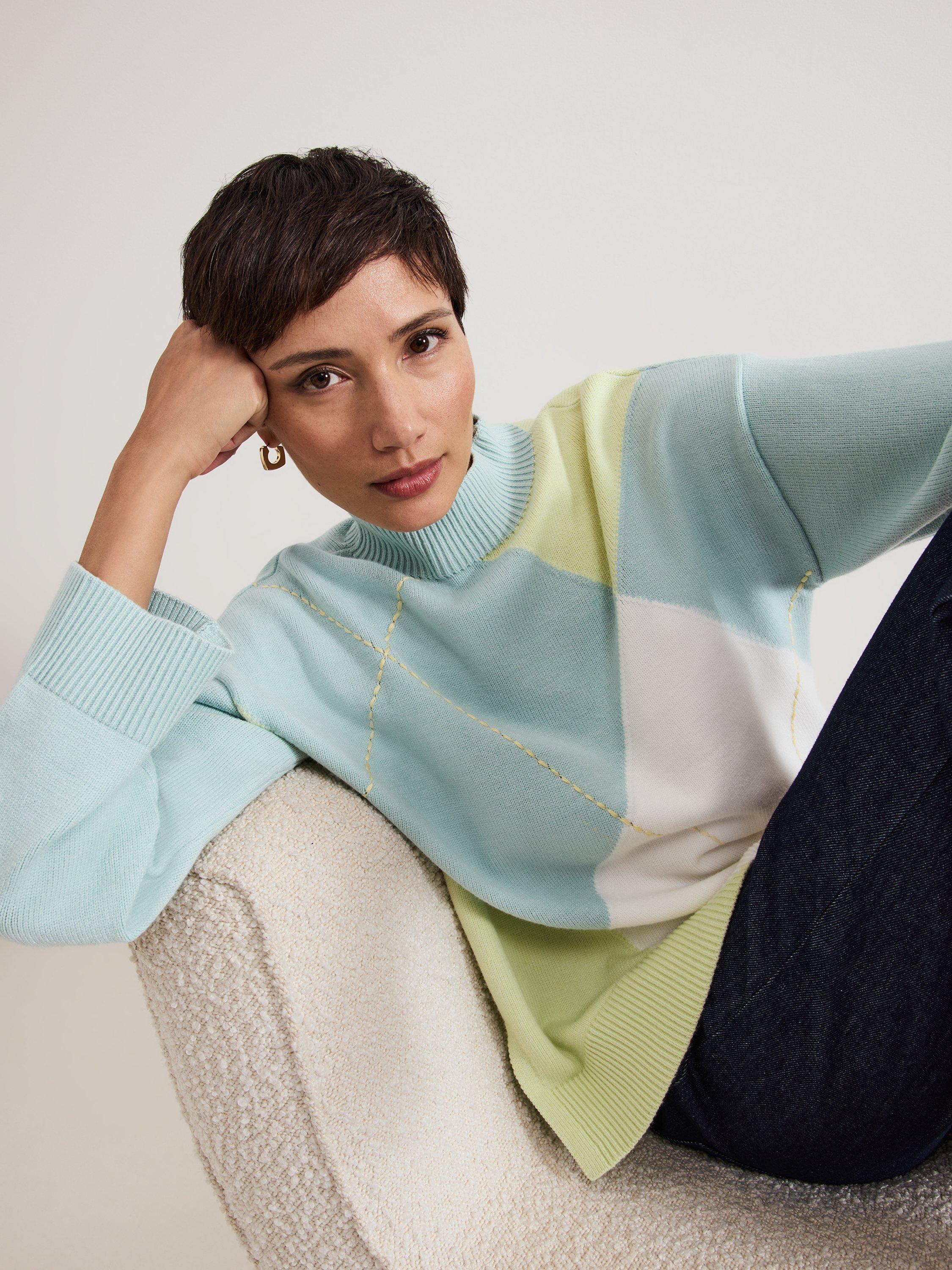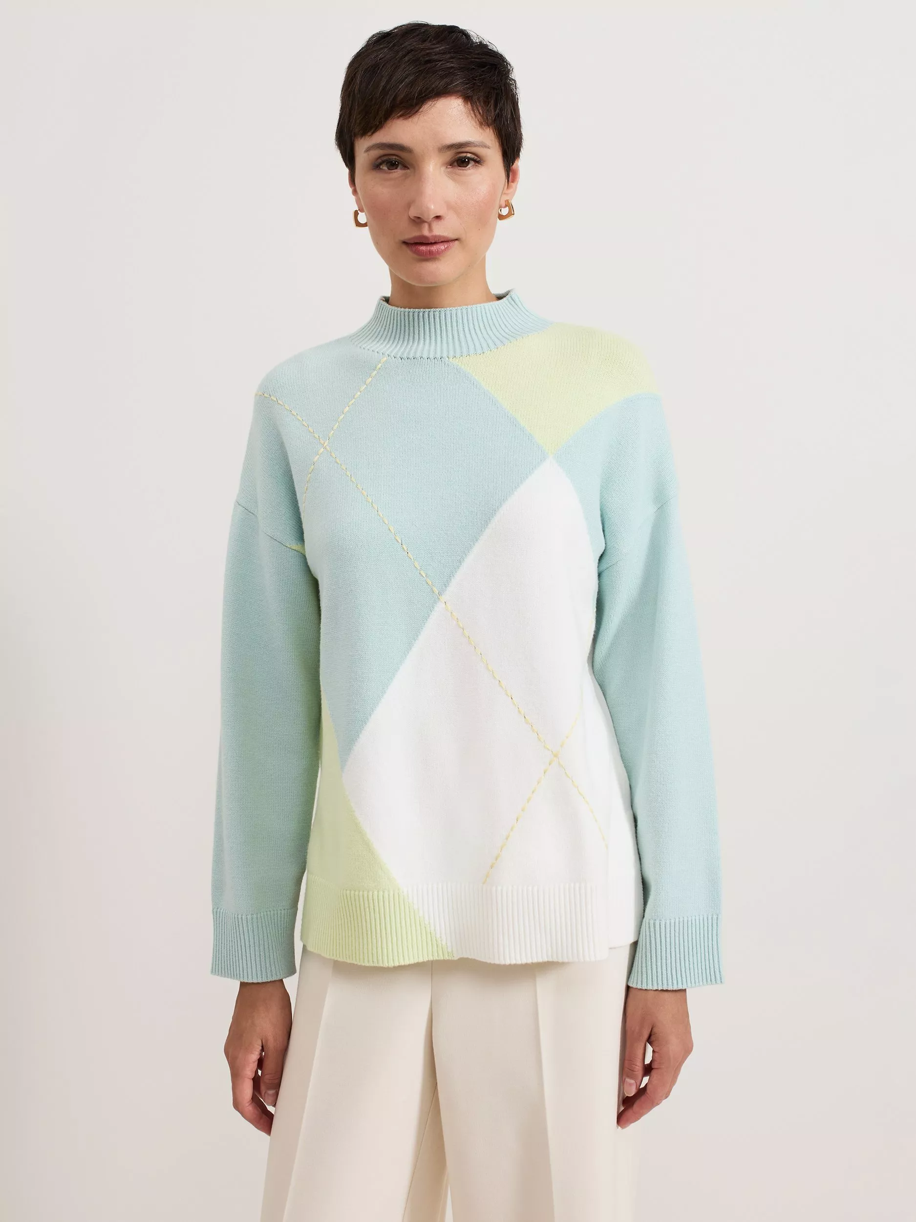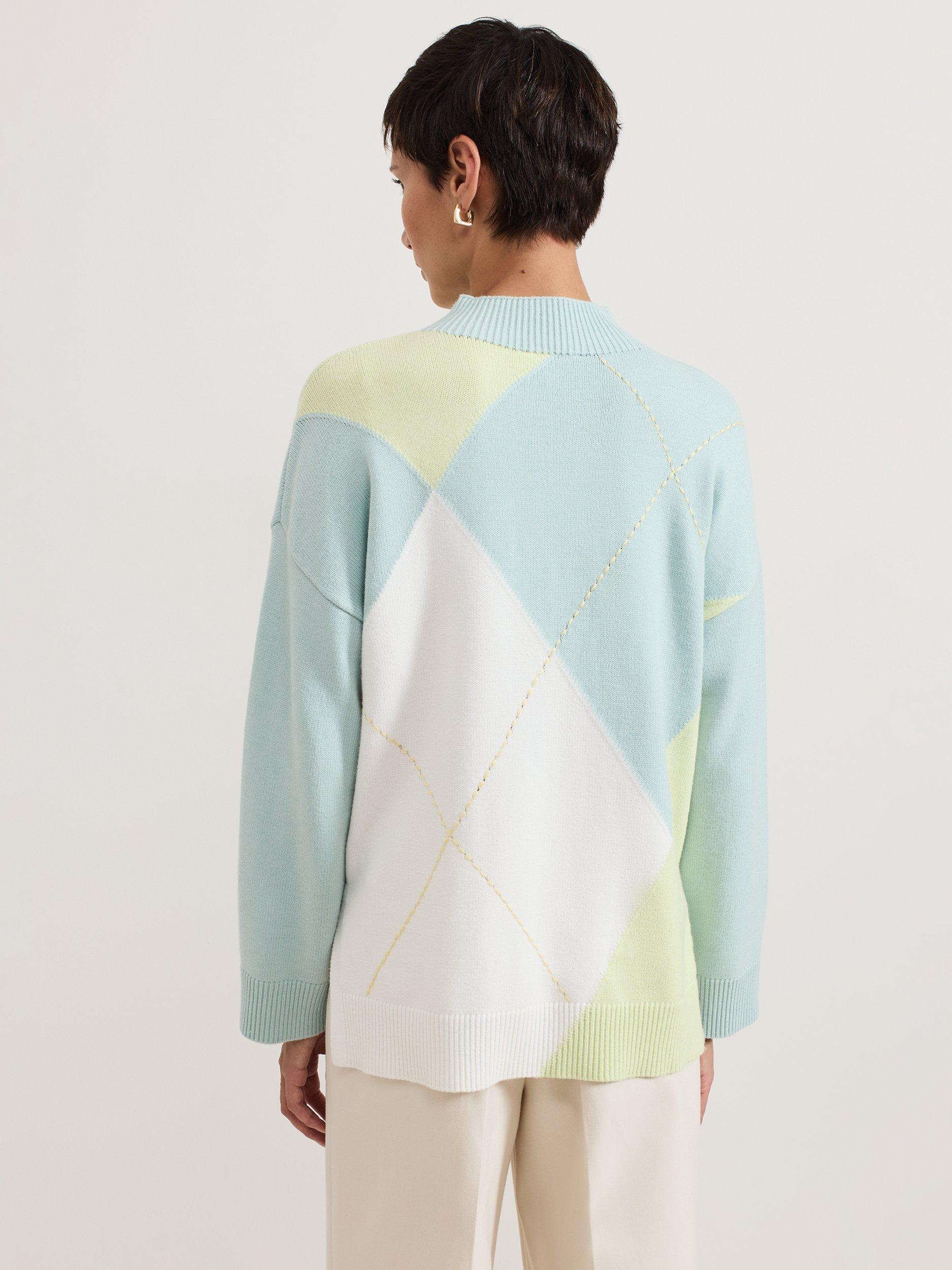 The Darla knitted jumper will stand the test of time in your wardrobe. In a distinctive diamond design, this jumper features a cosy high neckline, perfect for colder days. Intricate detailing is added by the stepped hem and exposed stitching to create a contemporary style to pair with all your favourite trousers.