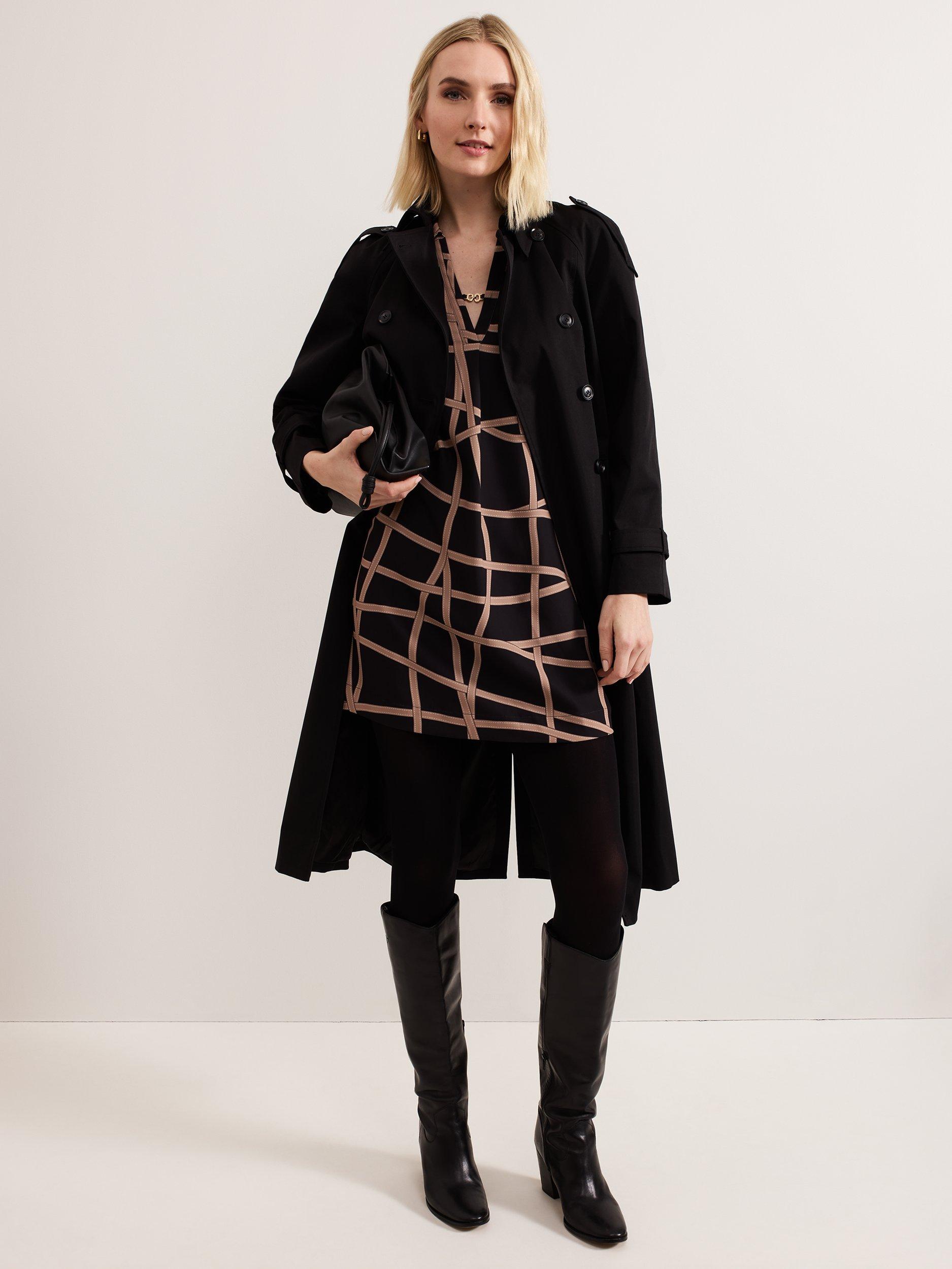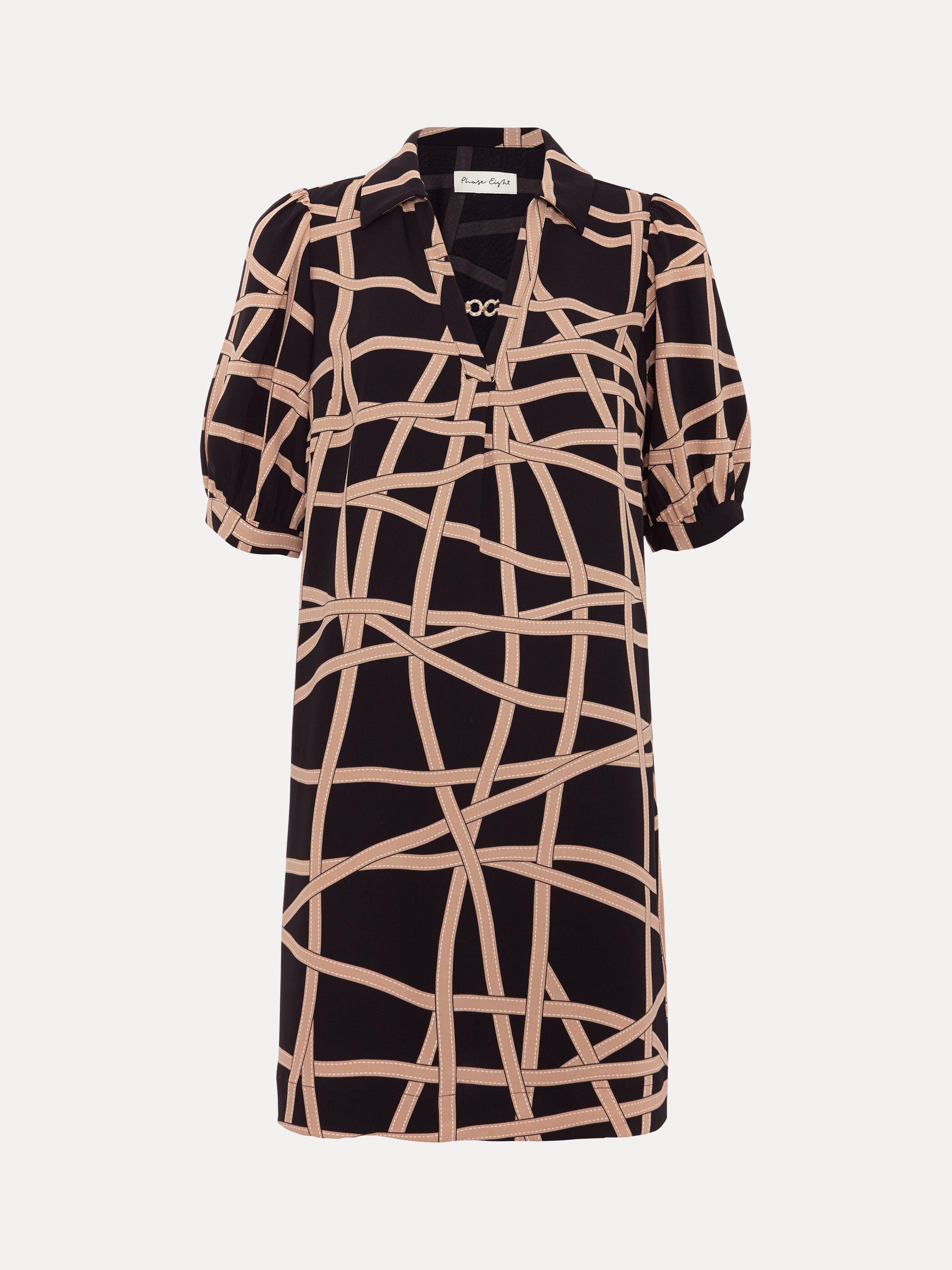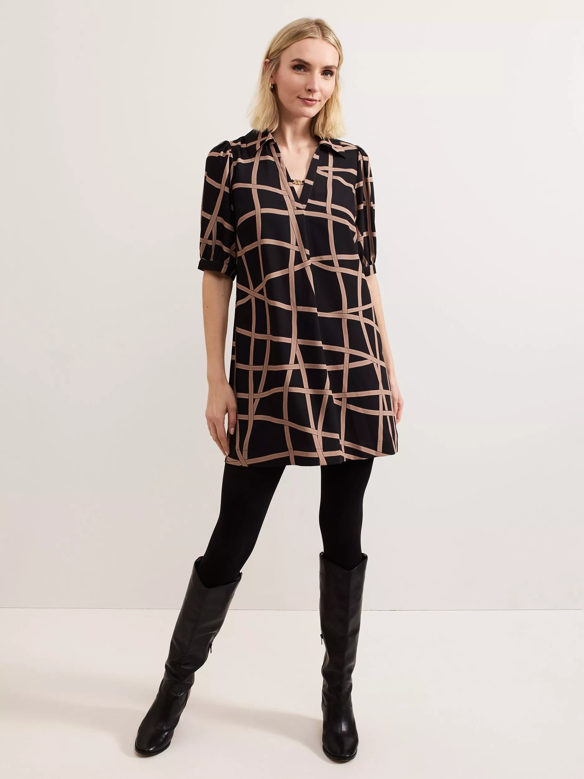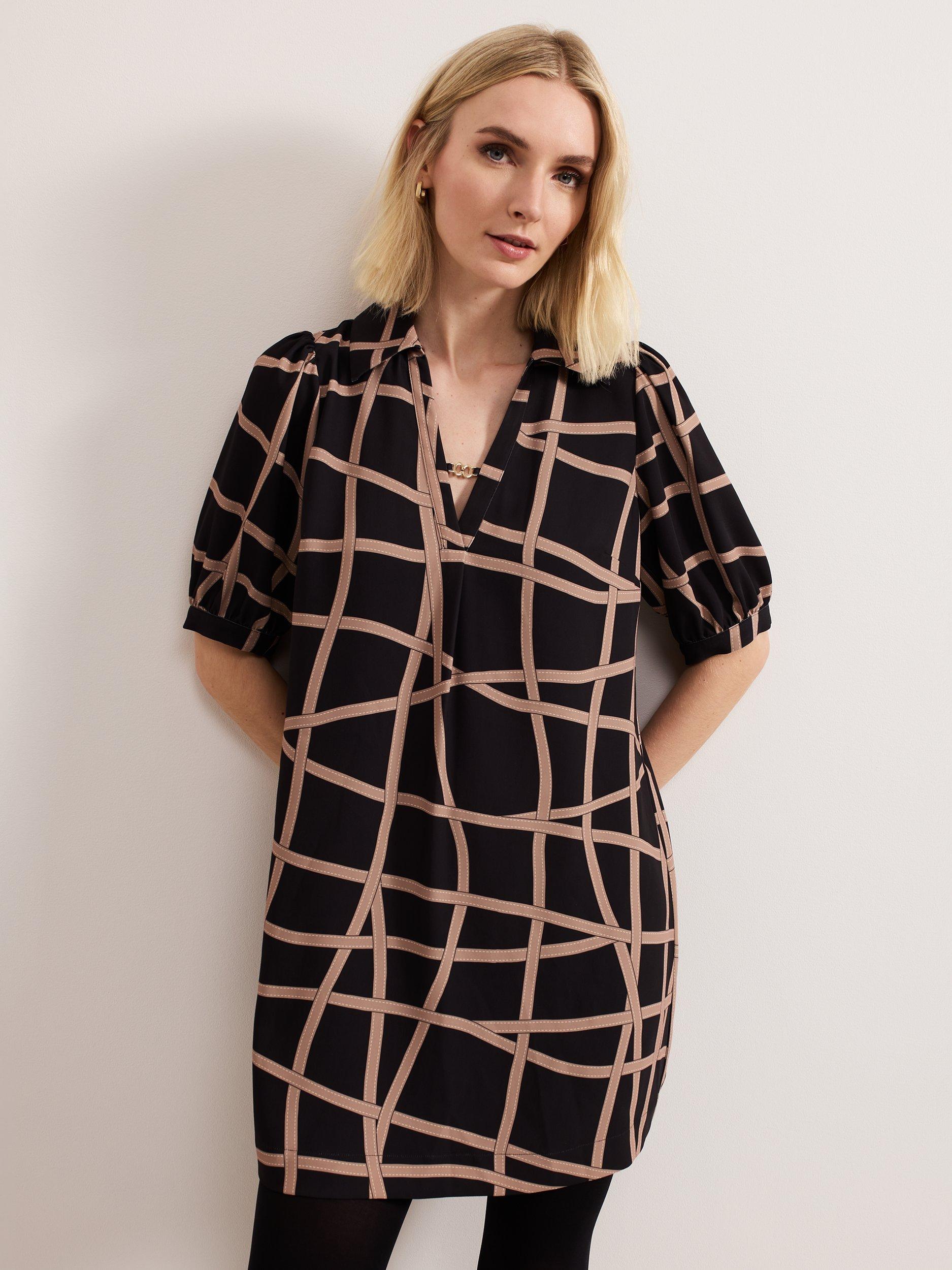 The Darlia dress is the perfect work-to-weekend style. With a contemporary ribbon print, this tunic-style mini dress is finished with feminine puff sleeves and a gold chain detail at the neckline. We style ours with a pair of black boots for a casual yet elevated style.