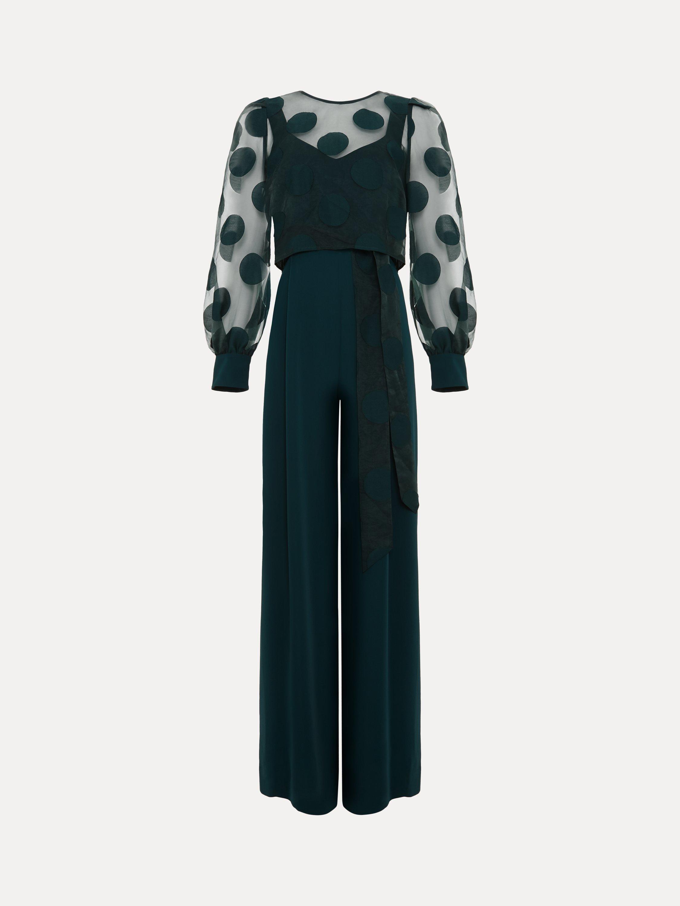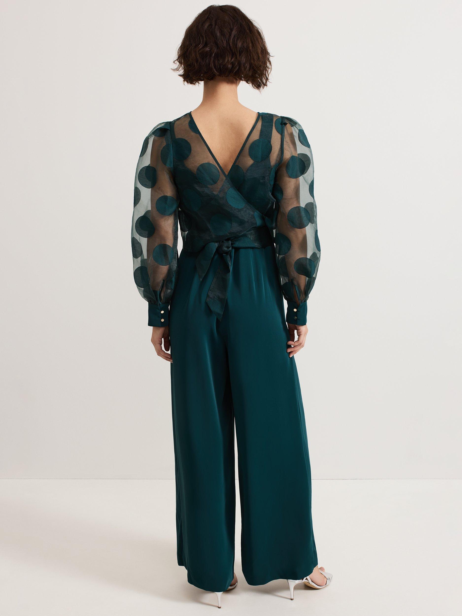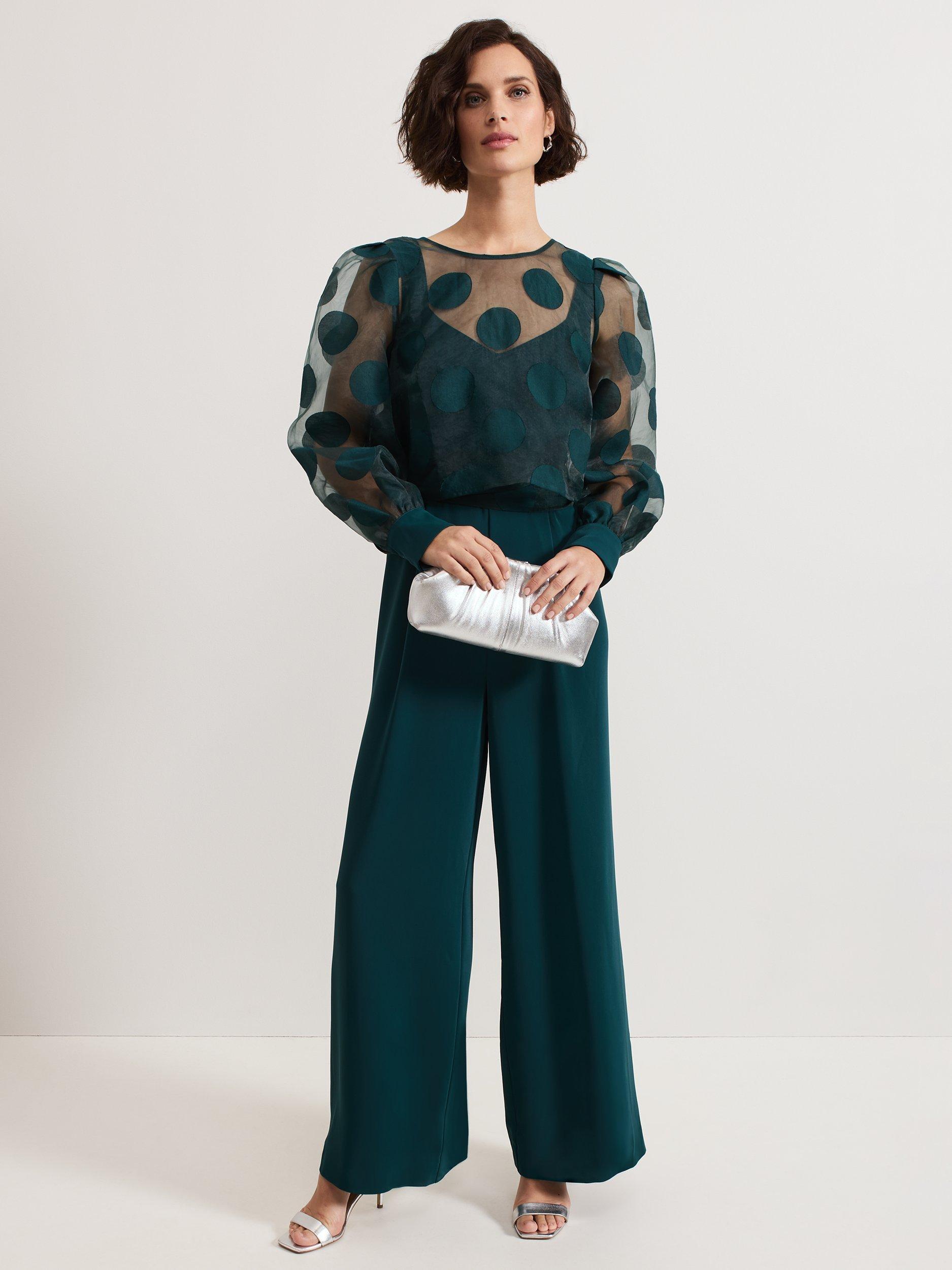 The ultimate in occasionwear. Made in a smooth fabric, this jumpsuit from Phase Eight gives you the versatility of two looks in one. Featuring a v-neck with wide straps, the jumpsuit falls to a stunning wide leg silhouette. Choose to wear as is or layer with the sheer wrap blouse on top in a print that we're just a little bit dotty about.