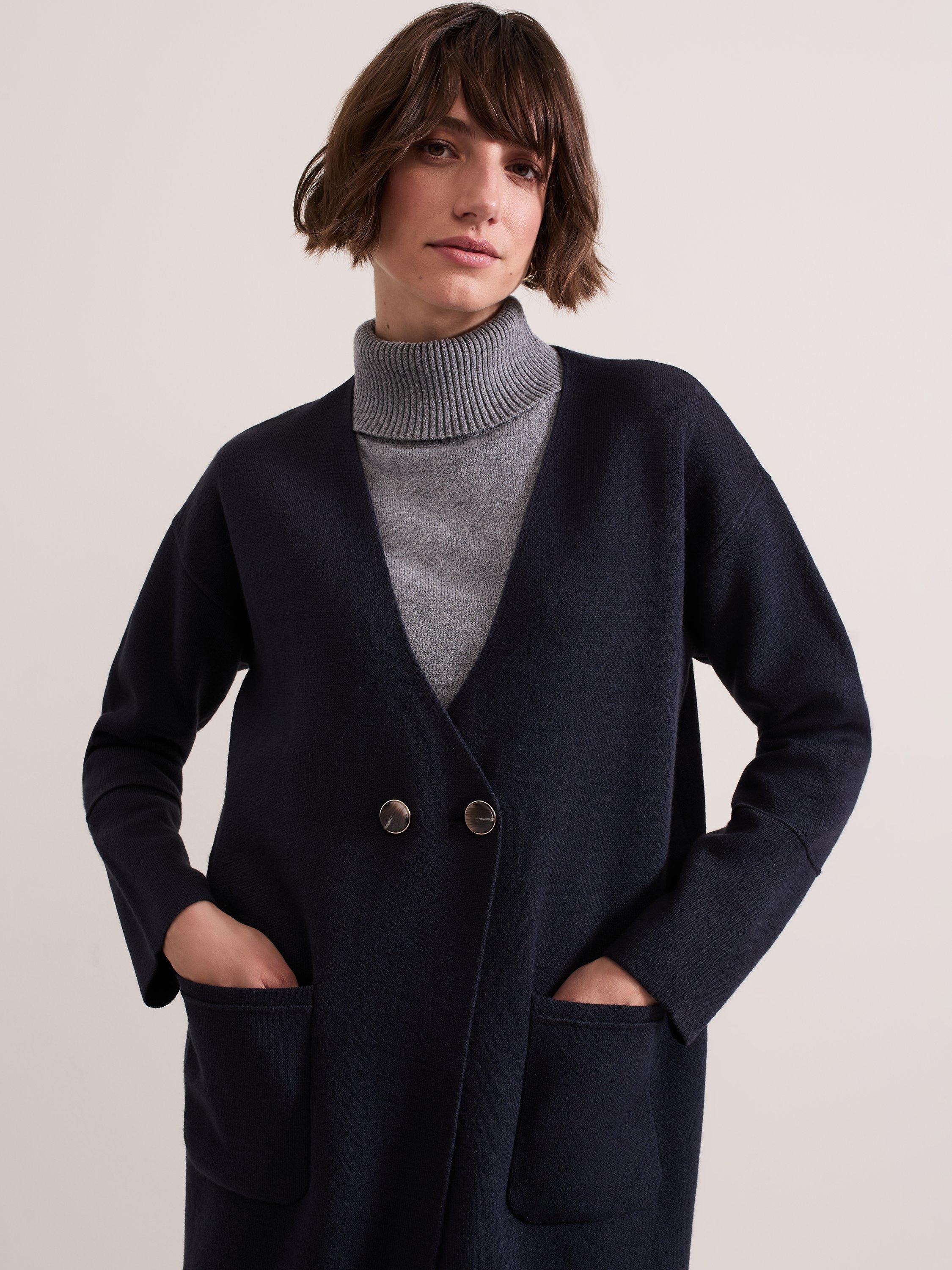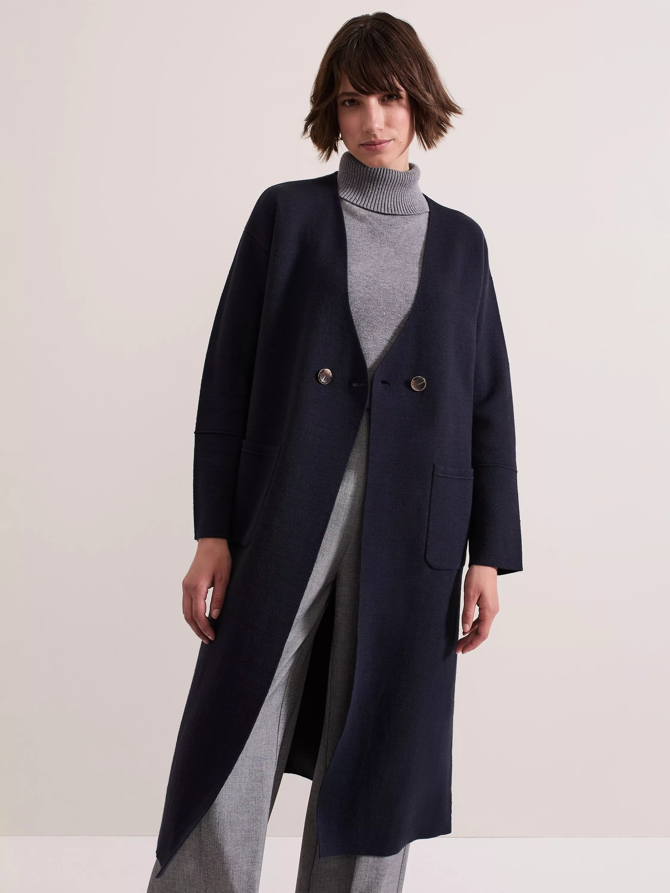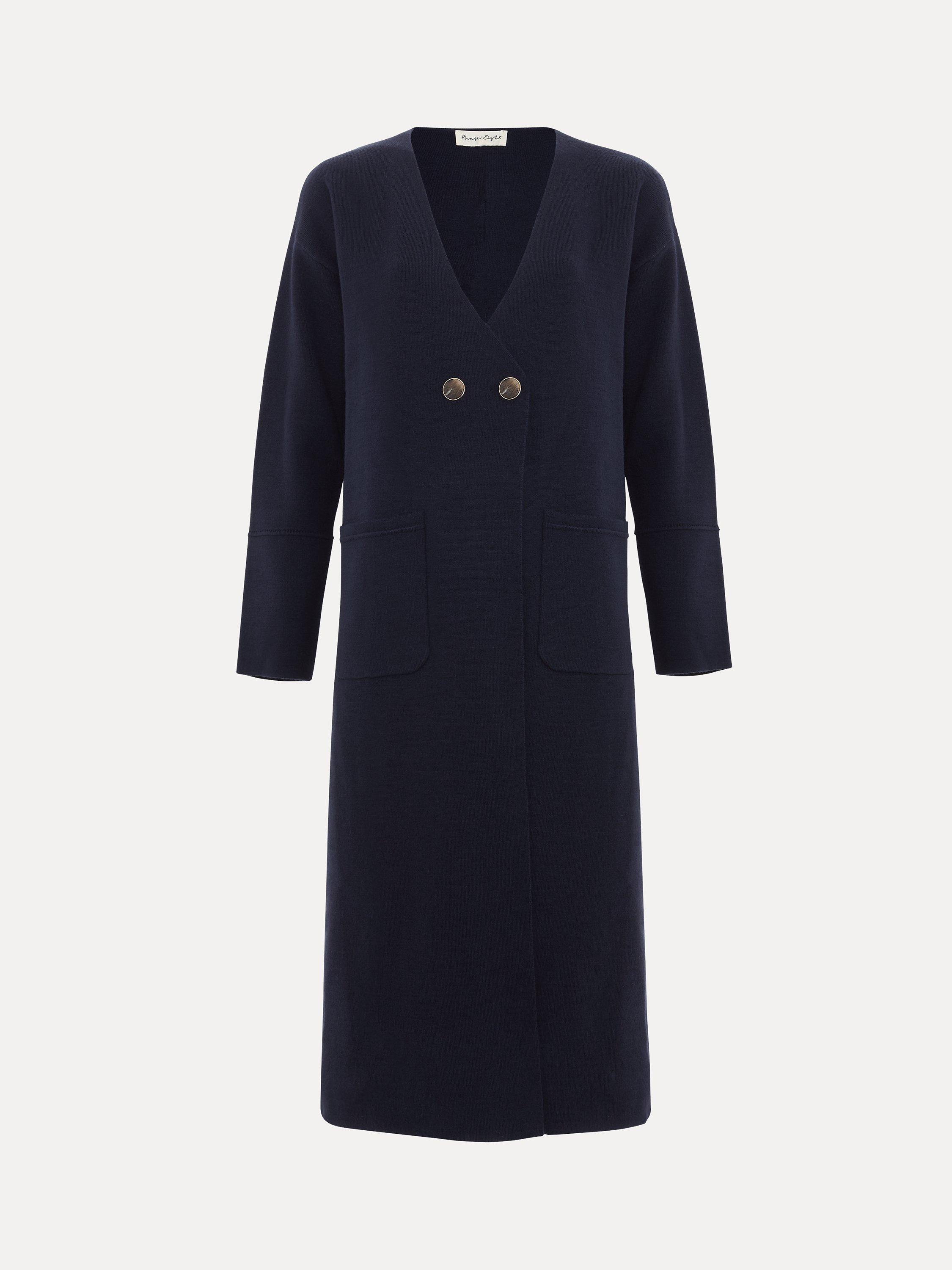 Designed in a classic shade our double breasted Destiny coatigan is cut to a longline silhouette and features large statement pockets. Tortoiseshell and gold button detailing, structured seams and the extended split hem creates the perfect finish.