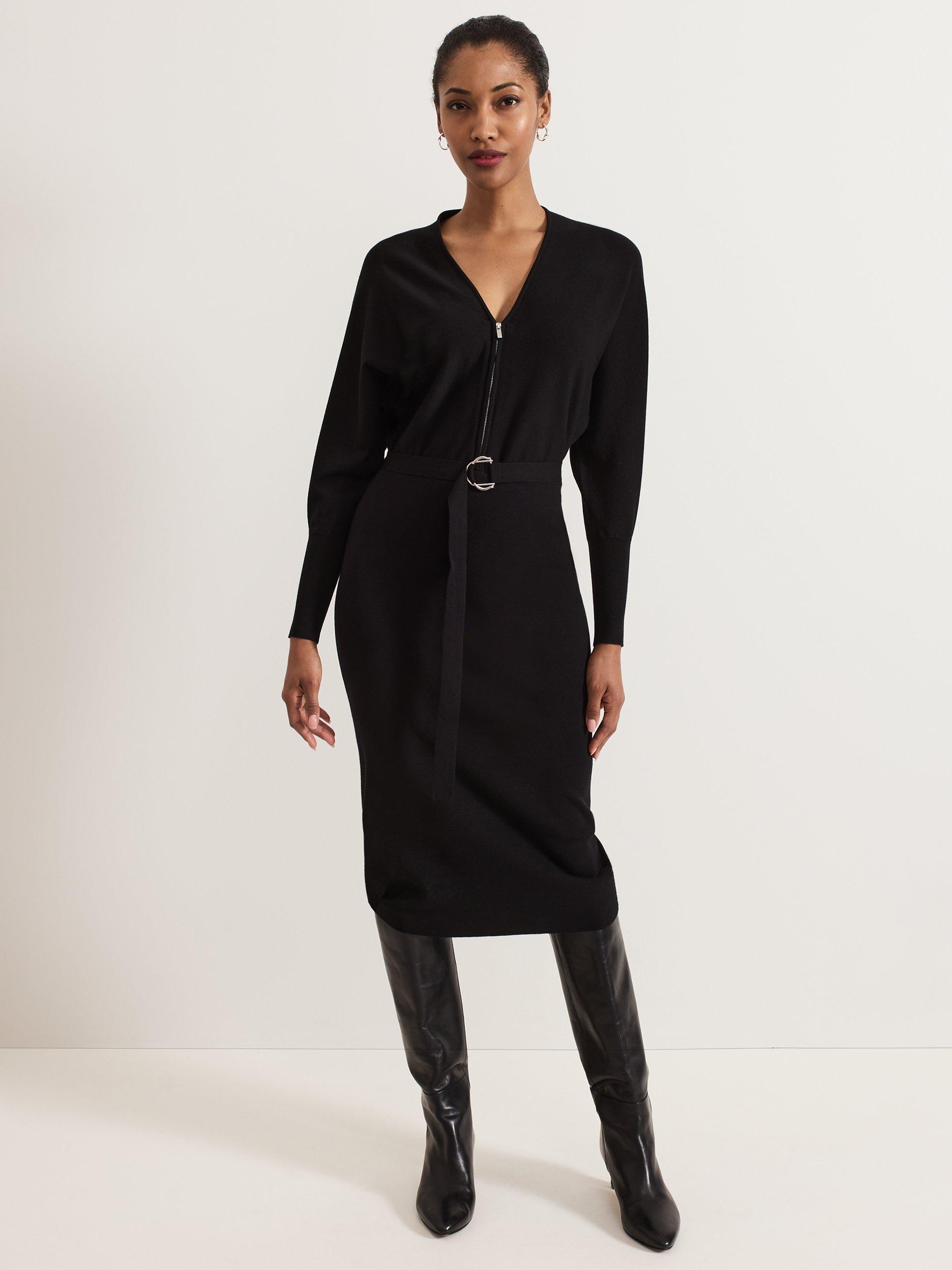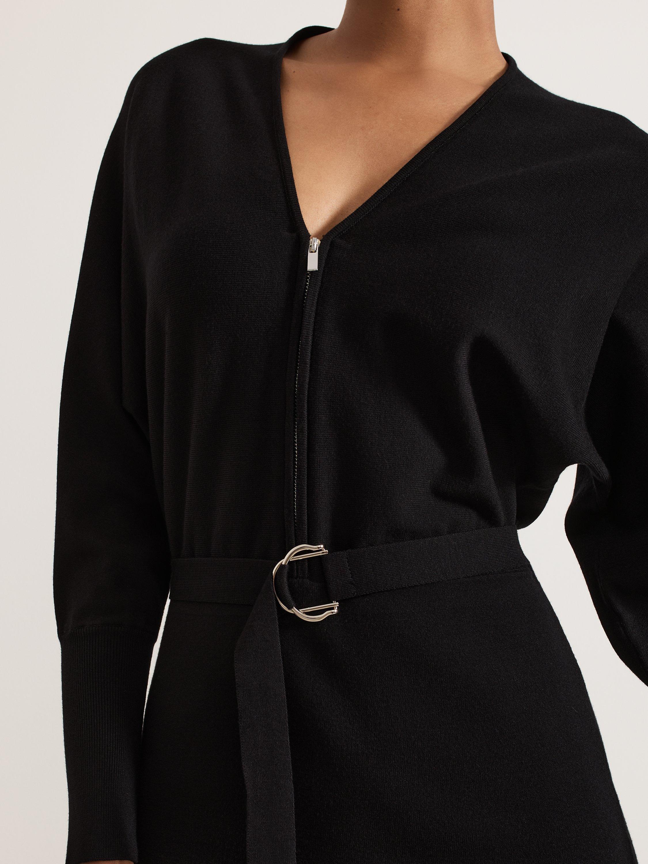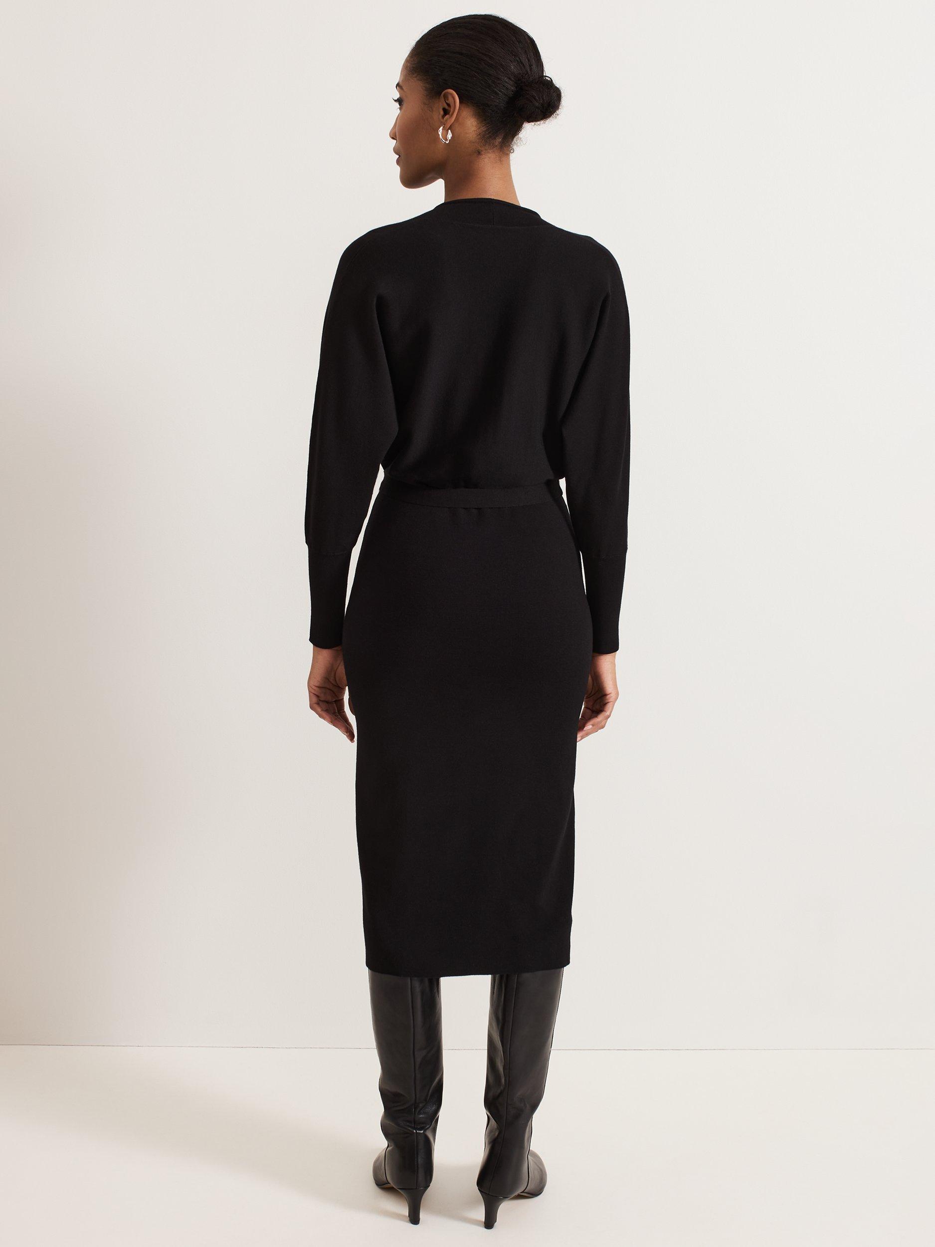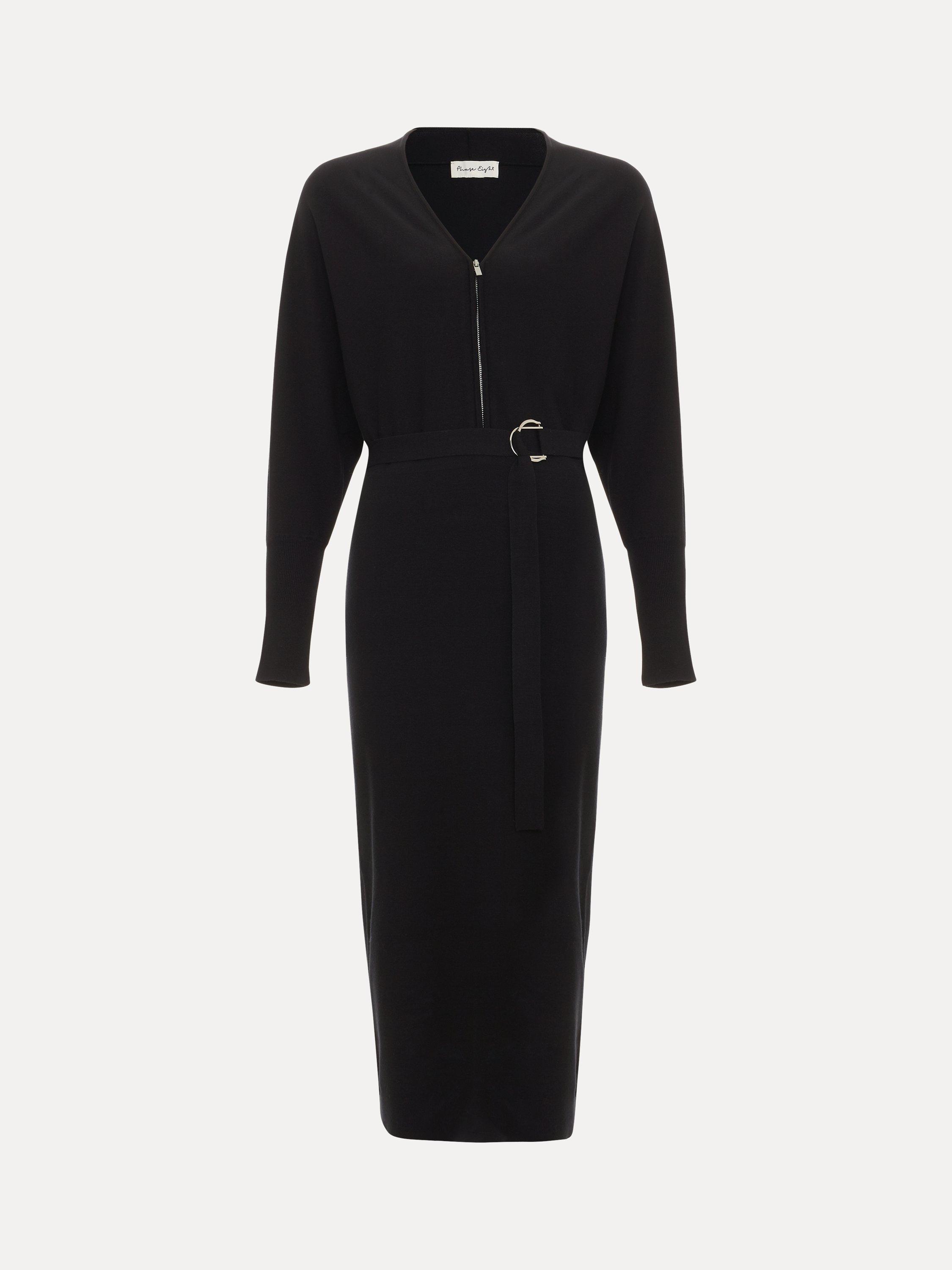 Every wardrobe needs a knitted dress. This knitted dress has a figure-enhancing column silhouette. The feminine V-neckline is framed by a classic collar making it the perfect choice for work or match your accessories to the gold popper detailing to take this look into the evening.