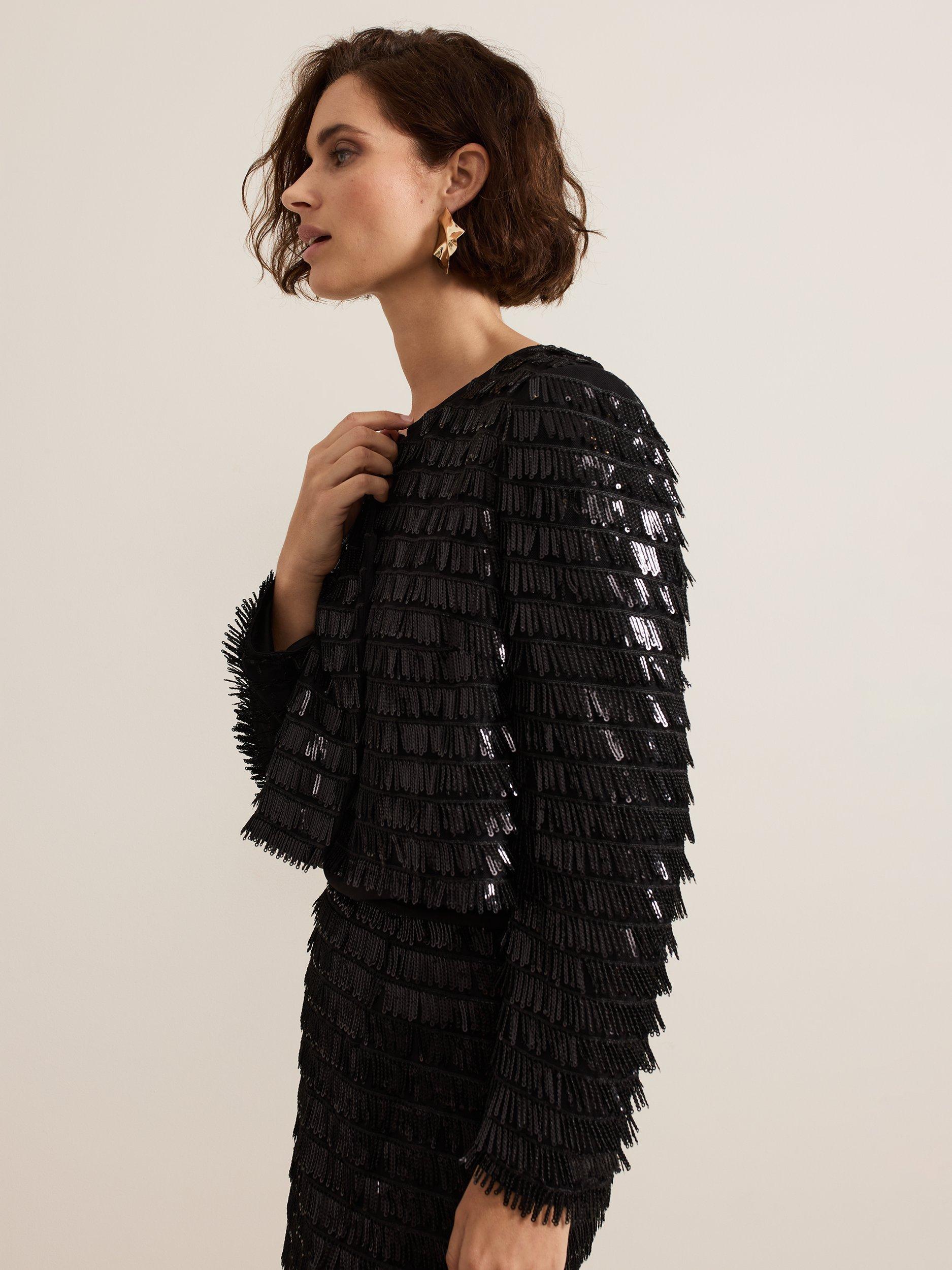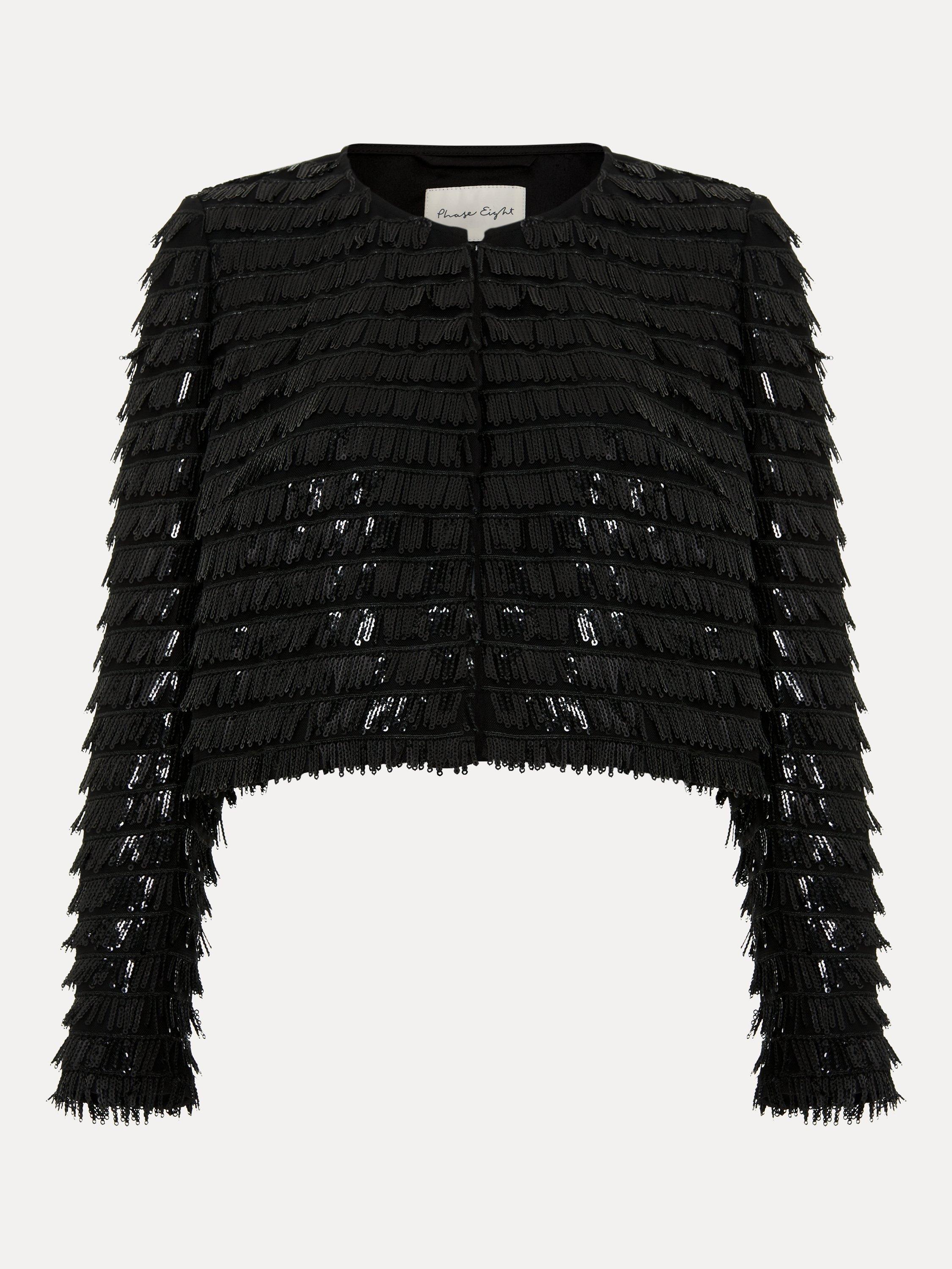 Meet your new statement jacket. Designed in classic black, the Dolly jacket from Phase Eight features sequin tassels throughout and is cut to a cropped silhouette to create a modern feminine style. Pair with the matching Dolly skirt for a coordinated look.