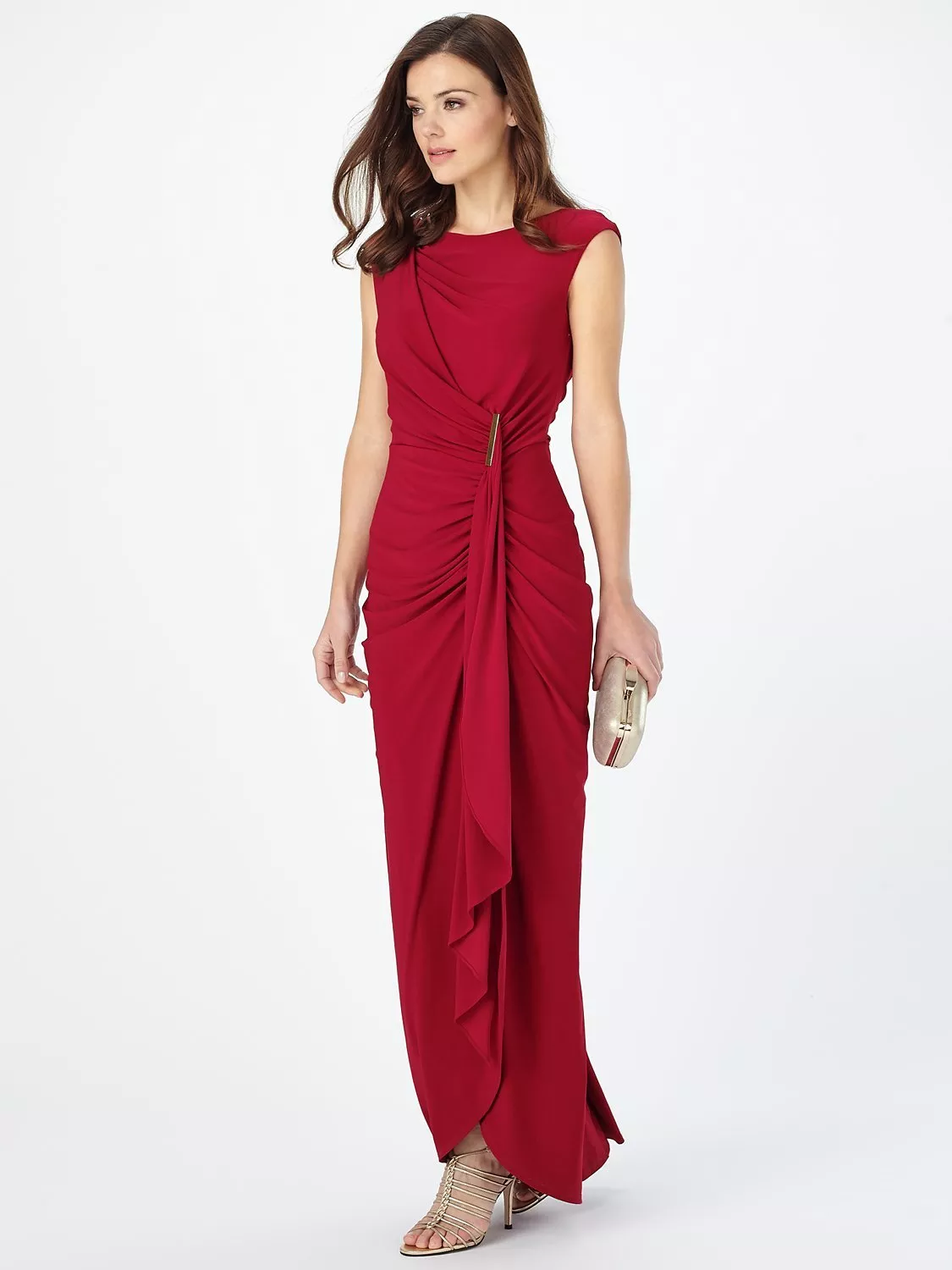 Phase Eight's Donna Dress is ideal for the party season.Crafted from fine flowing fabrics, this occasion piece features a gathered and ruched effect at one side, topped with a gold-coloured metal bar. Styled with capped sleeves and a waterfall hem for a lush feel. The ruched effect is repeated at the back, surrounding the concealed centre back zip for a seductive finish.