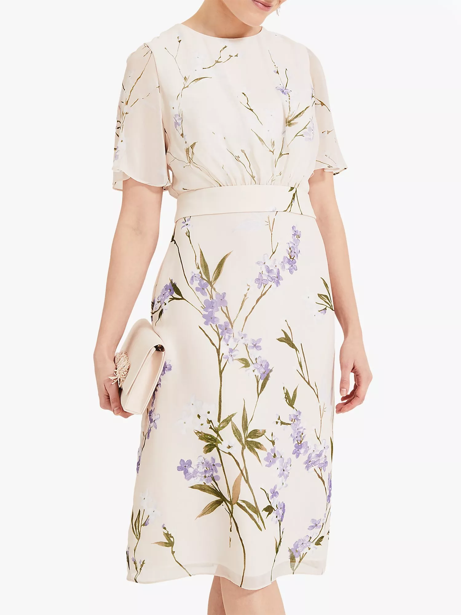 A romantic floral occasion piece from Phase Eight with soft, semi-sheer sleeves that fall into an elegant cape-style, this elegant dress falls below the knee and is finished with a matching waistband and a concealed centre back zip for a sleek finish. Pair with a clutch and strappy block heels.